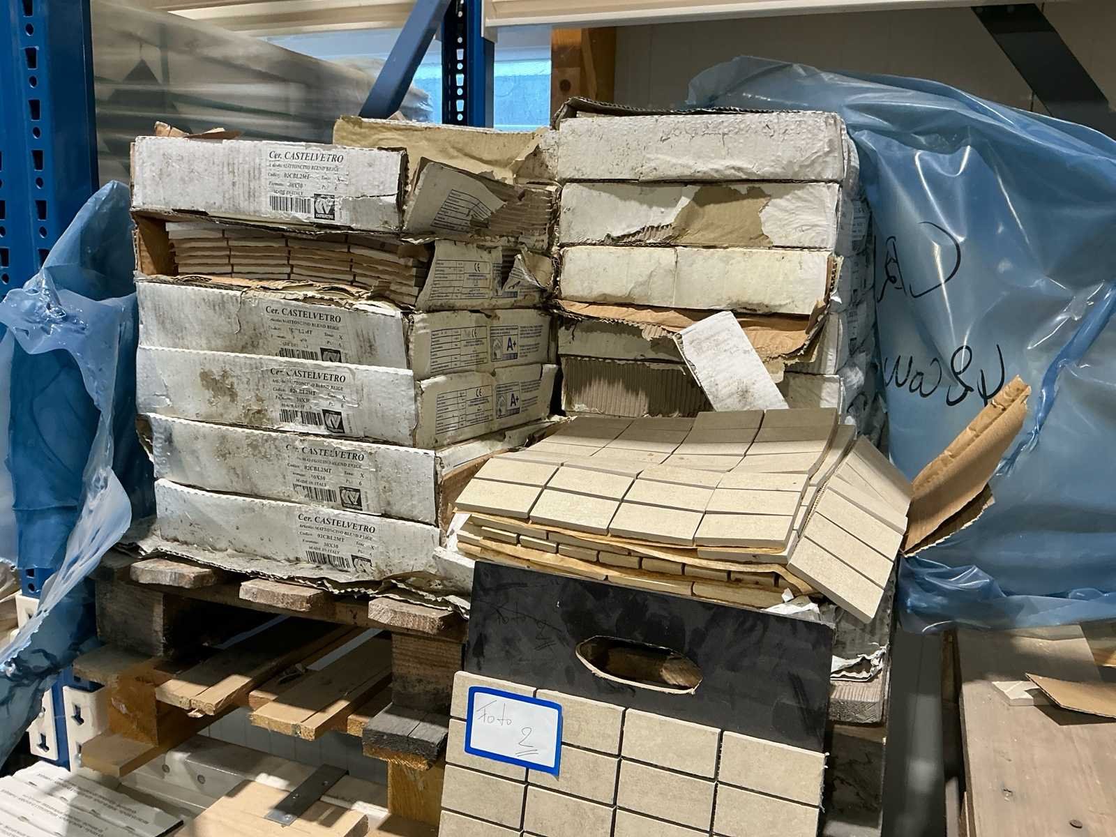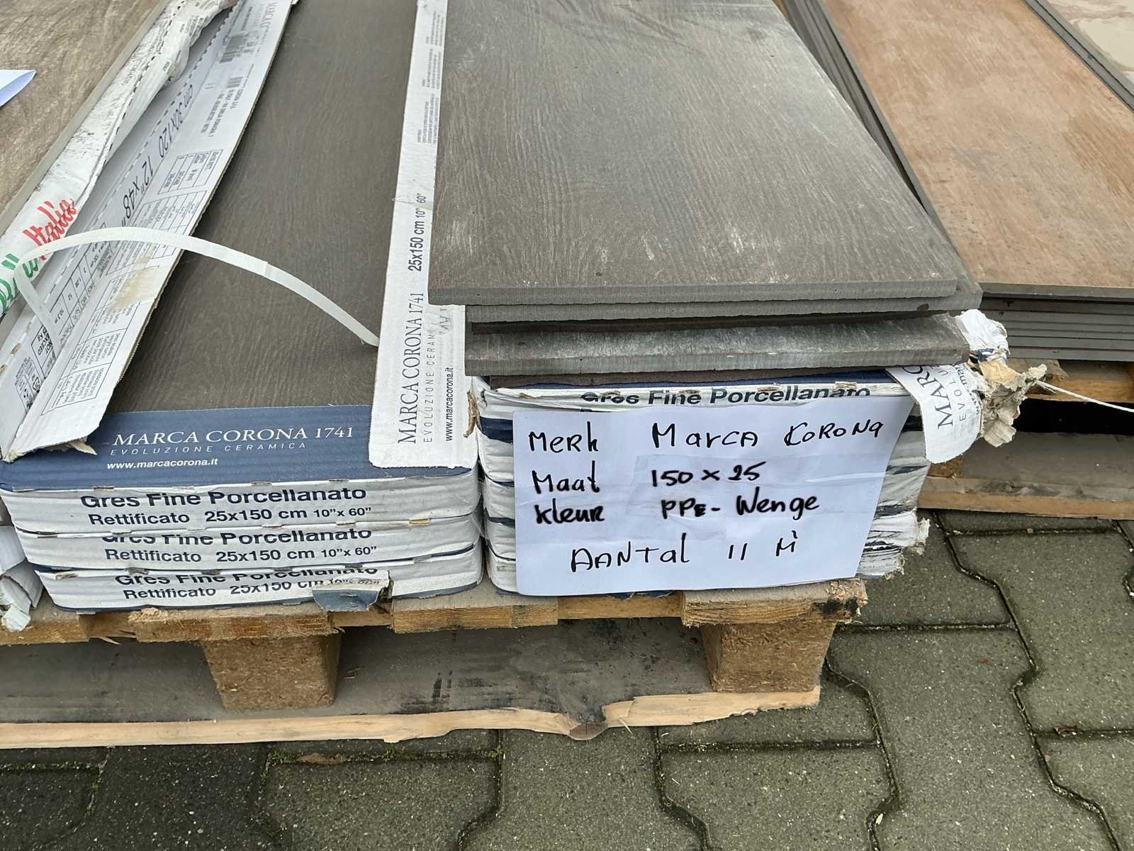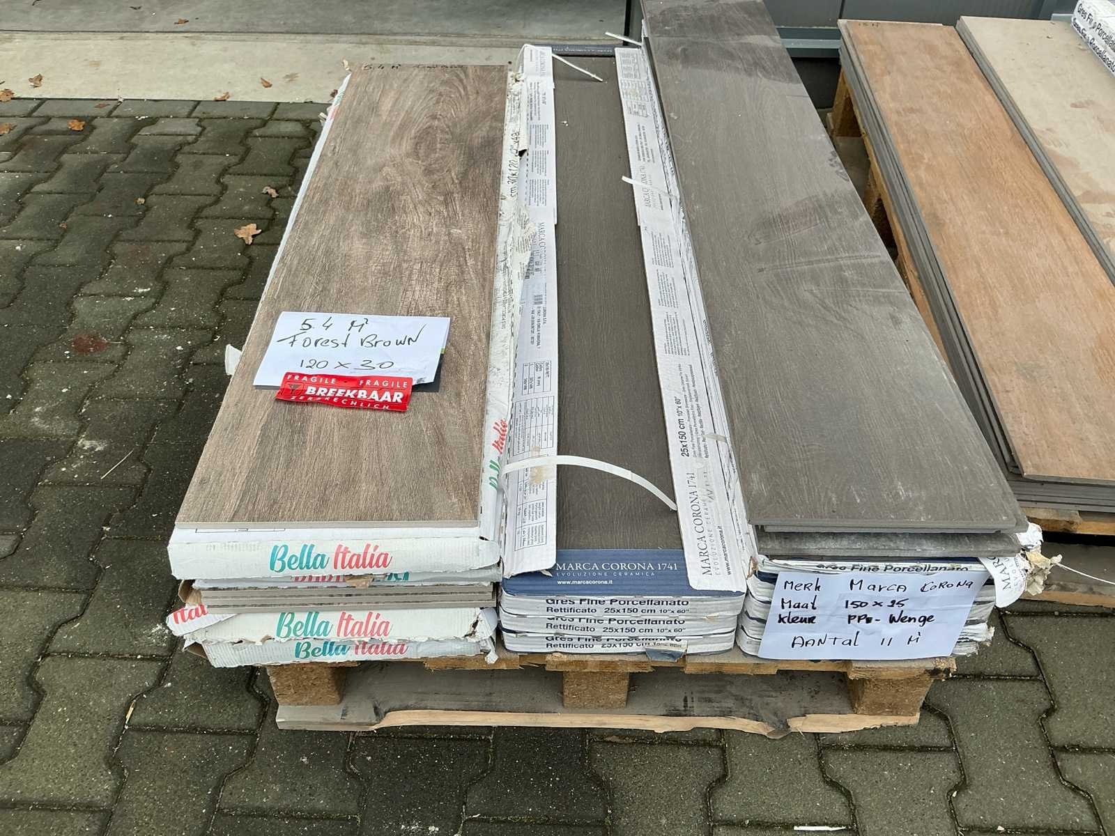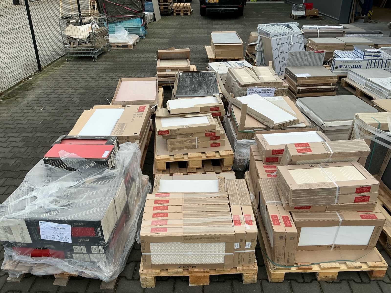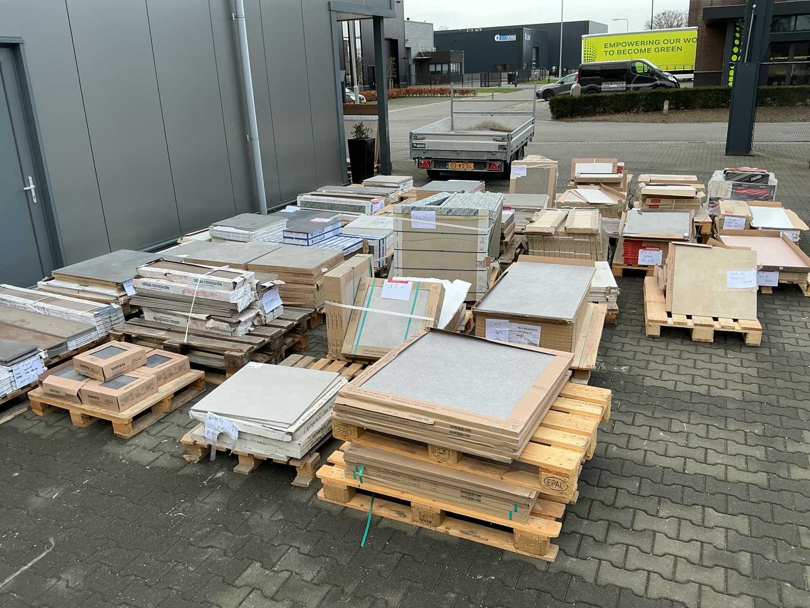 Bestaat uit: 40 pallets rest partij tegels, wand tegels, vloertegels, natuursteen-look, en hout-look, diverse afmetingen, open en nieuwe verpakkingen, alles in een koop. Nee Merk: Diversen tegels