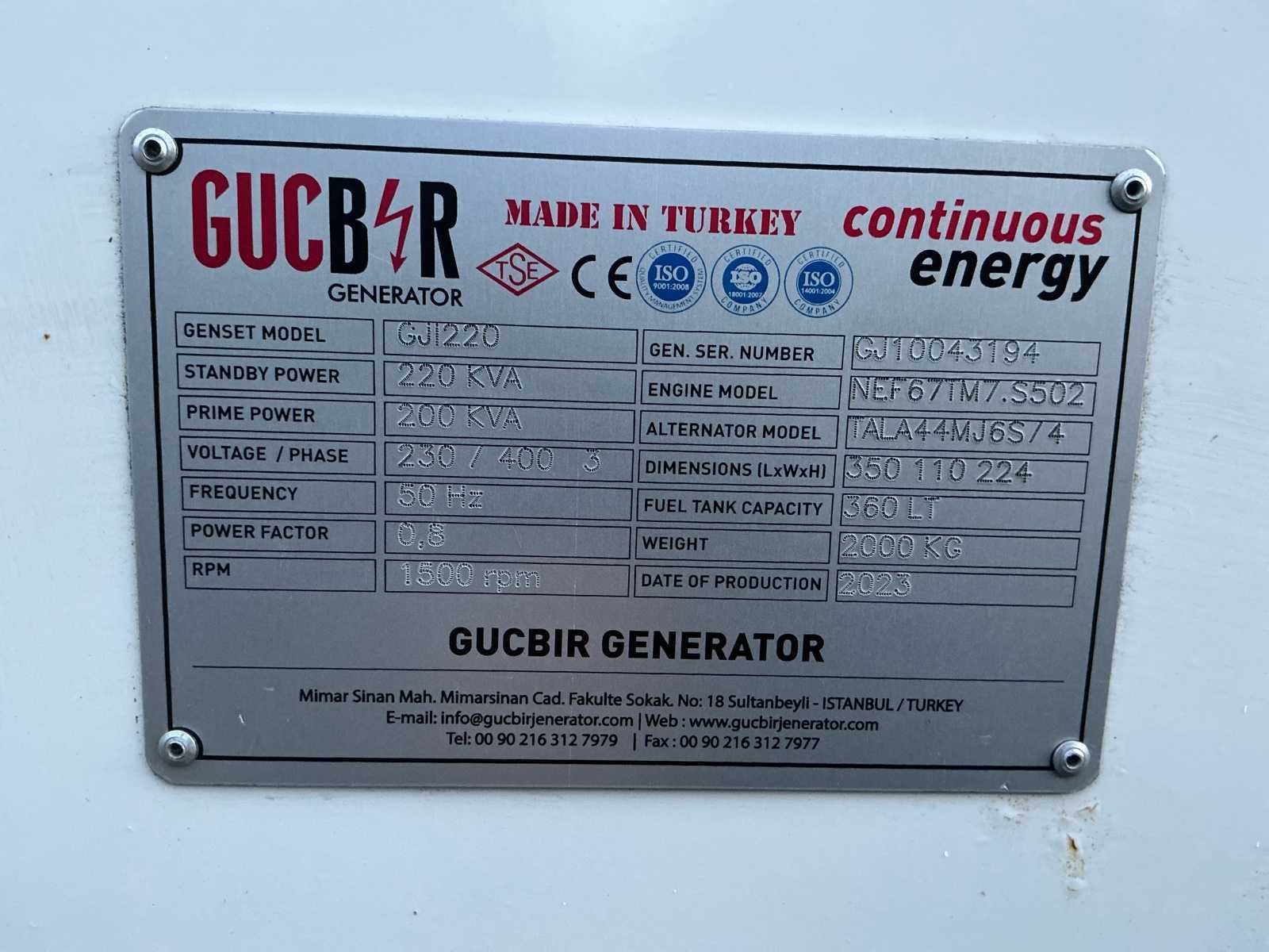 WATER COOLED THREE PHASES 50 HZ DIESEL generator, type GI220, uitgerust met IVECO NEF67TM7 motor en Maranello M220 alternator. Geproduceerd volgens ISO 9001 kwaliteitsnormering en voorzien van EC-markering conform 2006/42/EC – 2014/30/EU – 2014/35/EU – 2000/14/EC – 97/68/EC. Prime Power 200 kW / 220 kVA en Standby Power 176 kW, 1500 rpm, 400/230V, 0,8 Cos Phi. Motor is 4-takt diesel, turbocharged en aftercooled, met 6 cilinders, boring 104 mm, slag 132 mm en 6,7 liter motorinhoud. Brandstofverbruik: 15 l/h bij 50% load, 17,2 l/h bij 80% load, 42 l/h bij 100% load en 47,5 l/h bij standby. Oliecapaciteit 15 liter en koelvloeistofinhoud 12 liter, mechanische governor. Alternator voorzien van automatische spanningsregeling (AVR) type SX460, 12-draads, 2/3 winding, IP23 isolatieklasse H. G2 load acceptance conform ISO 8528-5:2013 en referentiecondities volgens ISO 8528-1:2005. Afmetingen open set: 2600×1100×1900 mm, gewicht 370 kg, brandstoftank 370 liter. Afmetingen canopied: 3500×1100×2200 mm, gewicht 370 kg, brandstoftank 370 liter. Geluidsarme canopy met gegalvaniseerd staal, poedercoating, roestvrijstalen scharnieren, noodstop en hijspunten. Uitgerust met DeepSea 7320 of ComAp AMF9/AMF25 besturingseenheid. Nee Merk: GUCBIR Type: GJI220 Bouwjaar: 2023 Serienummer: GJ10043194 Capaciteit.: 220kVA Aansluiting: 400V Motor merk: FPT (Iveco) Motorcapaciteit: 195kW Generator merk: Maranello Generator type: M220 Generator capaciteit: 160A Afgelezen urenstand: 0 Machinegewicht: 2000kg Totale afmeting L: 2600mm Totale afmeting Breedte: 1100mm Totale afmeting Hoogte: 1900mm GS Code: 85021310 Leveringsvoorwaarden: Geladen op vrachtwagen