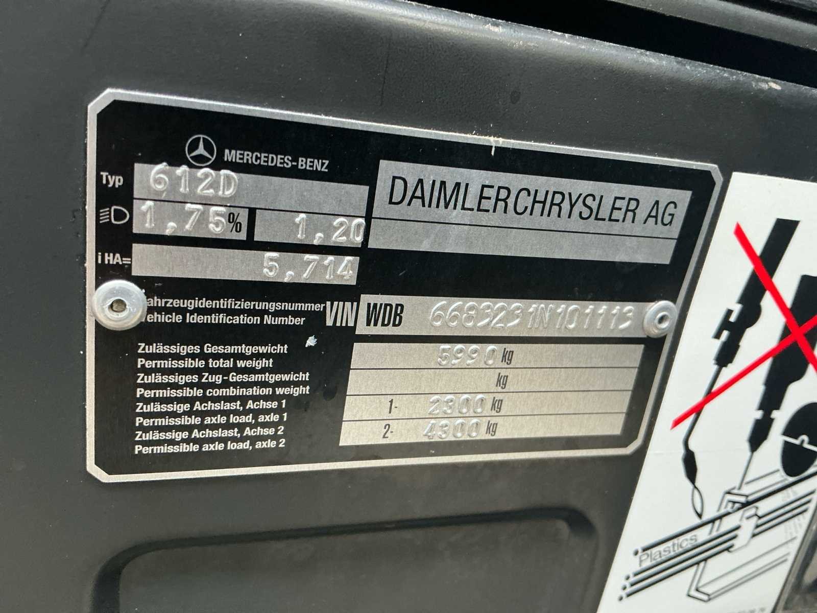 Voorzien van: 120pk, Oprijwagen, lier, alarmlichten, aluminium/laadvloer met oprijplaten, 2 stoelen lucht geveerd, trekhaak, Toegestaan totaalgewicht: 5.990 kg, Toegestane aslasten: voor 2.300 kg, achter 4.800 kg Nee Kenteken: BL-HD-93 Merk: Mercedes-benz Type: 612D Bouwjaar: 2001 Chassisnummer VIN: 6683231N101113 Cilinderinhoud: 2900cc Kilometerstand bij opname: 429166km APK vervaldatum: 2025-01-14 Datum eerste toelating: 2001-07-16 Datum eerste toelating (NL): 2001-07-16 Type transmissie: Handmatig Aantal assen: 2 Asconfiguratie: Dubbel lucht Fuel Type: Diesel Laadvermogen: 2515kg Aantal sleutels: 2 Emissieklasse: 3 Totale afmeting L: 7500mm Totale afmeting Breedte: 2350mm Totale afmeting Hoogte: 2360mm Afgelezen kilometerstand: 429166km Nationaliteit documenten: Nederlands Kentekenpapieren compleet?: true Aantal zitplaatsen: 2 Zelf rijdend exporteren: Mogelijk Handgeschakelde versnellingsbak: true