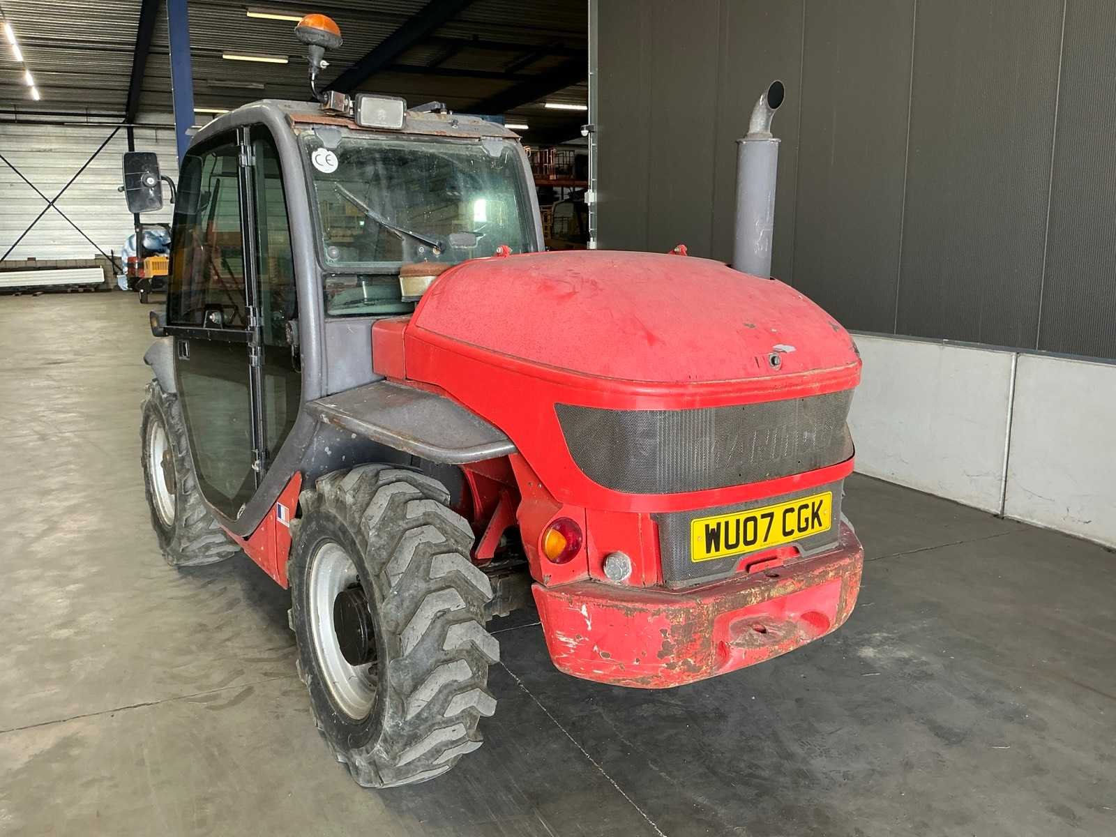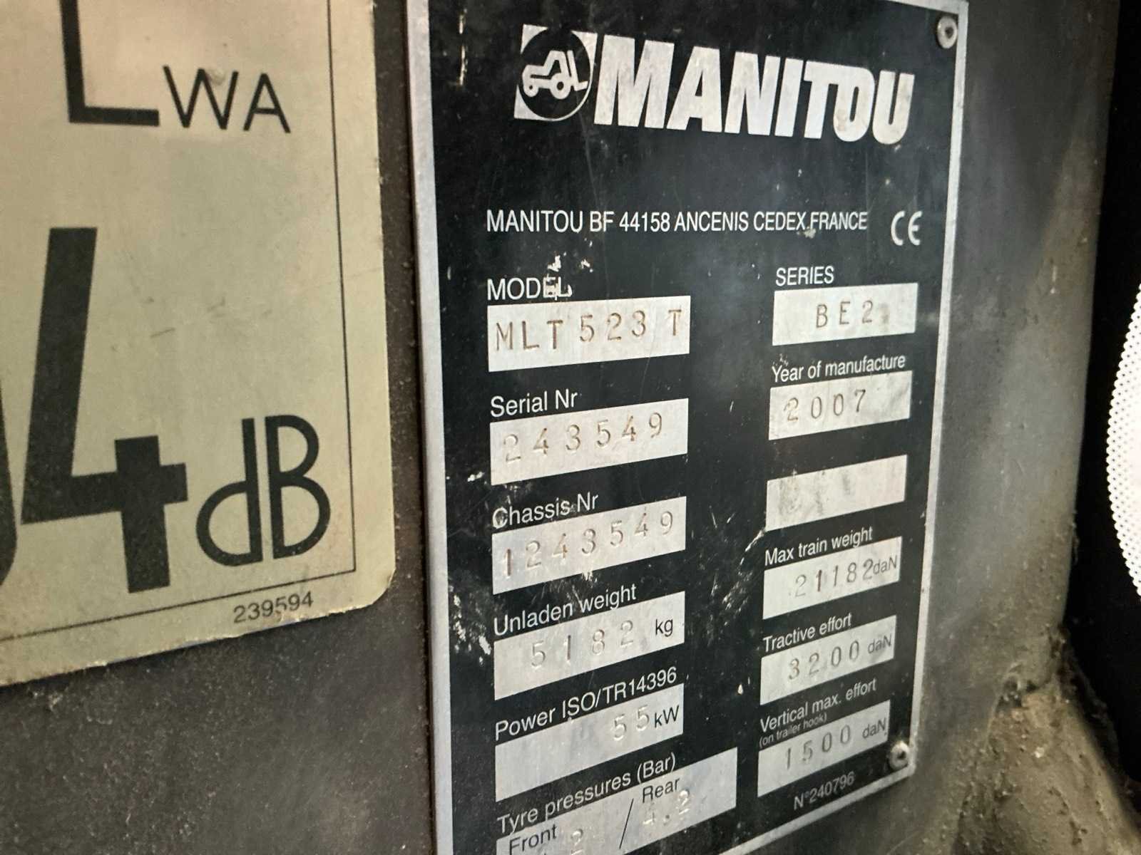Voorzien van: Manitou MLT 523 T,2,3 ton, hefhoogte circa 5 meter, reikwijdte 2,83 meter, Perkins turbodieselmotor (73,8 pk),hydrostatische transmissie, vierwielaandrijving en 3 stuurmodi, eigengewicht van circa 5250 kg, lasten tot 2300 kg, op maximale hoogte of 1150 kg op maximale reikwijdte, hefhoogte: circa 4,79m, voorwaartse reikwijdte: circa 2,83 meter, vierwielaandrijving, besturing: 3 standen (2-wiel, 4-wiel, krab), bedrijfsgewicht: ~5,18 ton, afmetingen: ~4,2 m lang, ~1,8 m breed, ~2,3 m hoog, mechanisch geveerde Grammer stoel, handrem, zonnescherm, ruitenwissers, aux functie voorzijde, pallet vorken, werklampen, machine rijdt, heft en functioneert goed. No Merk: Manitou Type: MLT 523 T Bouwjaar: 2007 Serienummer: 243549 Motorvermogen (kW): 55kW Hefvermogen: 2300kg Hefhoogte: 4970mm Cabine: true Vierwielaandrijving 4x4: true Lepellengte: 1200mm Luchtbanden: true Afgelezen urenstand: 4916 Eigen gewicht: 5180kg Totale afmeting L: 6800mm Totale afmeting Breedte: 1800mm Totale afmeting Hoogte: 2100mm