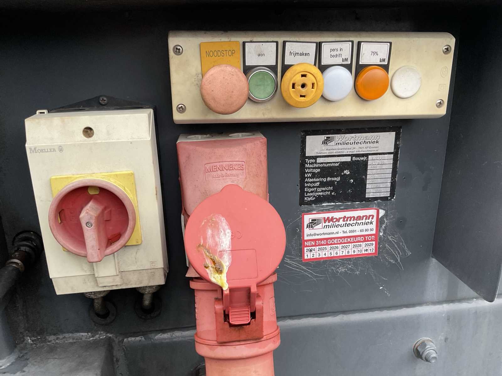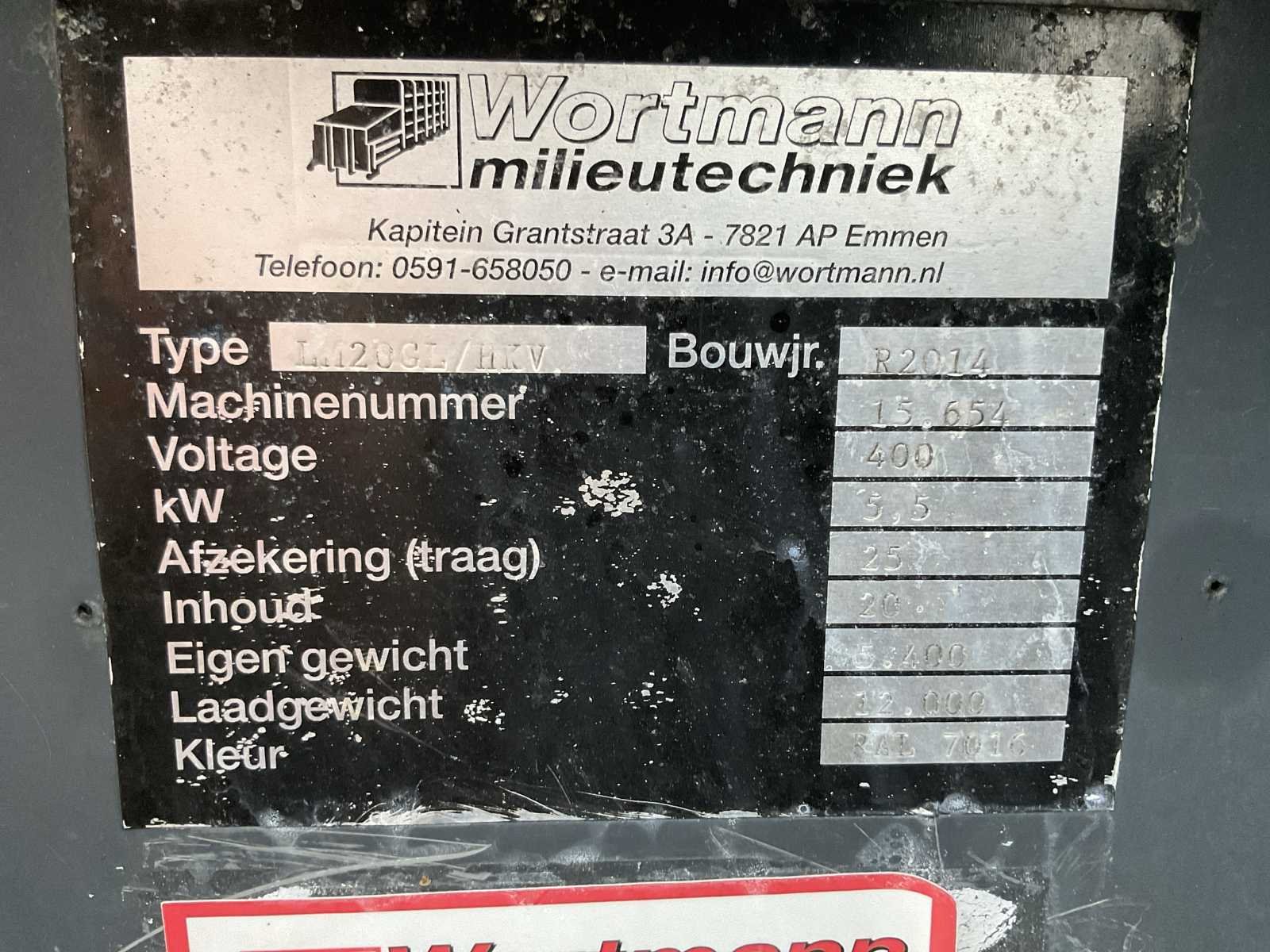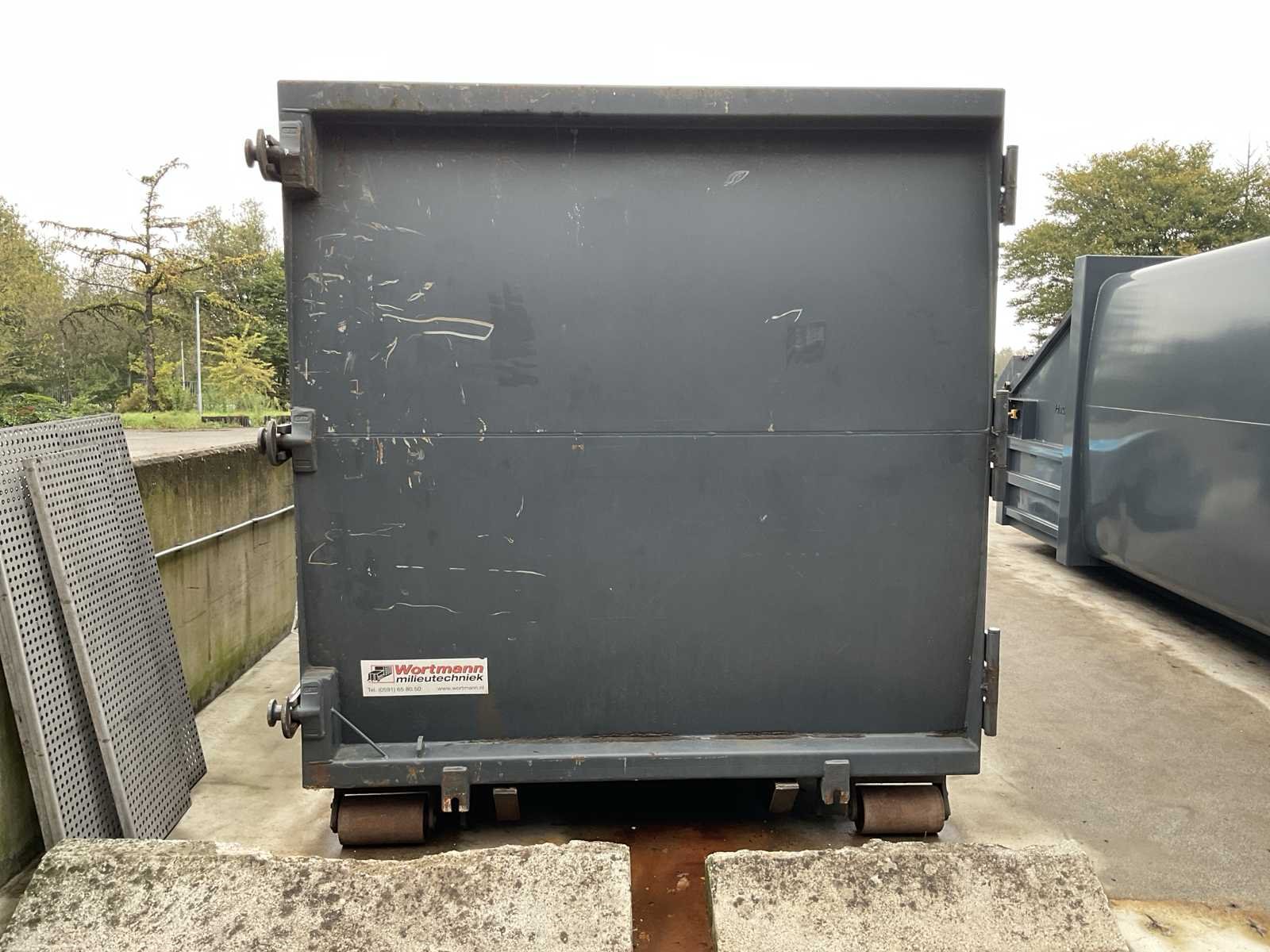 400 volt, 5,5kW, haakarm/ketting/kabel systeem, inhoud 20 kuub, frame breedte container 1250mm, haakafstand 600mm. Perscontainer is leeg en schoon van binnen. Nee Merk: Wortmann Product type: LM20GL/HKV Kleur: Grijs Lengte: 7000 Breedte: 2500 Hoogte: 2580 Materiaal: Metaal