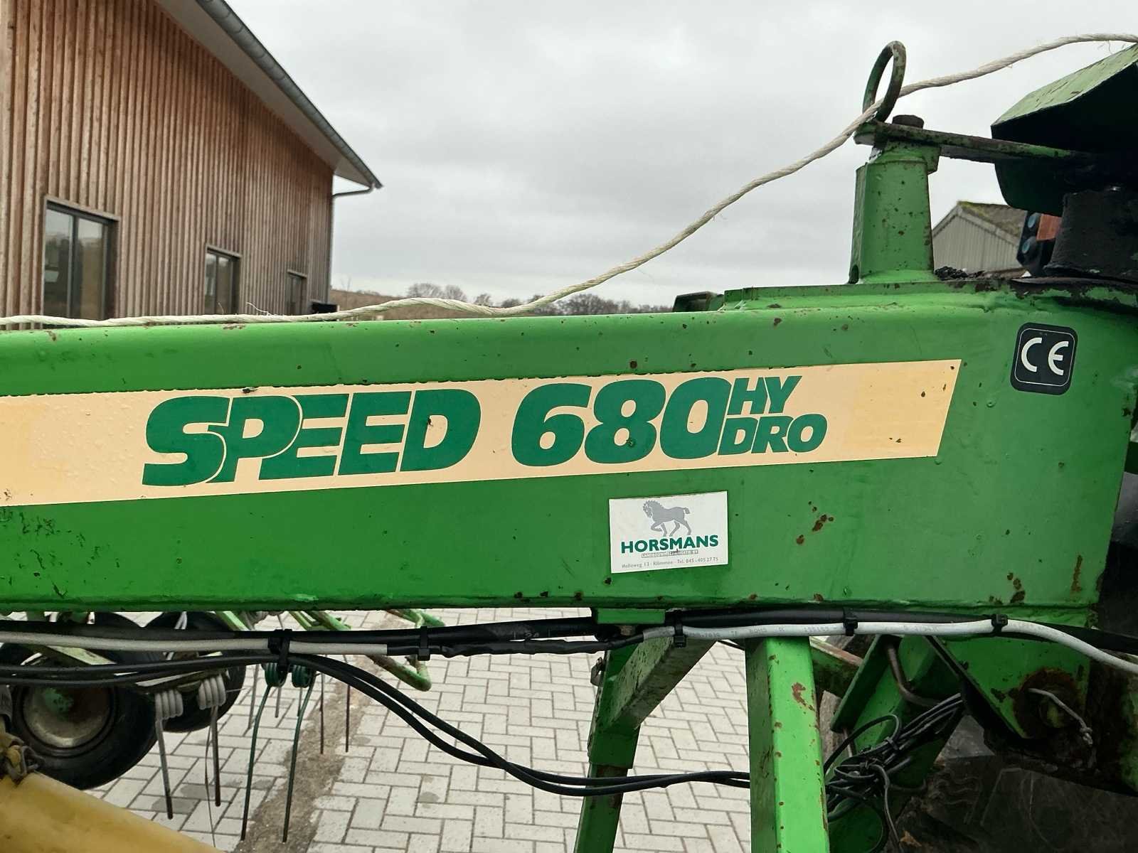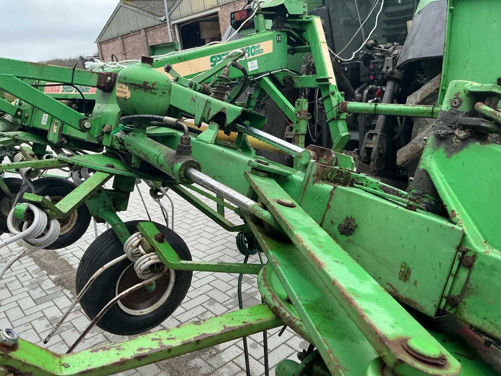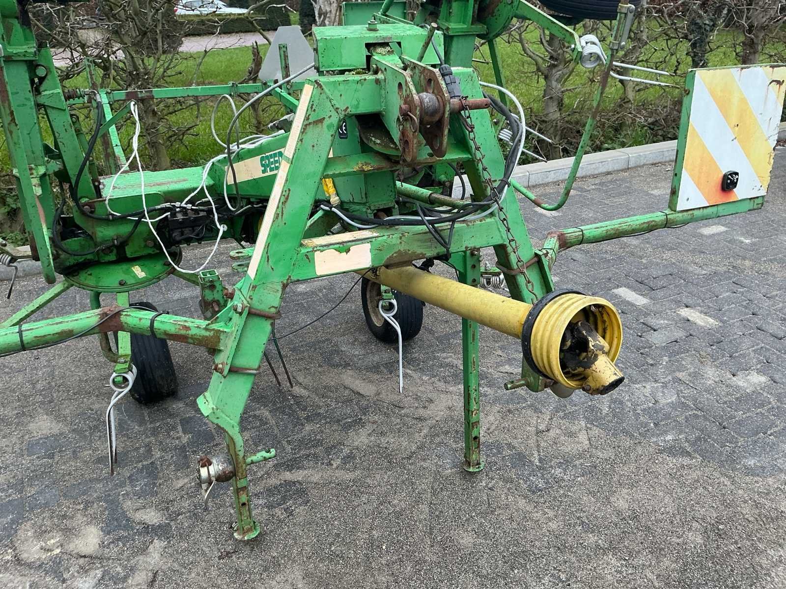 Voorzien van: Stoll Speed 680 Hydro, tweerotorige, hydraulisch inklapbare rotorhark met een werkbreedte van circa 6,8 meter, zes rotoren, bediening 1dubbelwerkend hydraulisch circuit, verlichting en waarschuwingsborden voor transport. Wat dit betekent: 6,8 m breedte: Bestrijkt een groot oppervlak voor efficiënt harken. 6 rotoren: Zorgt voor een goede materiaalstroom en nauwkeurige zwadenvorming. Hydraulisch inklapmechanisme: Maakt het mogelijk om de cabine eenvoudig in te klappen voor transport, zonder de tractor te verlaten. Nee Merk: Stoll Type: Speed 680 hydro Hydraulisch opklapbaar: true Eigen gewicht: 880kg Totale afmeting L: 3000mm Totale afmeting Breedte: 2600mm Totale afmeting Hoogte: 2900mm