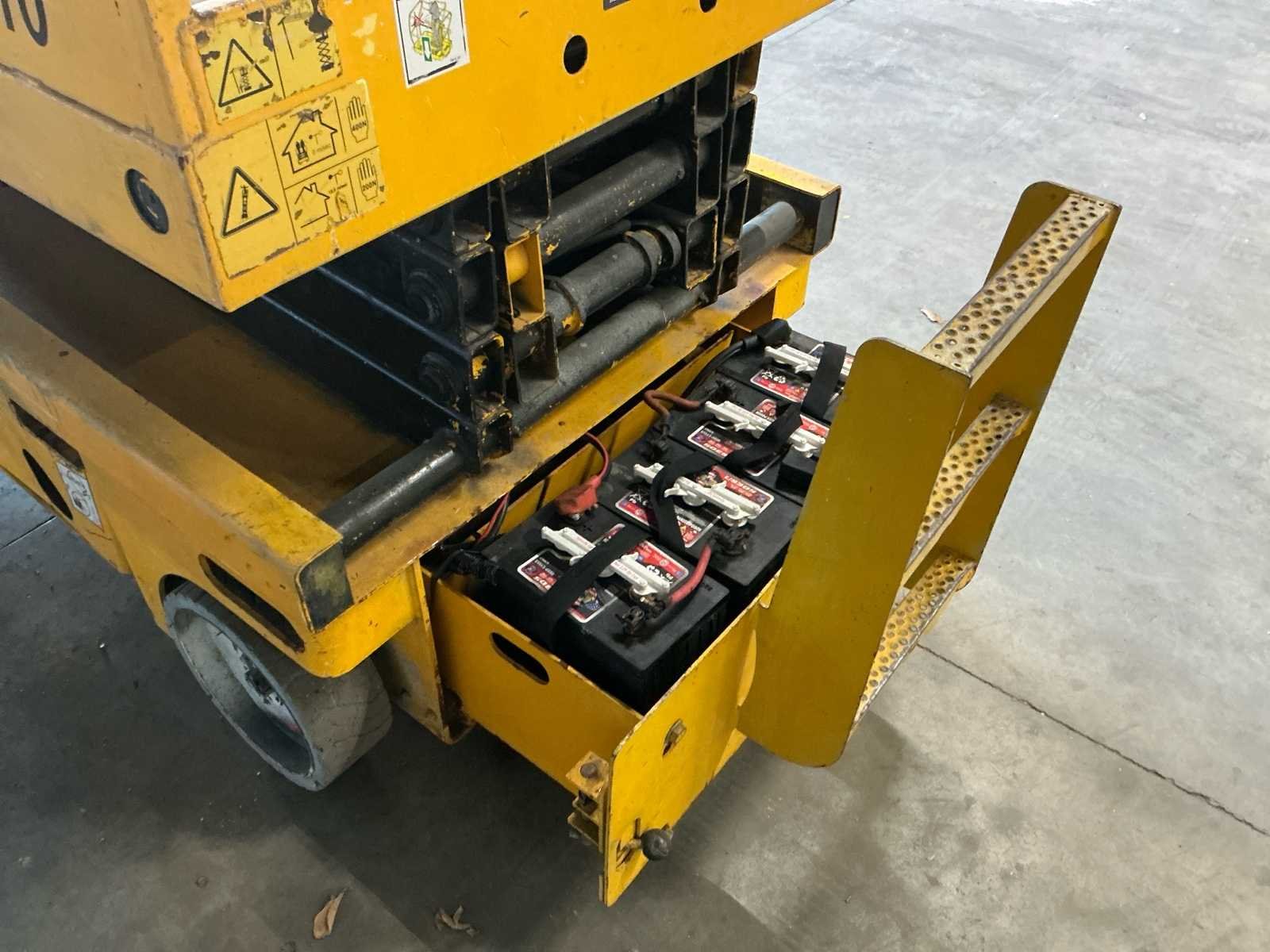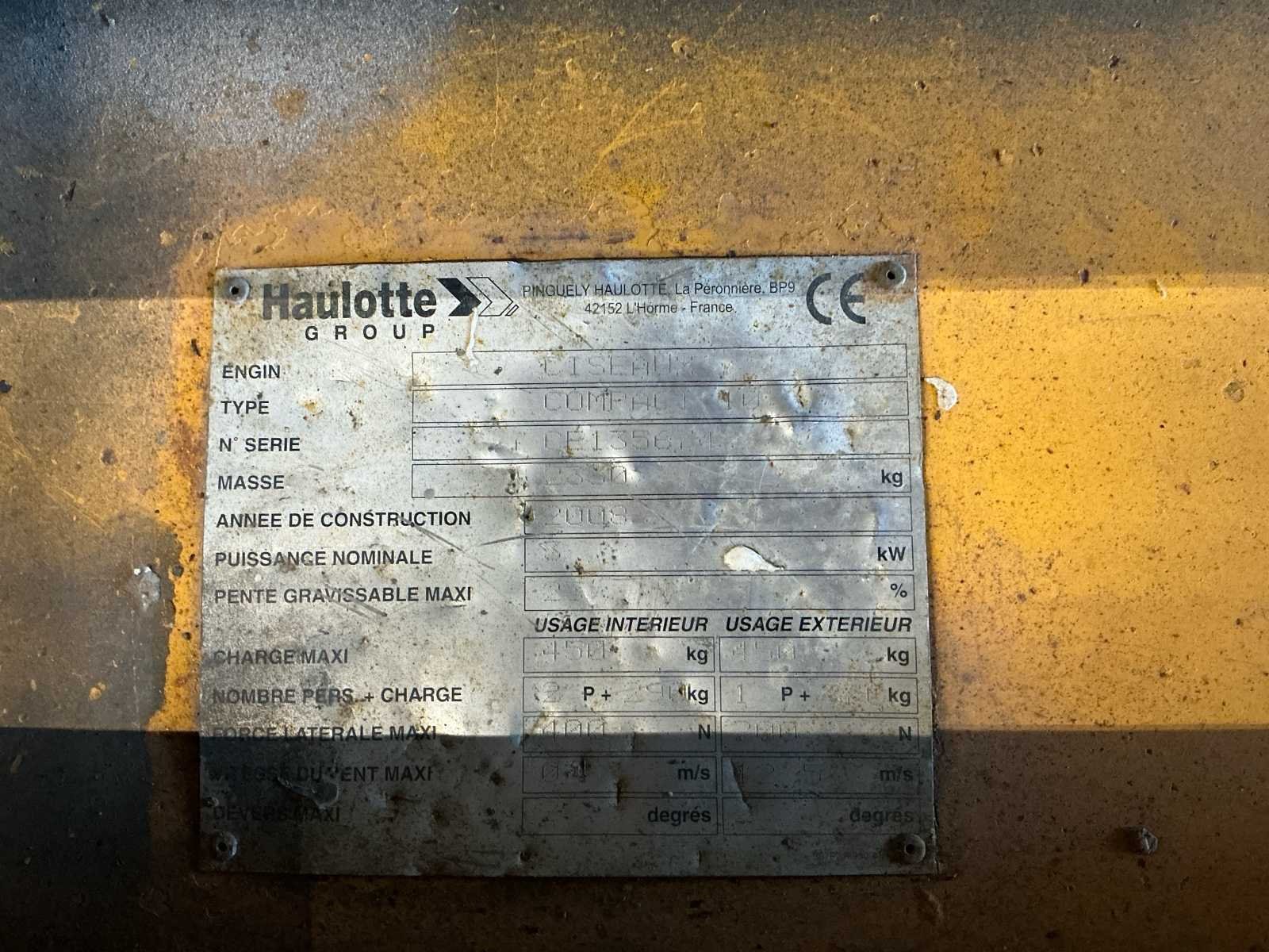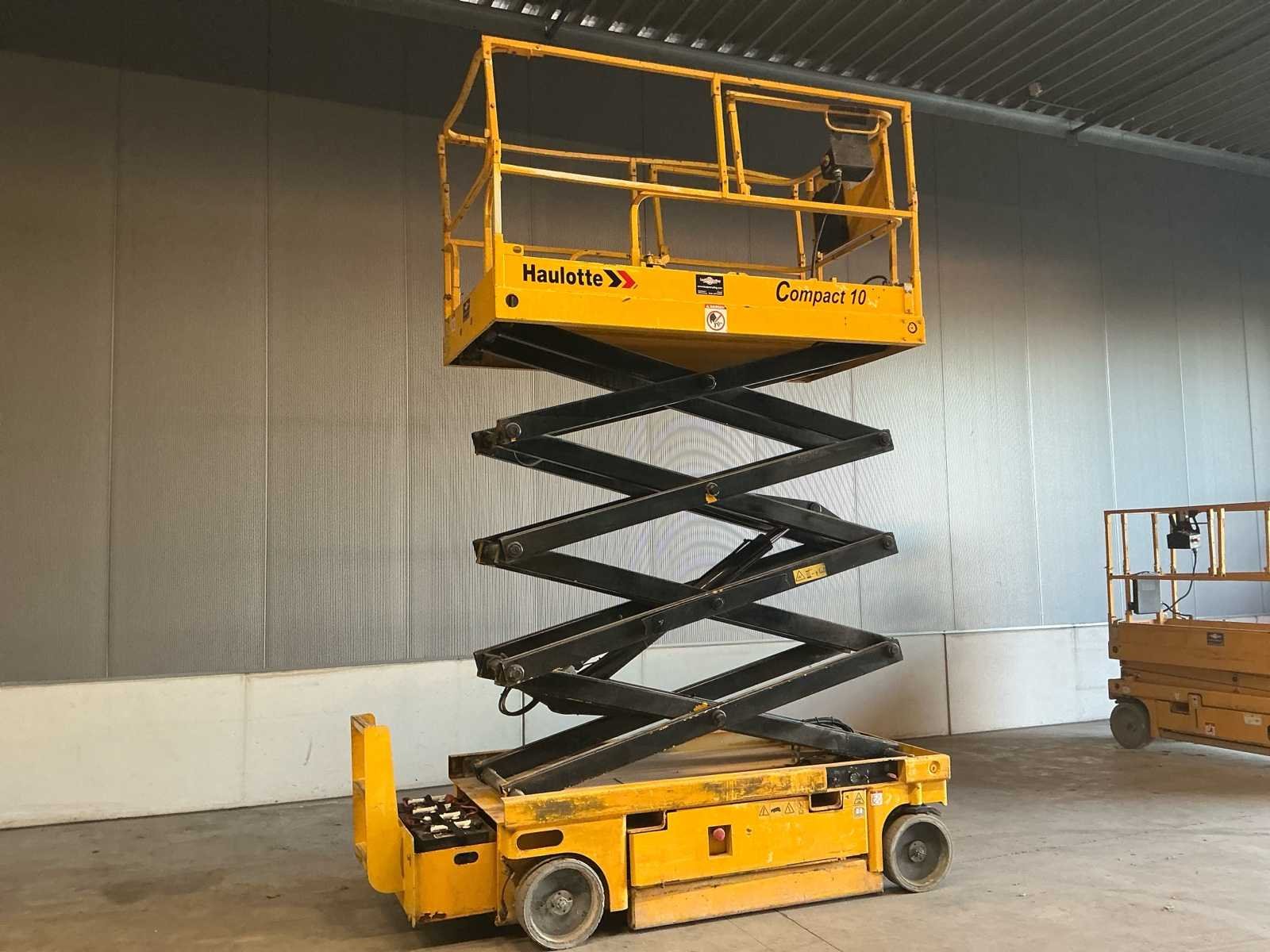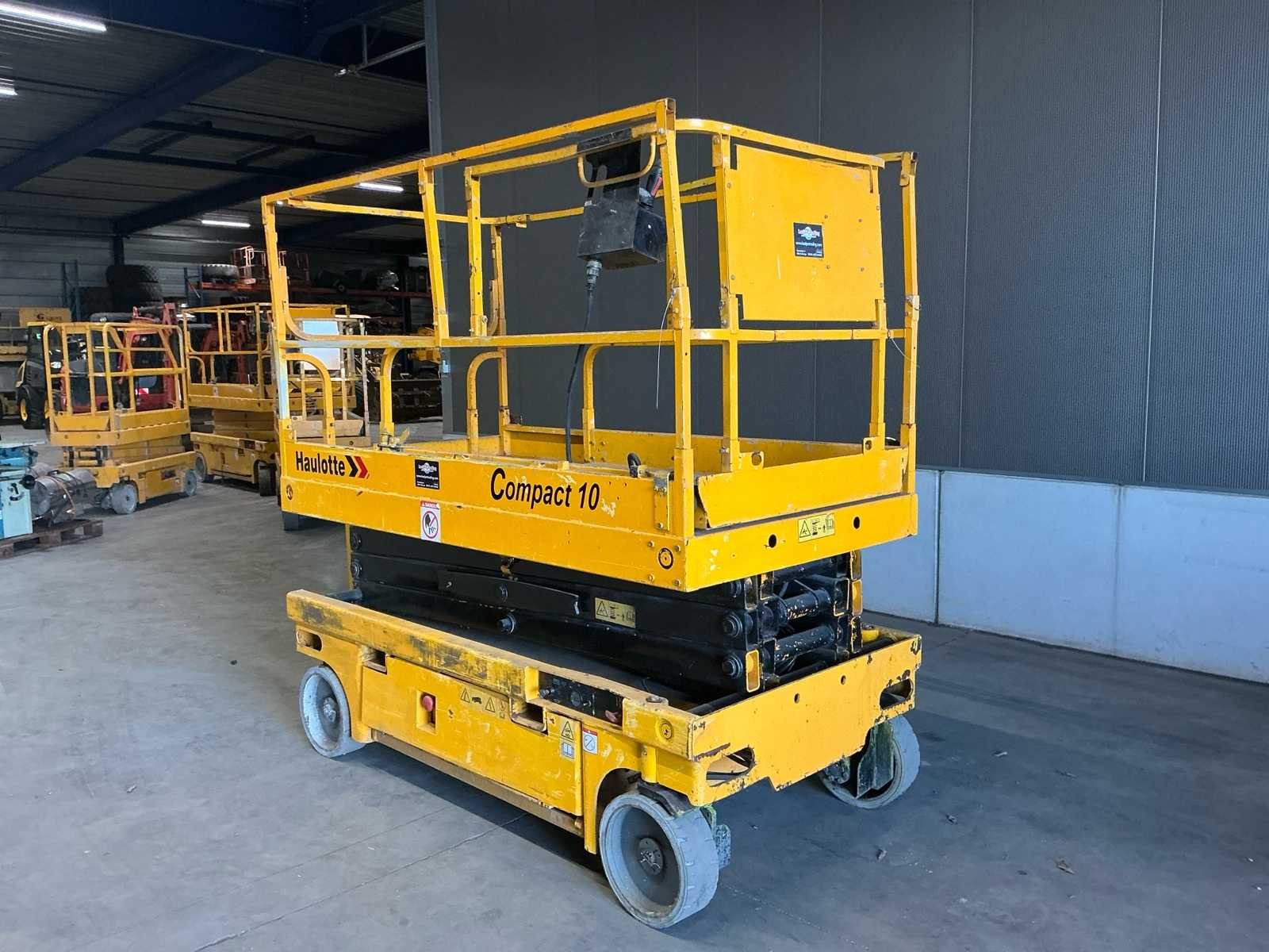 Voorzien van: batterijlaadindicator, proportionele hef- en aandrijffunctie, verwijderbare bedieningskast in het platform, uitklapbare componentenbak, geïntrigeerde batterijlader met automatische stop, vrijloopmechanisme, laadbeheersysteem in het platform, handmatig ventiel voor het laten zakken van het platform, geïntegreerde vorkheftruckvakken, trekhaken, claxon, urenteller, werkhoogte 8,25 m, platformhoogte 6,25 m, hefcapaciteit - binnen 450 kg, platformlengte - buiten 2,30 m, platformlengte - uitgeschoven 3,22 m, opbergoogte - ingeklapt 2,14 m, draaicirkel - buiten 2,50m, banden - non-marking Nee Merk: Haulotte Type: Compact 10 Bouwjaar: 2008 Serienummer: CE135674 Elektrisch: true Motorvermogen (kW): 3kW Schaarhoogwerker: true Werkhoogte: 10150mm Plateau afm. l: 2300mm Plateau afm. b: 1200mm Platform capaciteit: 450kg Accu lader: true Afgelezen urenstand: 975 Eigen gewicht: 2330kg Totale afmeting L: 2500mm Totale afmeting Breedte: 1200mm Totale afmeting Hoogte: 2300mm