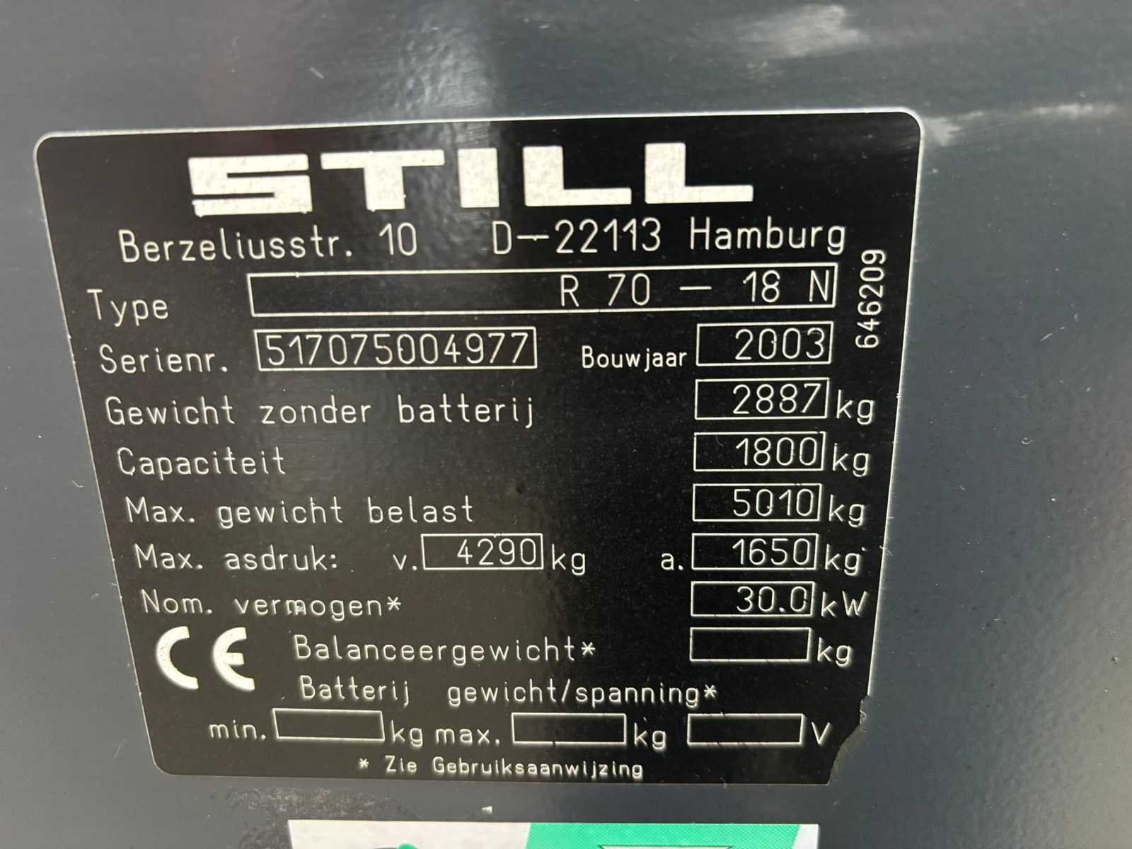 Mogelijkheid tot extra functie op Vorkenbord Nee Merk: Still Type: R70-18 Bouwjaar: 2003 Serienummer: 517075004977 Brandstof: Diesel Aantal wielen: 4 Afgelezen urenstand: 3743 Free-lift: true Side-shift: true Eigen gewicht: 2887kg Hefvermogen: 1800kg Lepellengte: 1150mm Max. hefhoogte: 4500mm Vol rubber banden: true Totale afmeting L: 3400mm Totale afmeting Breedte: 1150mm Totale afmeting Hoogte: 2060mm Leveringsvoorwaarden: Gratis op vrachtwagen