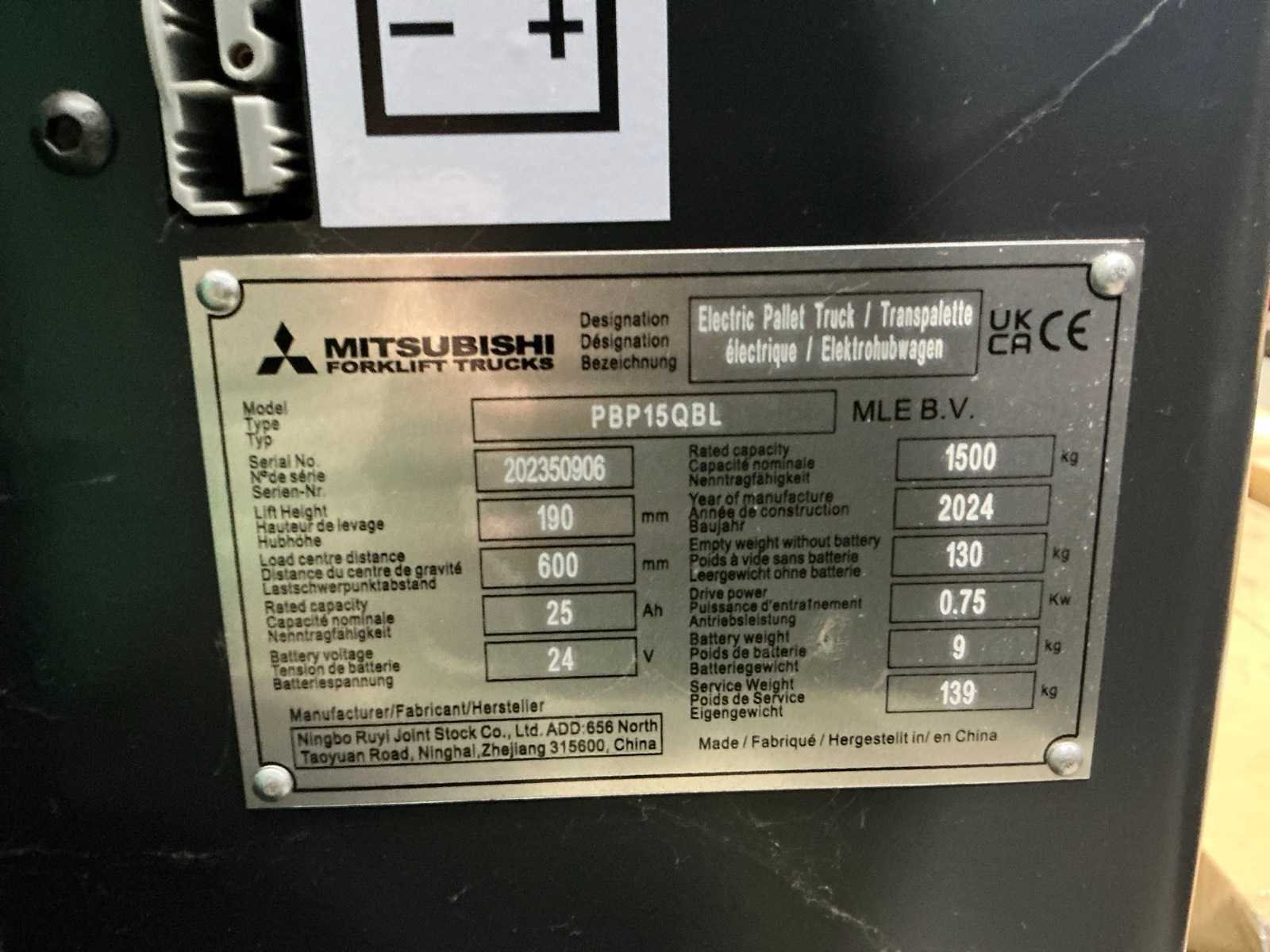 Nieuw / ongebruikt. Voorzien van dubbele wielen, externe acculader en gebruiksaanwijzing. Nee Merk: Mitsubishi Type: PWL15 Bouwjaar: 2024 Hefvermogen: 1500kg Lepellengte: 1150mm Accu lader: true Eigen gewicht: 139kg Totale afmeting L: 1550mm Totale afmeting Breedte: 560mm Totale afmeting Hoogte: 1250mm