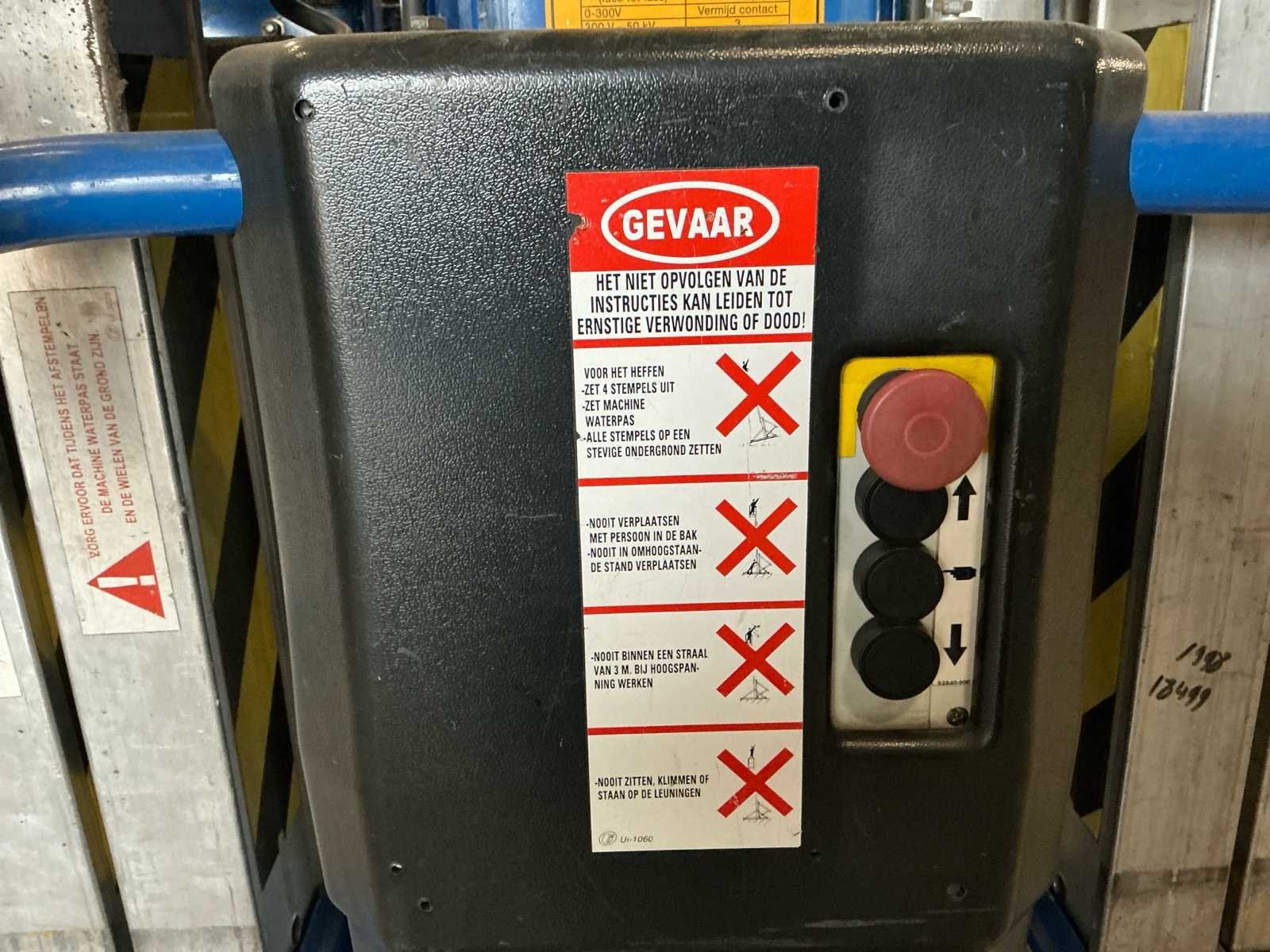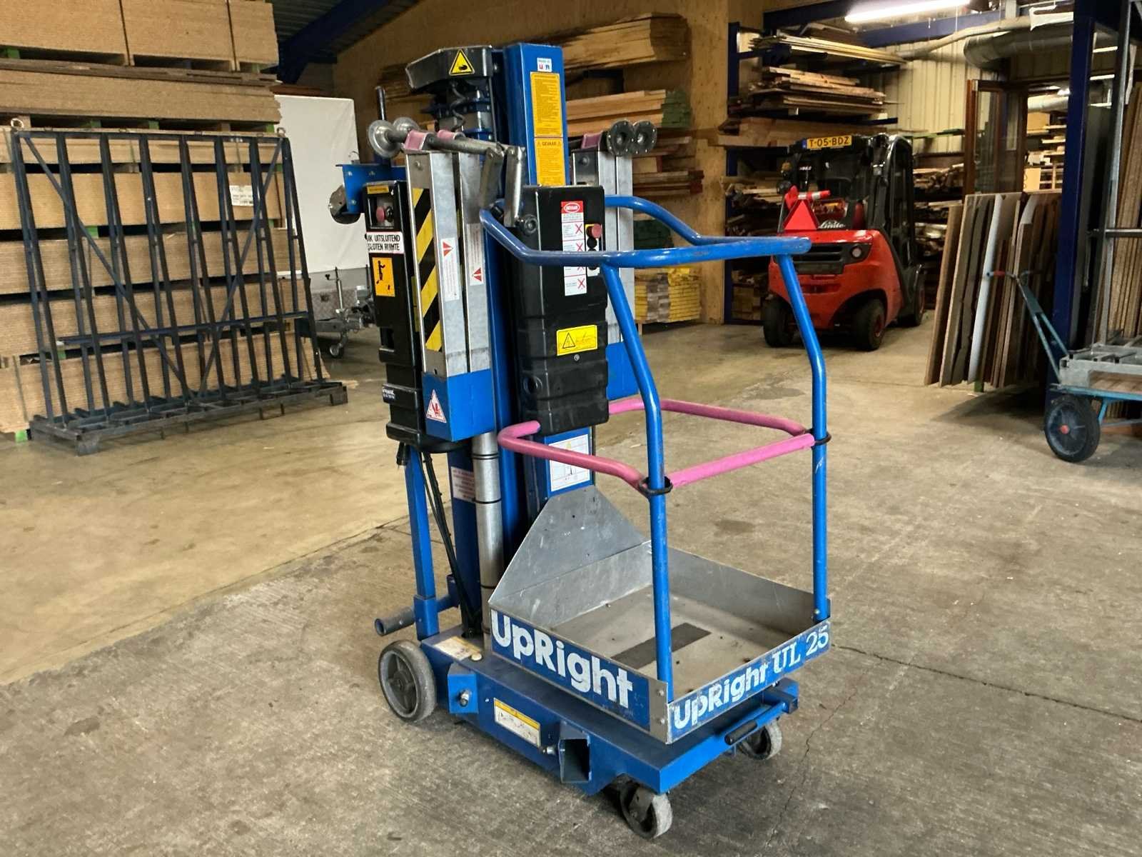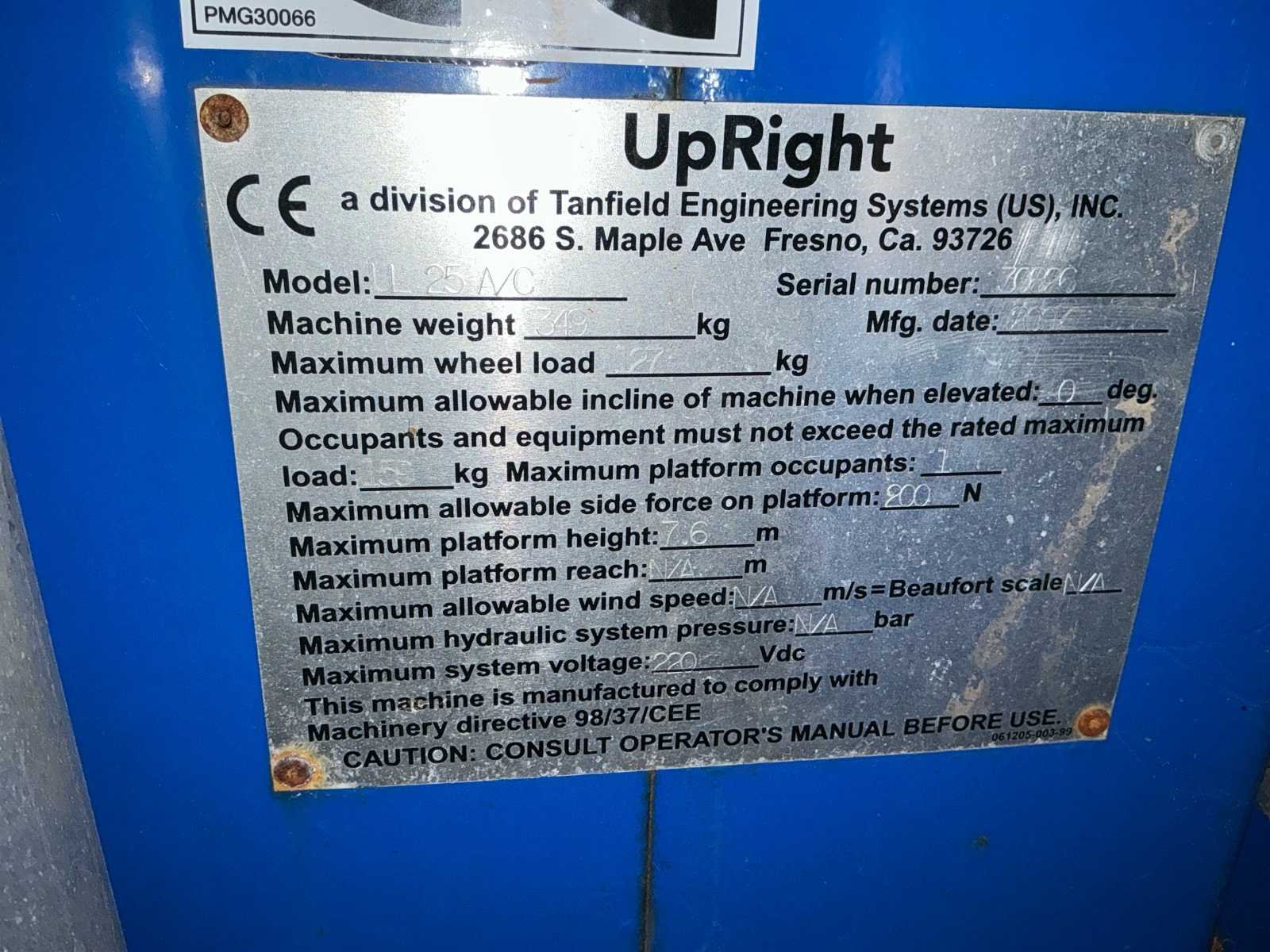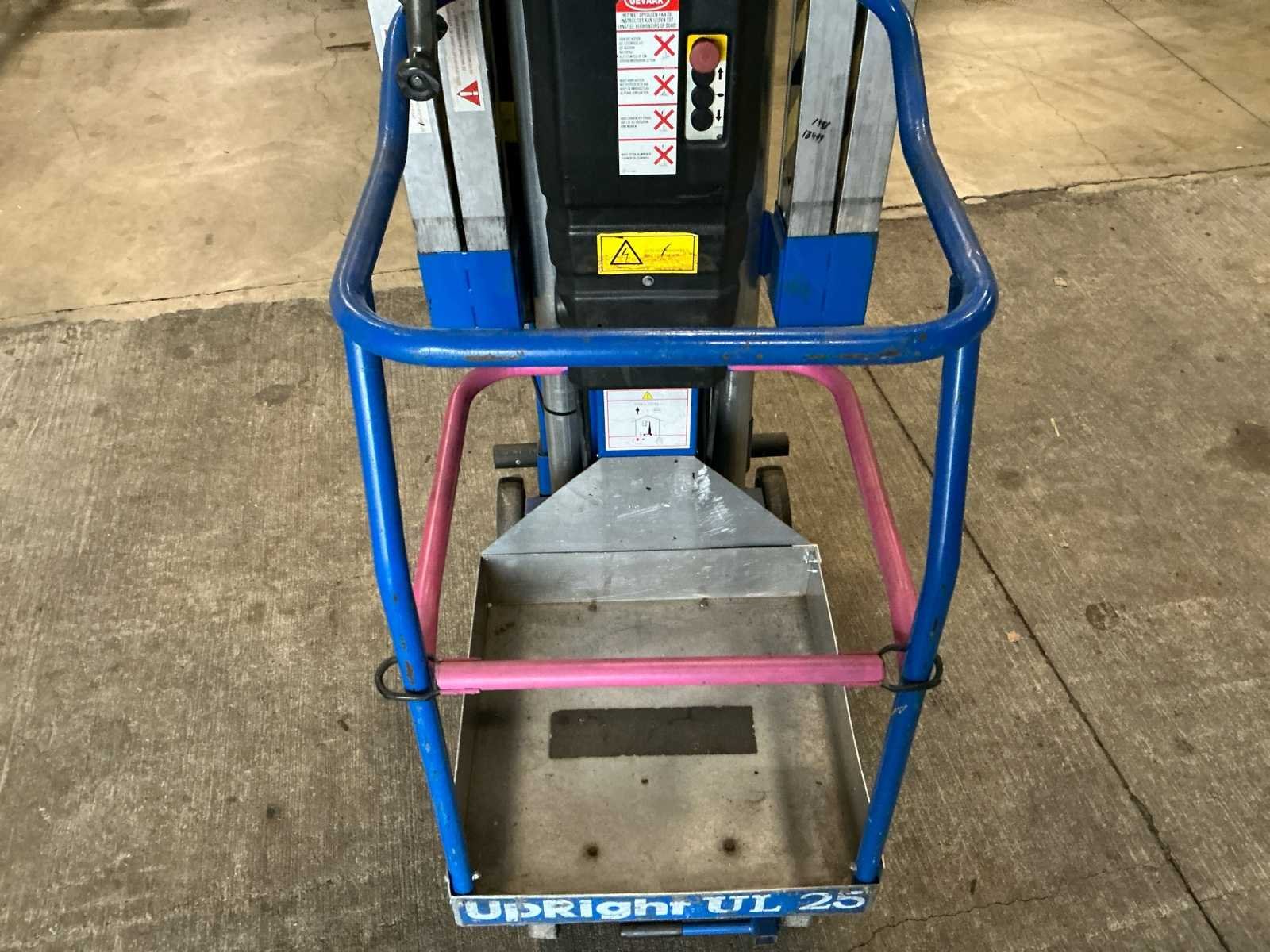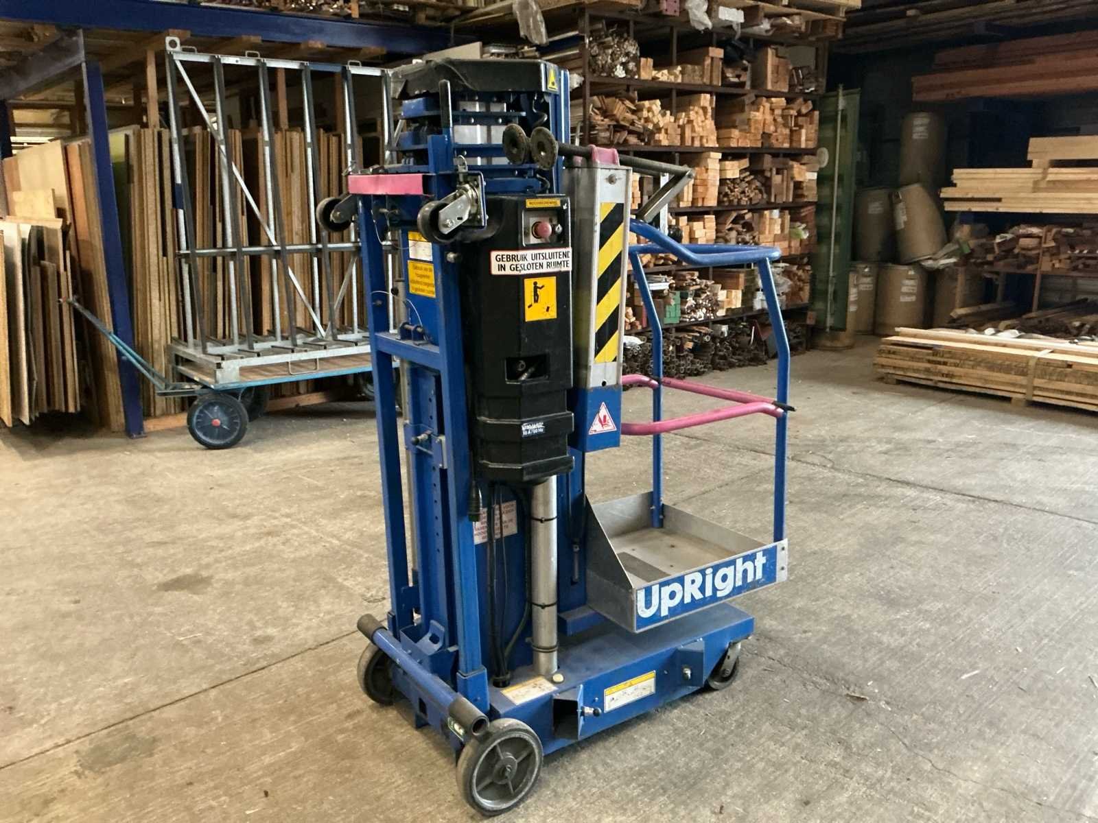 Voorzien van: maximale werkhoogte 9,60 m, maximale platformhoogte 7,62 m, platformcapaciteit (SWL) 159 kg, afmetingen steunpoten (breedte x lengte) 1,50 m x 1,43 m, platformafmetingen 0,56 m x 0,66 m, breedte in opgevouwen toestand 0,74 m, hoogte in opgevouwen toestand 1,98 m, lengte in opgevouwen toestand 1,26 m, Afstand van de voorkant van het platform tot de muur: 102 mm, voeding 1 x 12V 105Ah accu of 120/220V wisselstroom 50Hz. Nee Merk: UpRight Type: LL25 A-C Bouwjaar: 2007 Serienummer: 30826 Elektrisch: true Masthoogwerker: true Werkhoogte: 9600mm Plateau afm. l: 660mm Plateau afm. b: 560mm Platform capaciteit: 159kg Eigen gewicht: 360kg