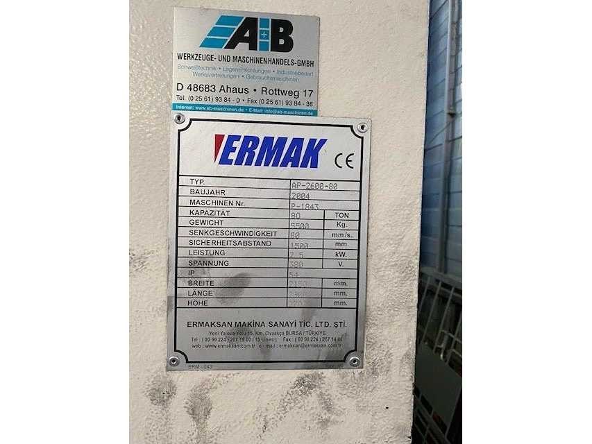 Nee Merk: Ermak Type: AP 2600 80 Bouwjaar: 2004 Serienummer: P-1843 Capaciteit.: 80t Handbediend: true Aansluiting: 400V Machinegewicht: 5500kg Afmeting l: 2800mm Afmeting b: 2150mm Afmeting h: 2700mm