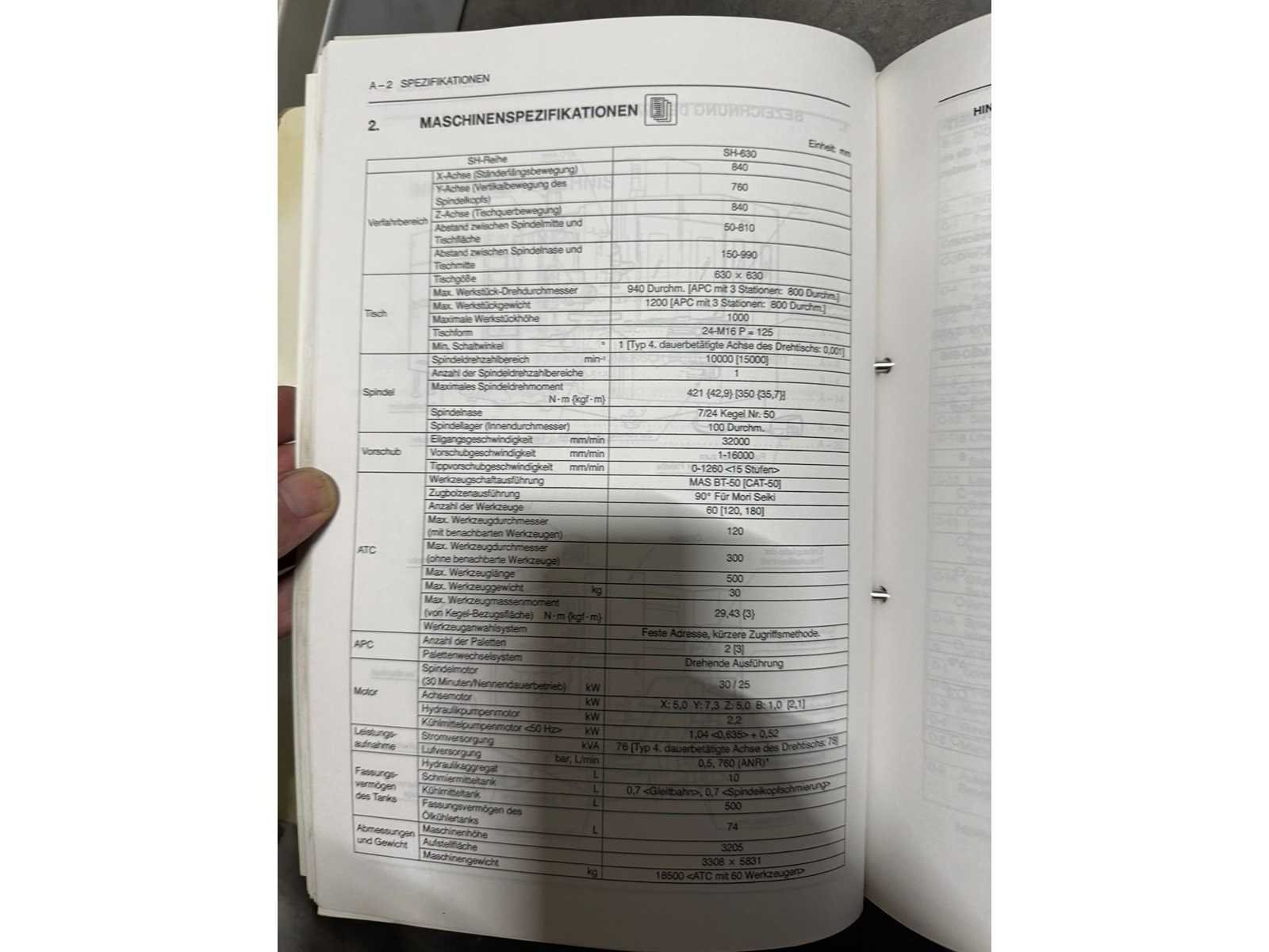Pallet maat 630 x 630 mm; 60 gereedschap magazijn; Let op! Gereedschappen in het magazijn behoren niet tot deze kavel! Nee Merk: Mori Seiki Type: SH630 Bouwjaar: 1998 Serienummer: 279 Verplaatsing x-as: 840mm Verplaatsing y-as: 760mm Verplaatsing z-as: 840mm Snelheid van n =: 10000rpm CNC-besturing, merk, type: Fanuc MCS 516 Spanentransporteur: true Koelmiddelpomp: true Aansluiting: 400V Machinegewicht: 18500kg Afmeting l: 5400mm Afmeting b: 3300mm Afmeting h: 3150mm