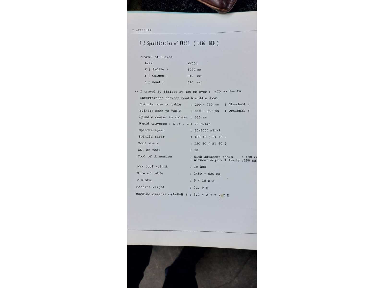 Voorzien van gereedschap wisselmagazijn 30 plaatsen. Zonder gereedschappen; No Merk: Quaser Type: MK-60L Bouwjaar: 1996 Serienummer: 260E128 Opname iso: 40 Verplaatsing x-as: 1020mm Verplaatsing y-as: 510mm Verplaatsing z-as: 510mm Snelheid tot n =: 8000rpm CNC-besturing, merk, type: Fanuc Series 0-M Spanentransporteur: true Koelmiddelpomp: true T-gleuf opspantafelafmeting B: 620mm T-gleuf opspantafelafmeting L: 1450mm Aansluiting: 380V Machinegewicht: 9000kg Afmeting l: 4800mm Afmeting b: 3000mm Afmeting h: 2540mm
