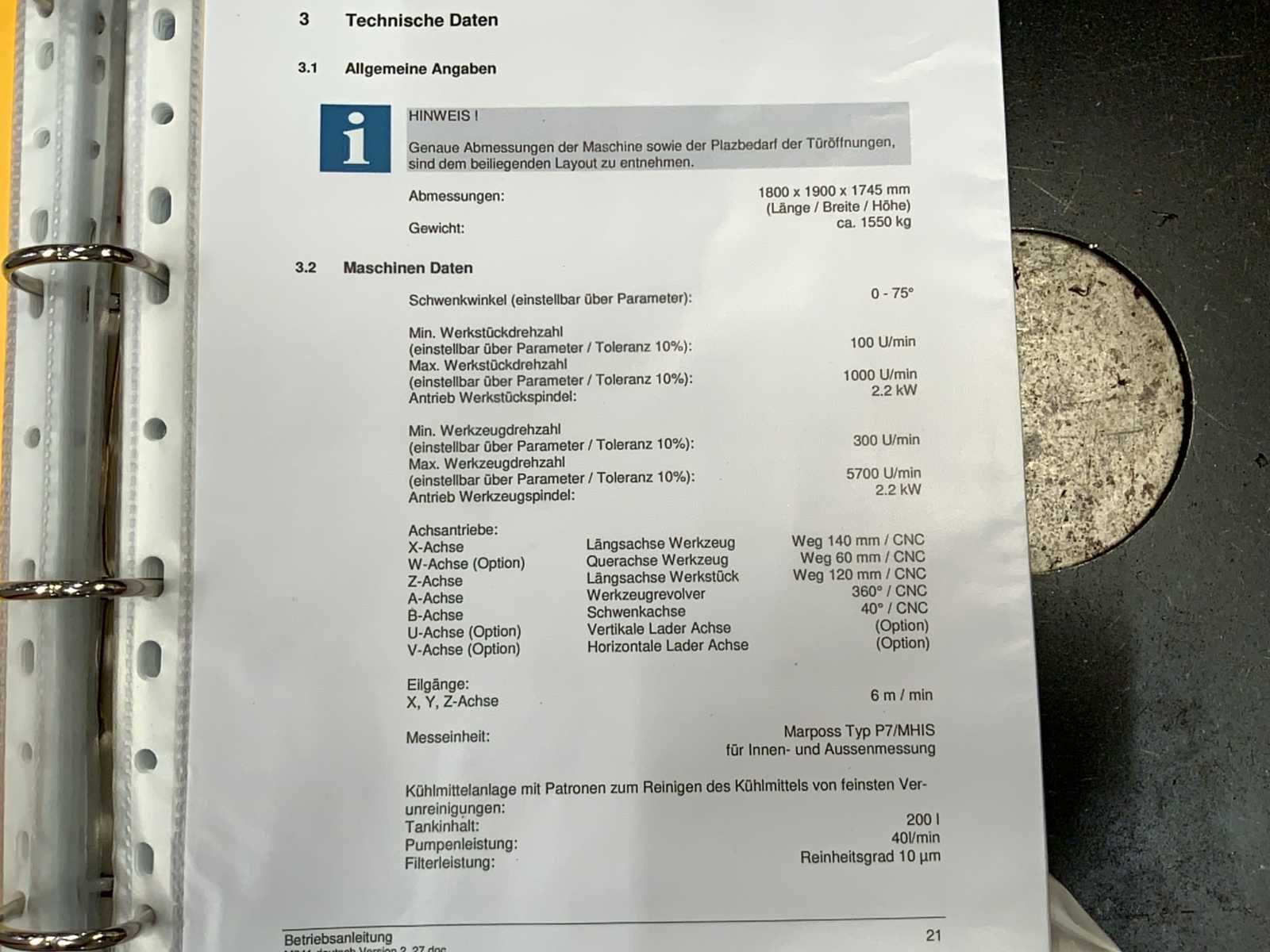 Besturing Fanuc Series 321i-A, werkstuk doorsnede ø22 - ø 64 mm. Nee Merk: MZ Monnier-Zahner Type: M641 Bouwjaar: 2018 Serienummer: 0064111230917 CNC: true Besturing, merk, type: FANUC Afgelezen urenstand: 9709 Motorvermogen (kW): 2.2kW Aansluiting: 400V Handboek aanwezig: true Machinegewicht: 1550kg Afmeting l: 1800mm Afmeting b: 1900mm Afmeting h: 1745mm