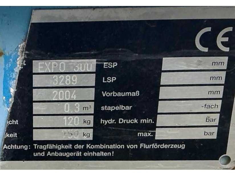 Inclusief inhoud Nee Gewicht: 120kg Type: Expo 300 Bouwjaar: 2004 Staal, inhoud: 0,3m³ Totale afmeting L: 1250mm Totale afmeting Breedte: 770mm Totale afmeting Hoogte: 940mm