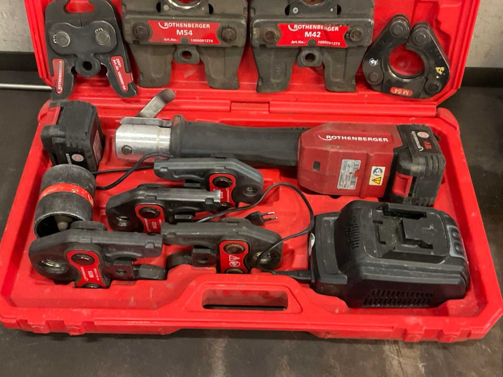 Cap. 12-110 mm; incl. diverse persbekken; (2x) accu en acculader Nee Merk: Rothenberger Type: Romax 3000 Met koffer: true Accuspanning: 18V