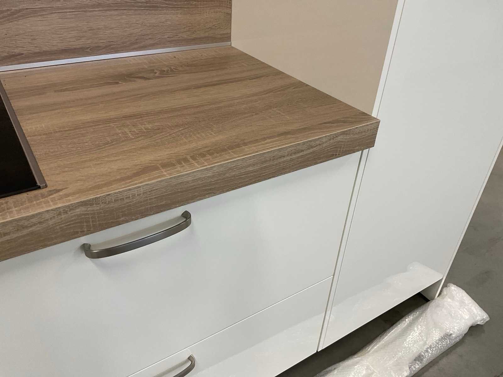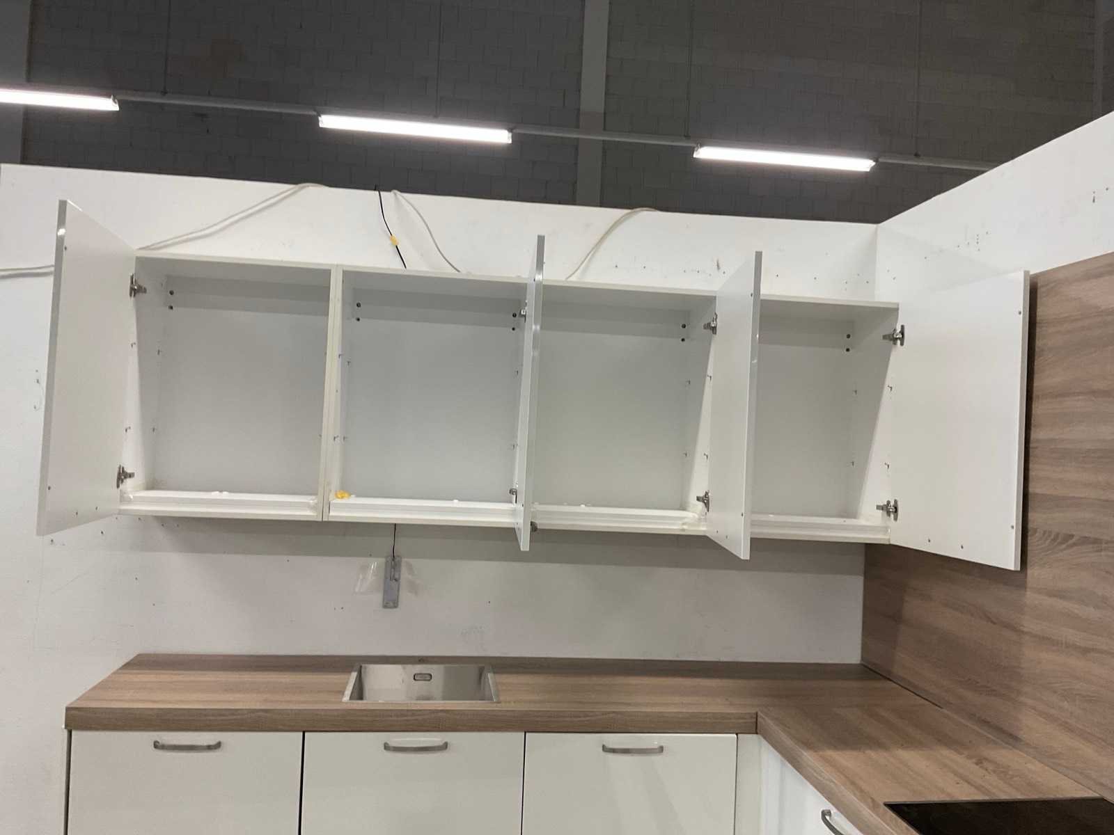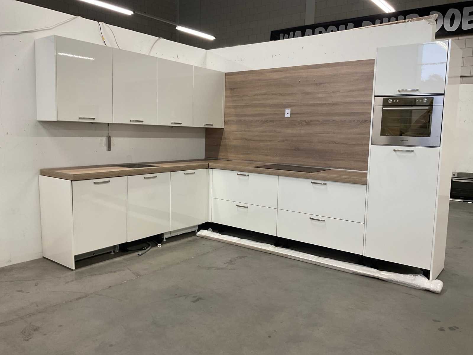 Indeling: 1 onderkast; 2 ladenkasten waarvan 1 met binnenlade; 1 hoge kast; 4 bovenkasten; Apparatuur: Whirlpool 4-zone inbouw kookplaat; type AKT8330; Bauknecht inbouwstoomoven; type ECTM8145/1 PT; inhoud 29 liter; Whirlpool inbouwkoelkast; type ARG 100711; Whirlpool onderbouw vriezer; type AFB8281; inhoud 91 liter; Whirlpool inbouwvaatwasser; type WIC3B19; reeds gedemonteerd en ingepakt op pallets; werkbladen, plinten en hoge kasten niet ingepakt Nee Lengte: 246cm Breedte: 329cm Hoogte: 217cm Kraan: geen Gootsteen: Job Werkblad hoogte: 92cm Aanrechtblad: met hard kunststof toplaag eiken decor en achterwand Hoofdkleur: wit hoogglans