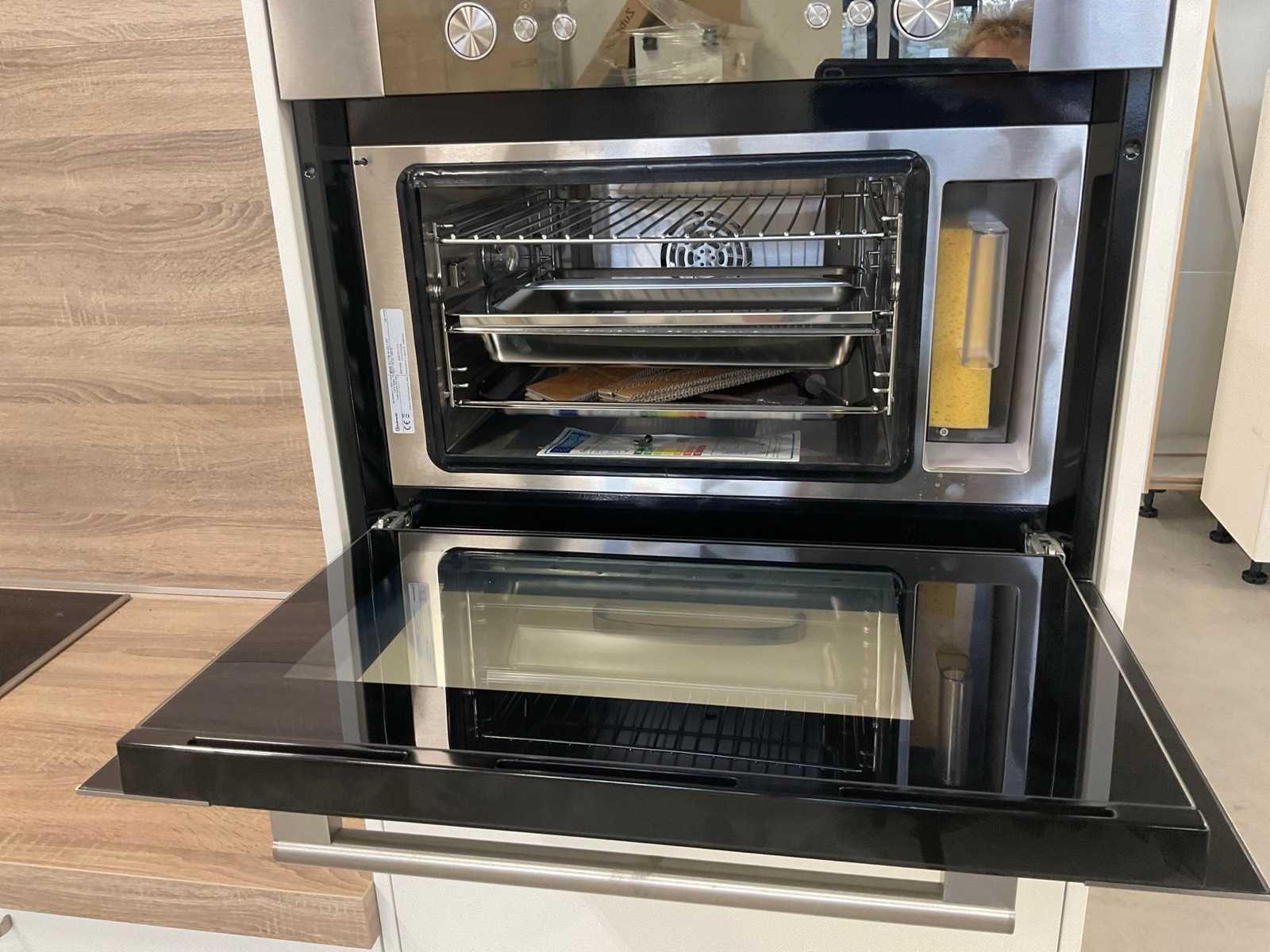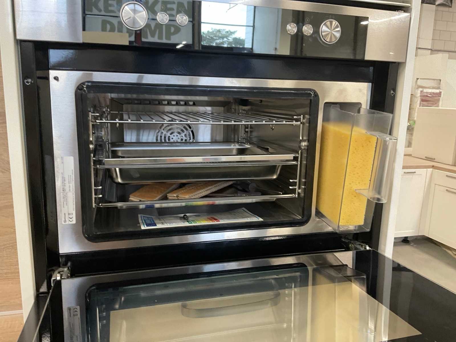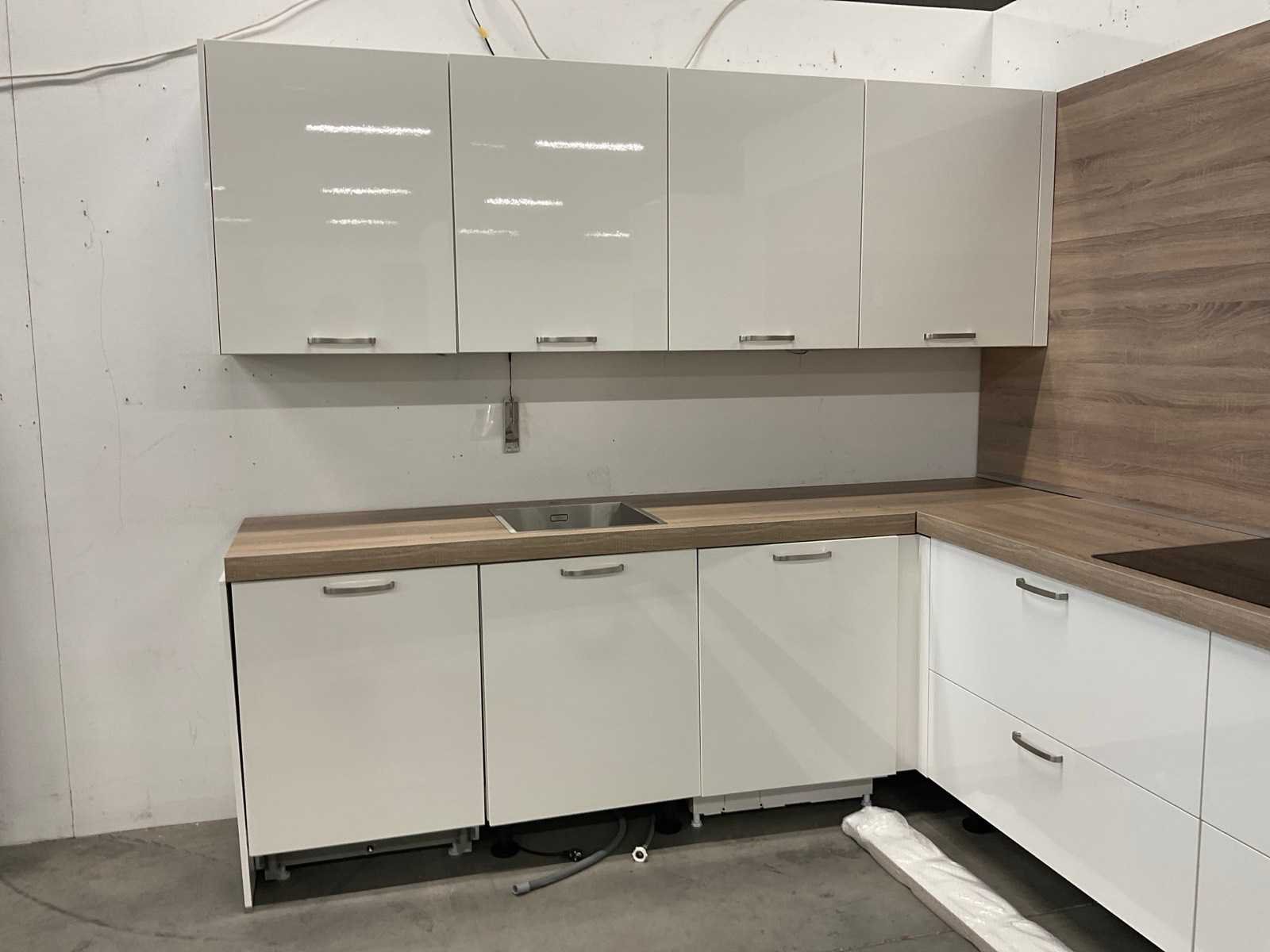 Indeling: 1 onderkast; 2 ladenkasten waarvan 1 met binnenlade; 1 hoge kast; 4 bovenkasten; Apparatuur: Whirlpool 4-zone inbouw kookplaat; type AKT8330; Bauknecht inbouwstoomoven; type ECTM8145/1 PT; inhoud 29 liter; Whirlpool inbouwkoelkast; type ARG 100711; Whirlpool onderbouw vriezer; type AFB8281; inhoud 91 liter; Whirlpool inbouwvaatwasser; type WIC3B19; reeds gedemonteerd en ingepakt op pallets; werkbladen, plinten en hoge kasten niet ingepakt Nee Lengte: 246cm Breedte: 329cm Hoogte: 217cm Kraan: geen Gootsteen: Job Werkblad hoogte: 92cm Aanrechtblad: met hard kunststof toplaag eiken decor en achterwand Hoofdkleur: wit hoogglans