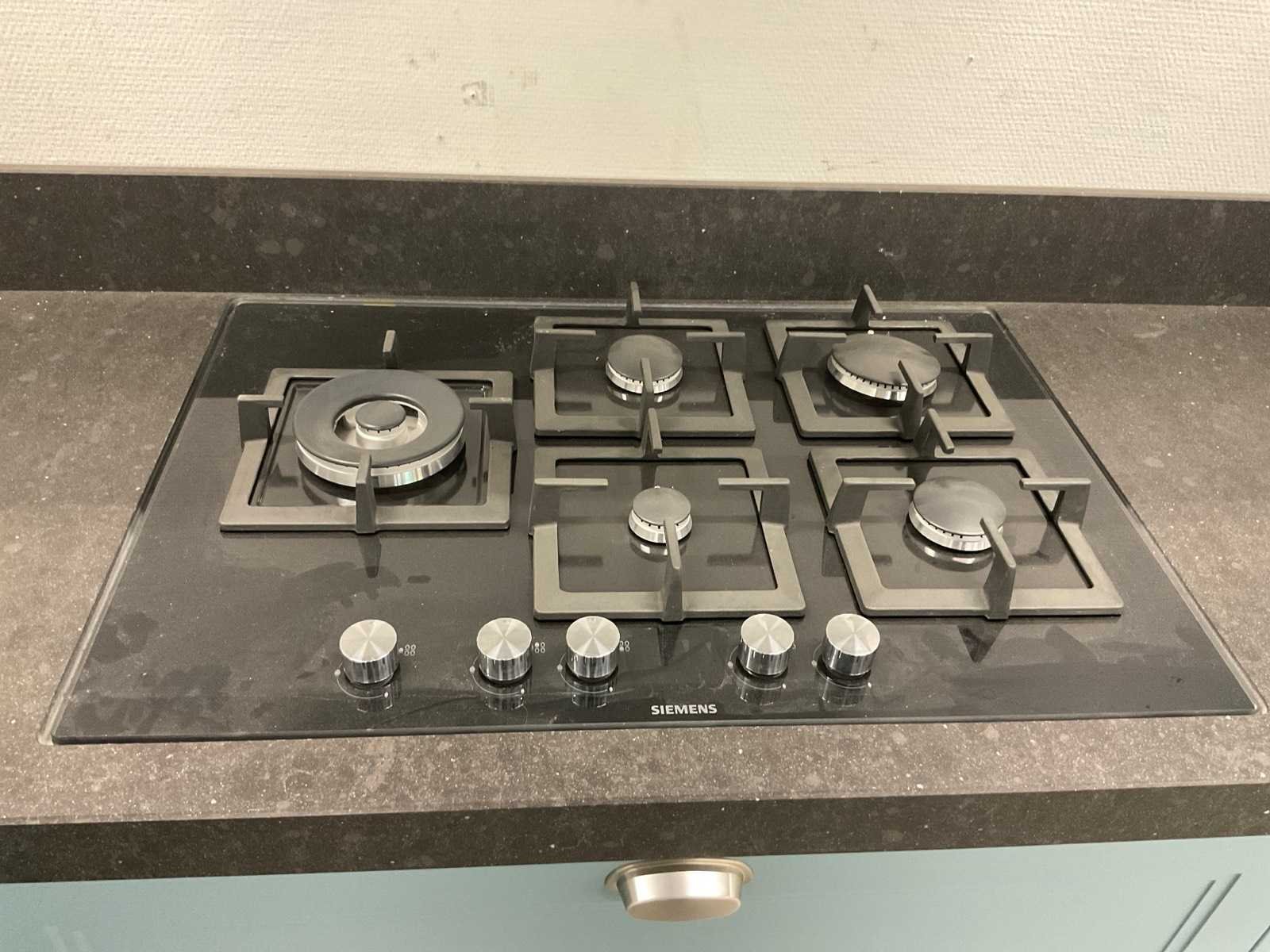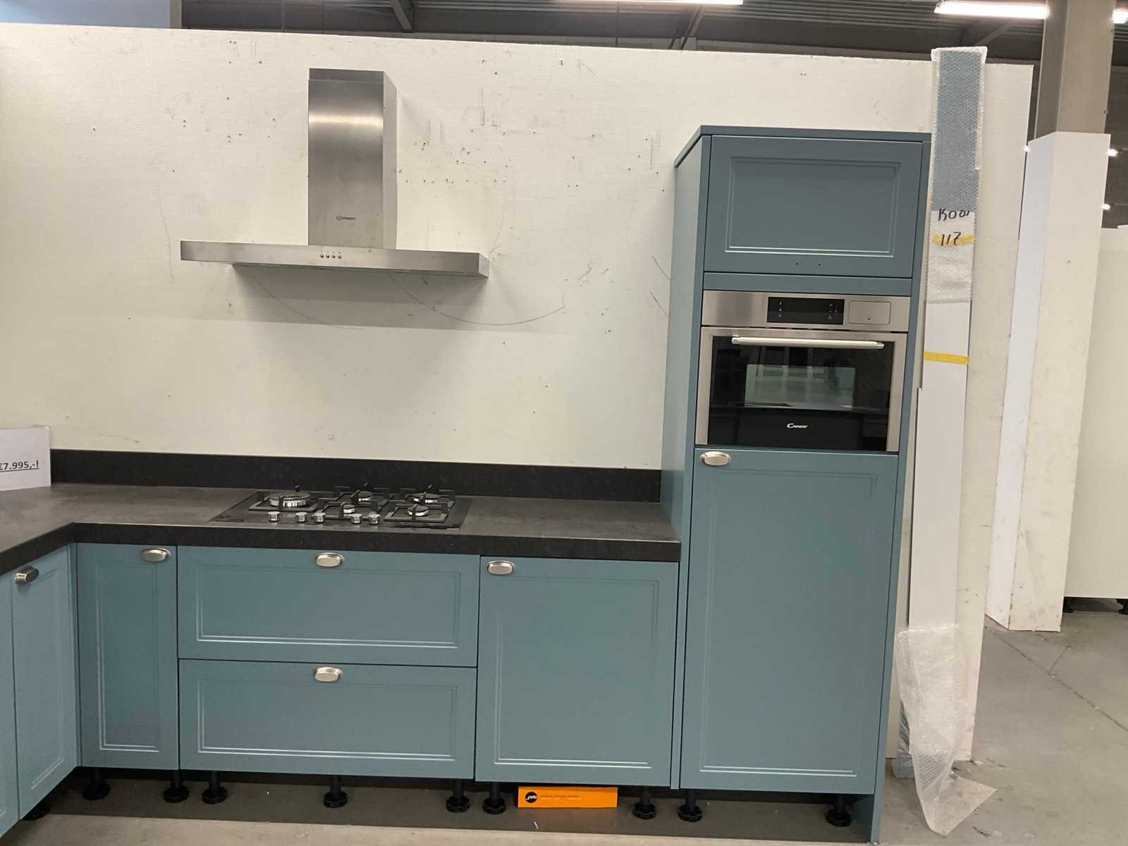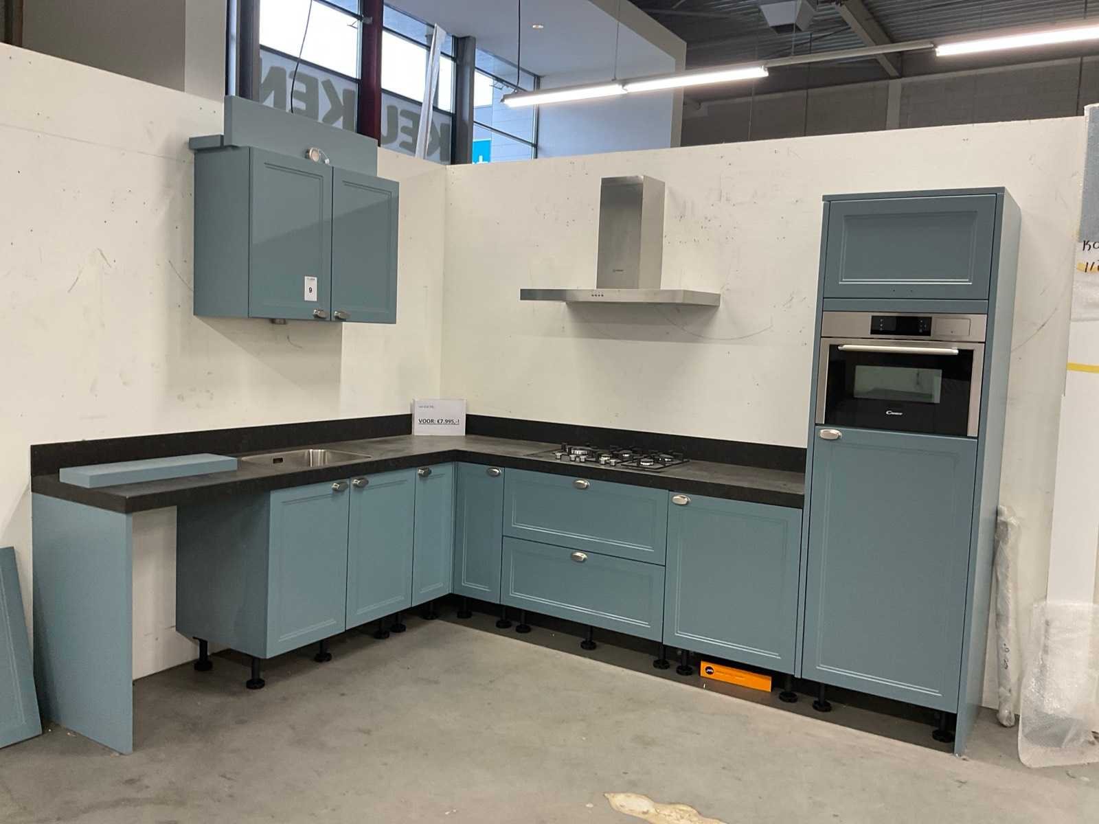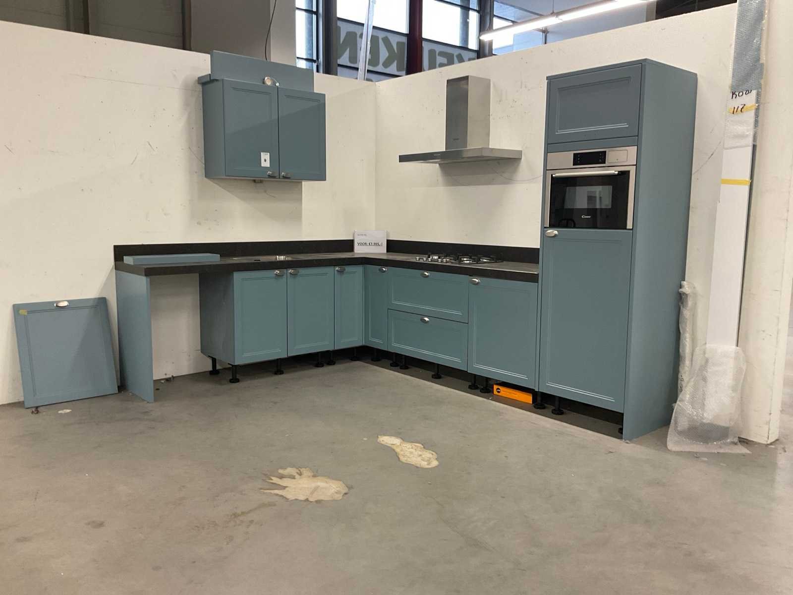 Indeling: 2 onderkasten; 1 hoekkast met draaicarrousel; 1 ladenkast; 1 hoge kast; 1 bovenkast; 3 wandplanken afm. 90x20x5 cm en 62x20x5 cm; deurfront voor vaatwasser; Apparatuur: Siemens 5-pits inbouw gas-op-glas kookplaat; Indesit wandafzuigkap; type IHBS 9.4 LM X; Candy inbouw stoomoven; type MECS34TX; reeds gedemonteerd en ingepakt op pallets; werkbladen, plinten en hoge kasten niet ingepakt Nee Lengte: 244cm Breedte: 306cm Hoogte: 214cm Kraan: geen Werkblad hoogte: 93cm Aanrechtblad: Graniet met wandplint 12 cm Hoofdkleur: blauwgrijs mat