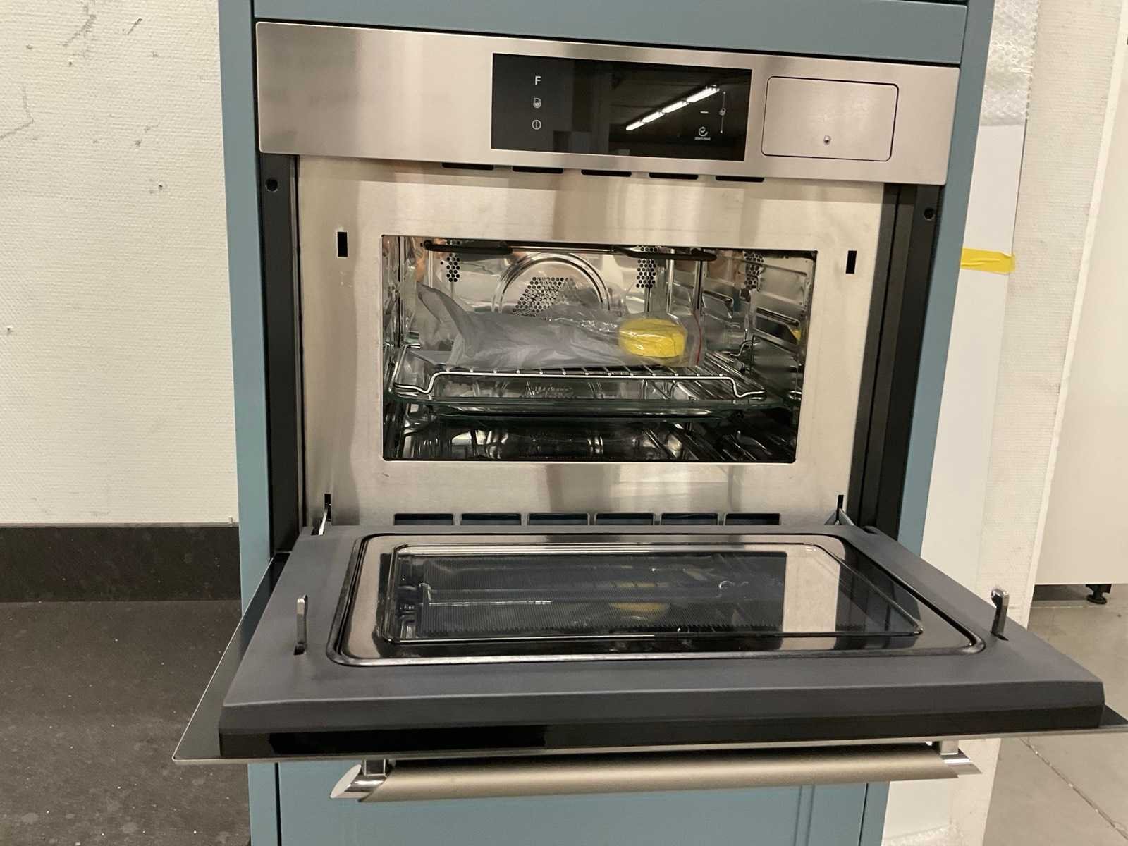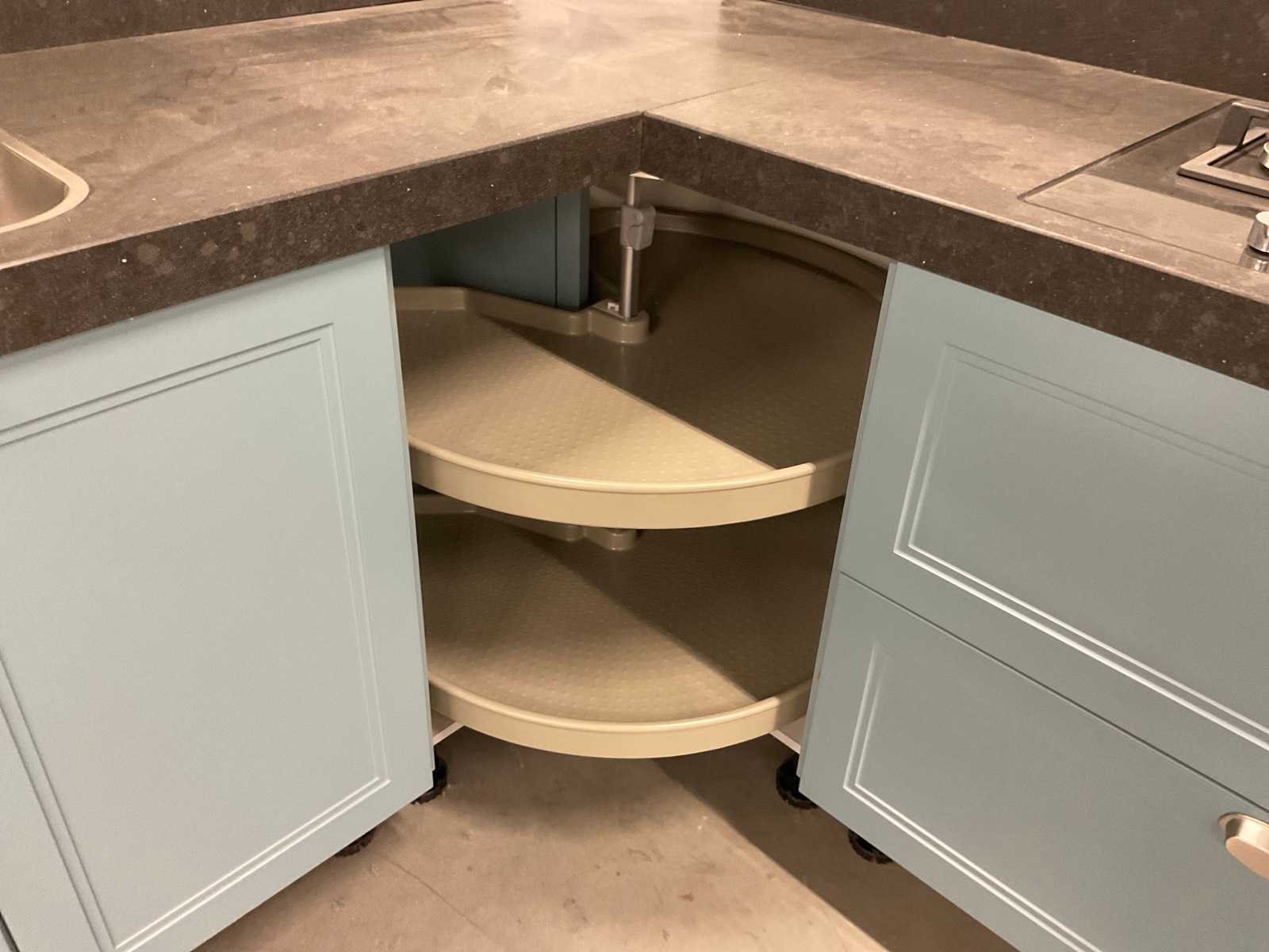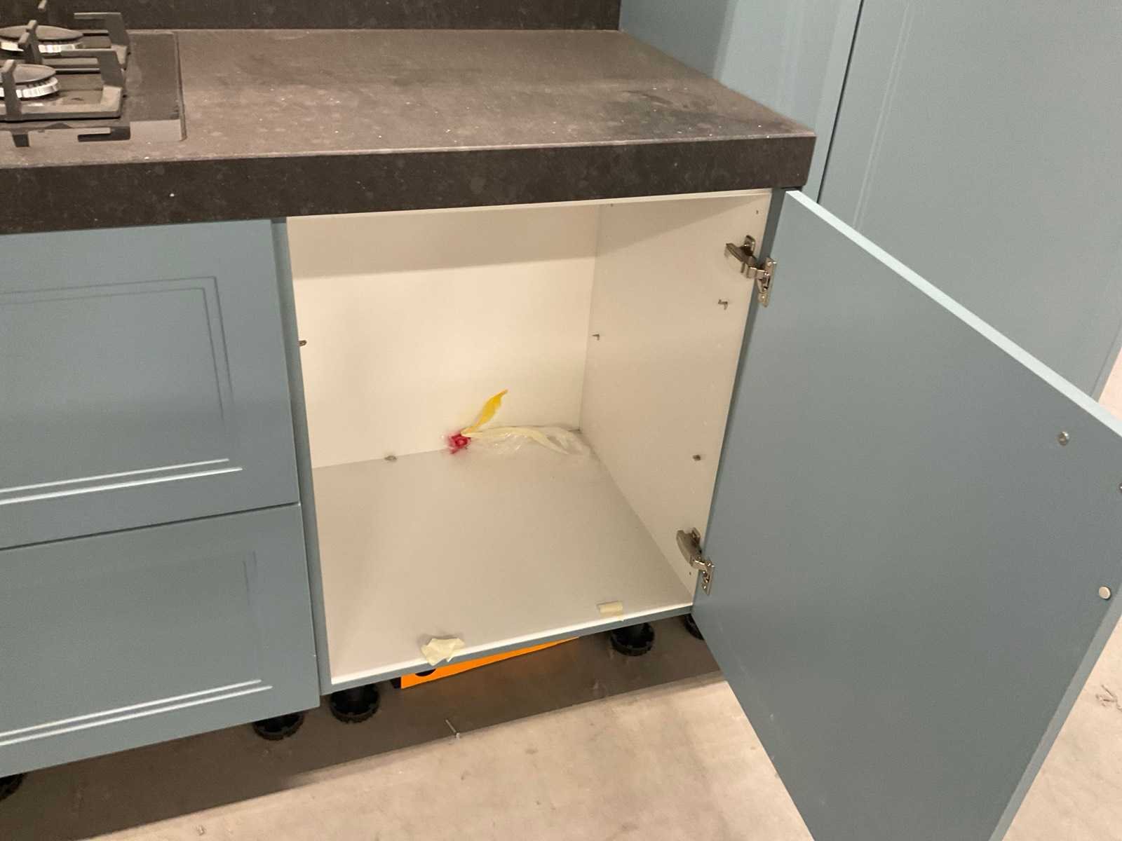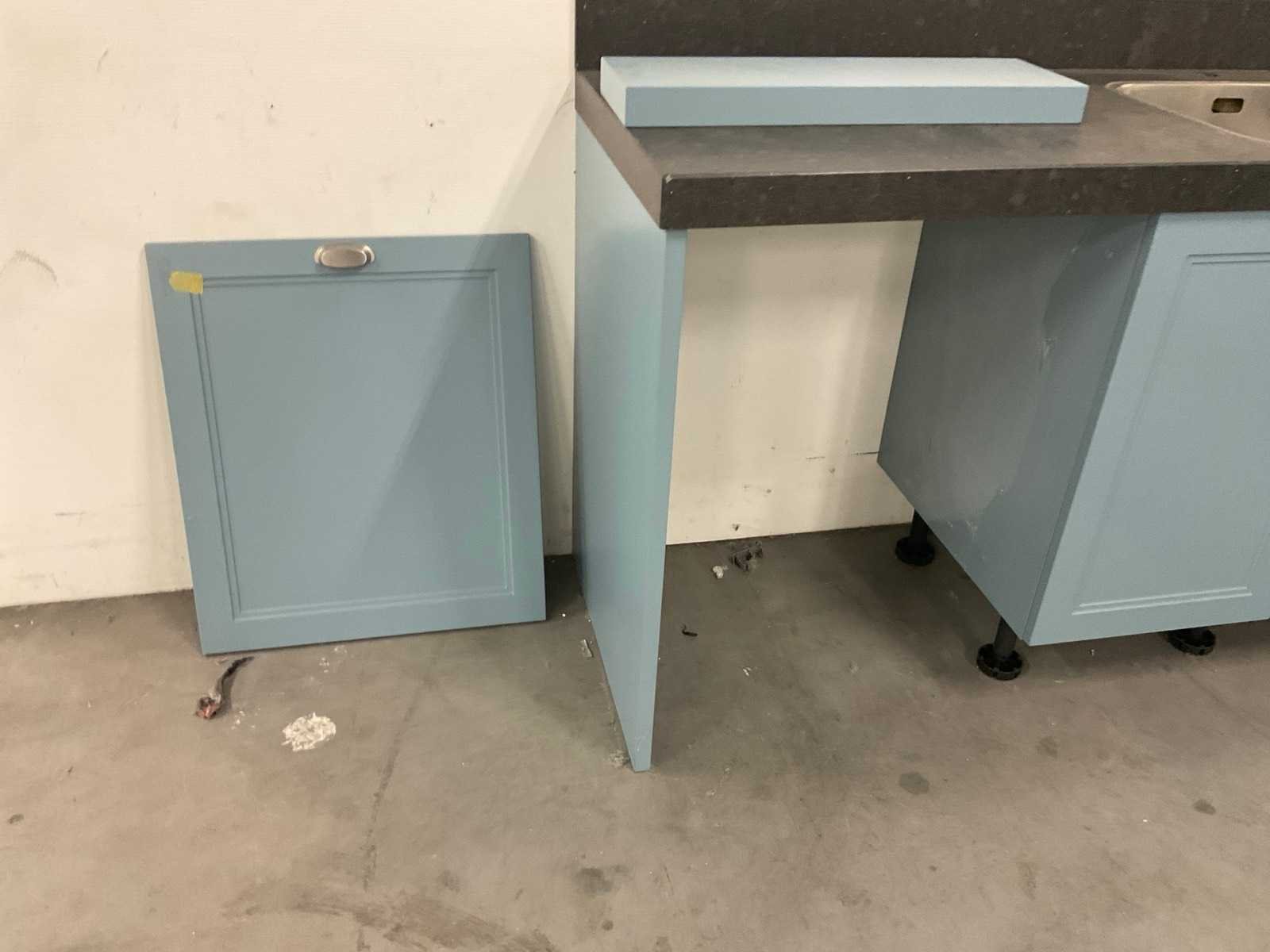Indeling: 2 onderkasten; 1 hoekkast met draaicarrousel; 1 ladenkast; 1 hoge kast; 1 bovenkast; 3 wandplanken afm. 90x20x5 cm en 62x20x5 cm; deurfront voor vaatwasser; Apparatuur: Siemens 5-pits inbouw gas-op-glas kookplaat; Indesit wandafzuigkap; type IHBS 9.4 LM X; Candy inbouw stoomoven; type MECS34TX; reeds gedemonteerd en ingepakt op pallets; werkbladen, plinten en hoge kasten niet ingepakt Nee Lengte: 244cm Breedte: 306cm Hoogte: 214cm Kraan: geen Werkblad hoogte: 93cm Aanrechtblad: Graniet met wandplint 12 cm Hoofdkleur: blauwgrijs mat