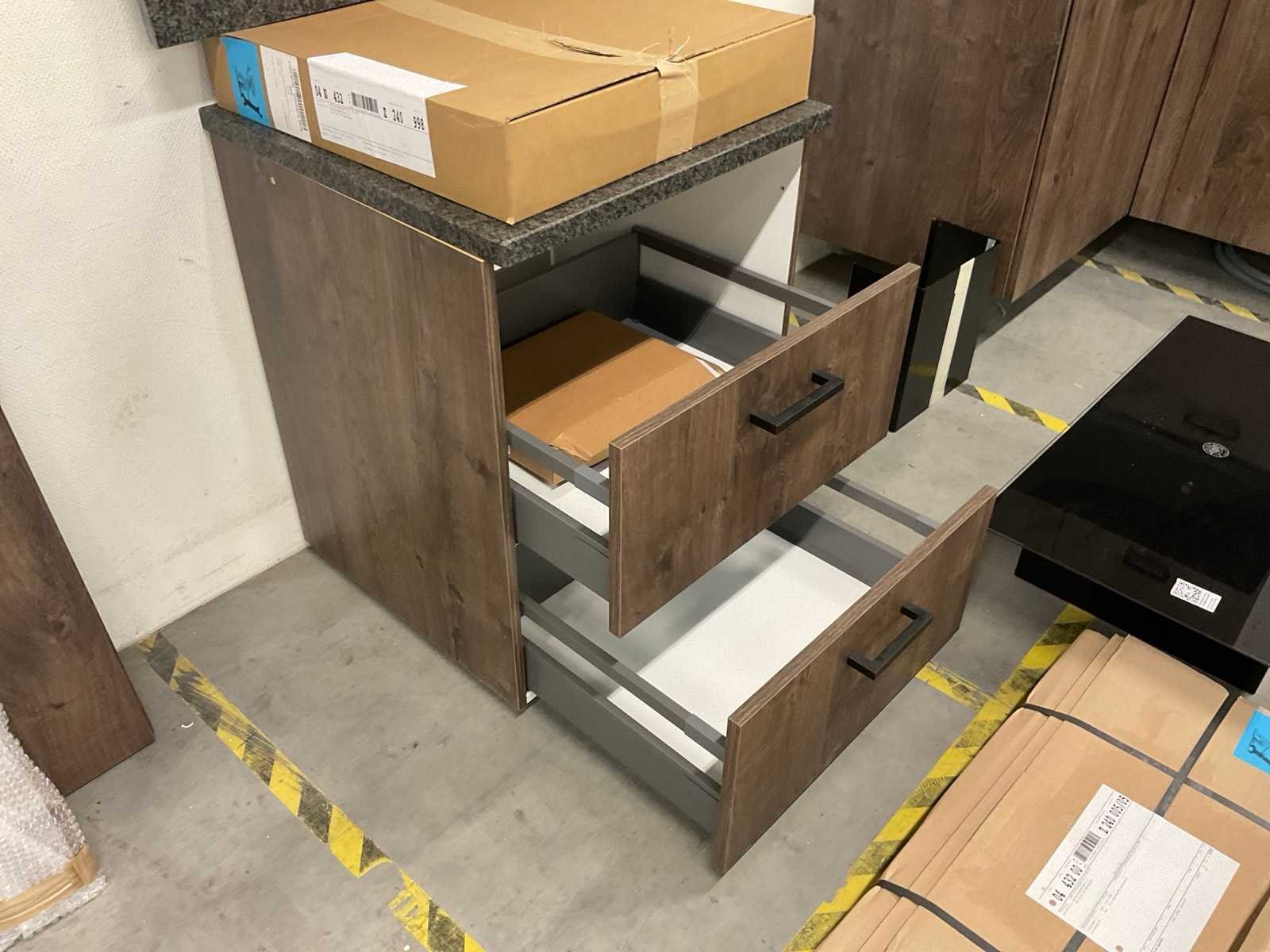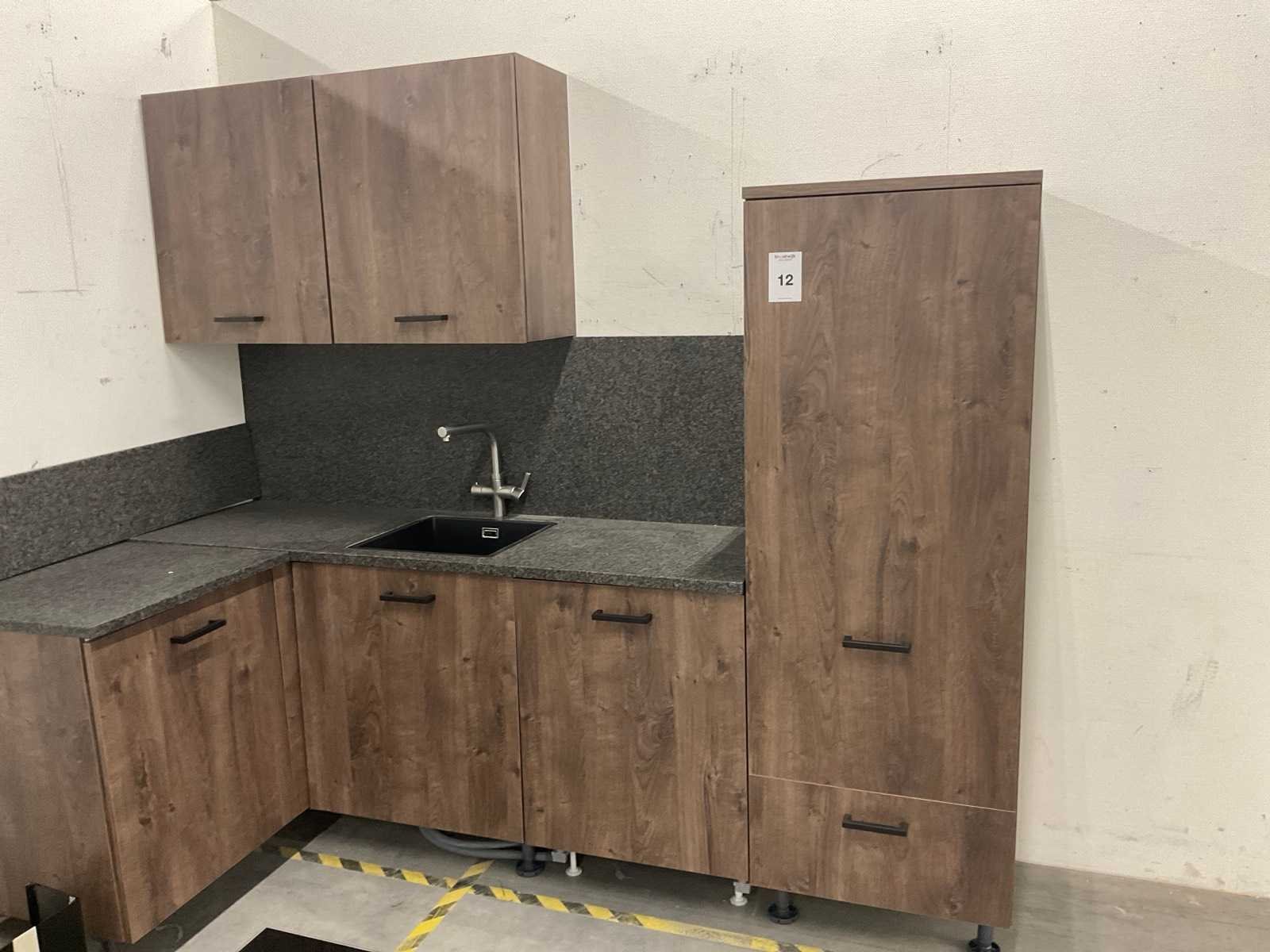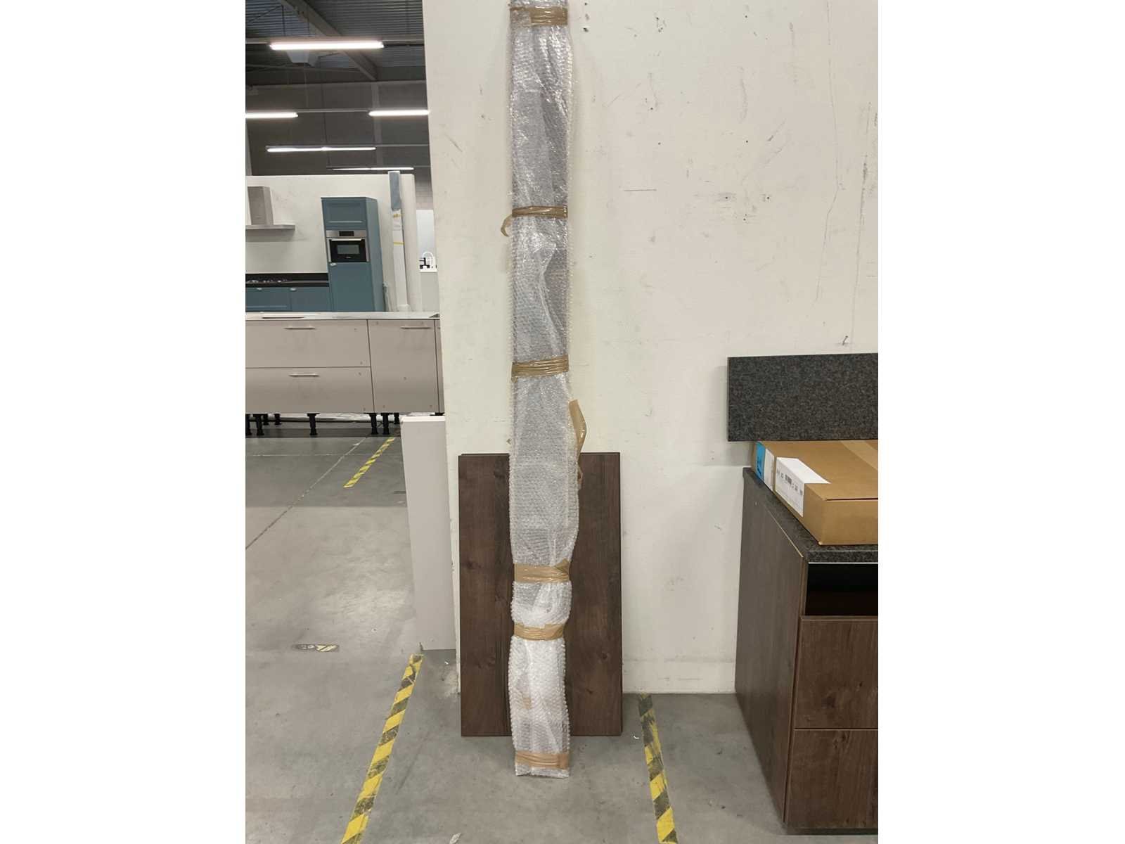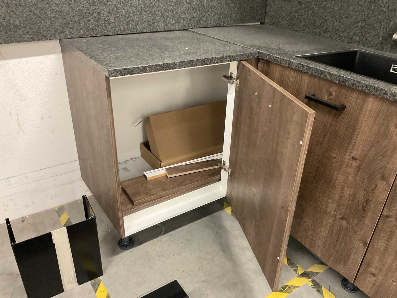 Indeling: 1 onderkast; 1 hoekkast; 1 ladenkast waarvan 1 lade nog te monteren; 2 bovenkasten; Apparatuur: AquaHot; 3-in-1 kokendwaterkraan met reservoir; Bertazzoni wandafzuigkap; 90 cm breed; Bauknecht inbouwkoelkast; type KSI12VS1; inhoud 209 liter; Bauknecht inbouwvaatwasser; type BIO3T341 PL; reeds gedemonteerd en ingepakt op pallets; werkbladen, plinten en hoge kasten niet ingepakt Nee Lengte: 273cm Breedte: 243cm Hoogte: 181cm Kraan: Aquahot 3-in-1 kokendwaterkraan Werkblad hoogte: 91cm Aanrechtblad: hardsteen graniet grijs met achterwand en plint Hoofdkleur: Oregon eiken decor