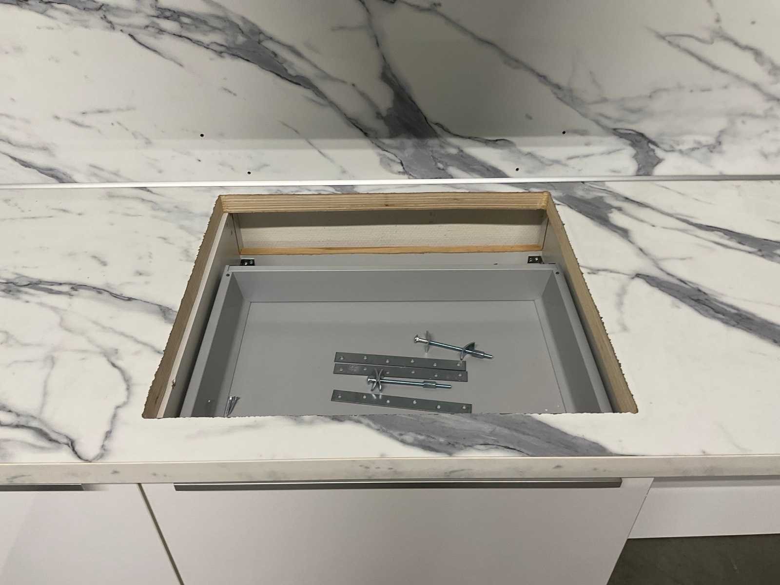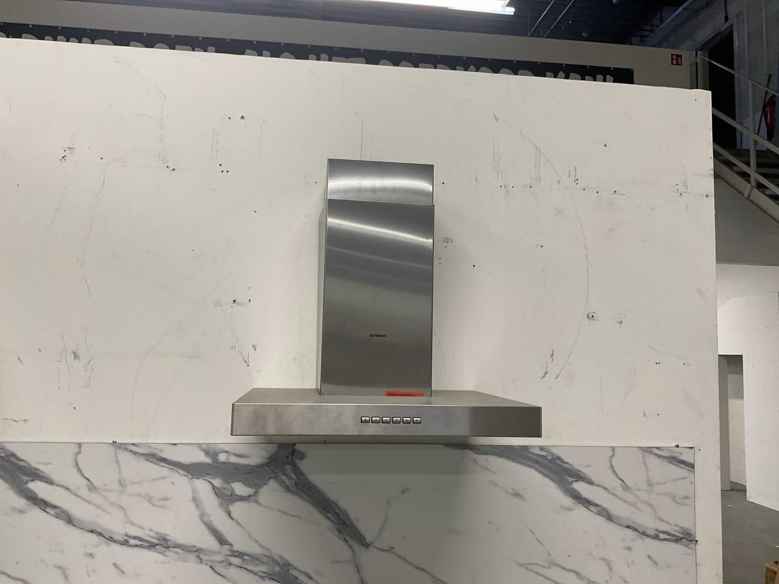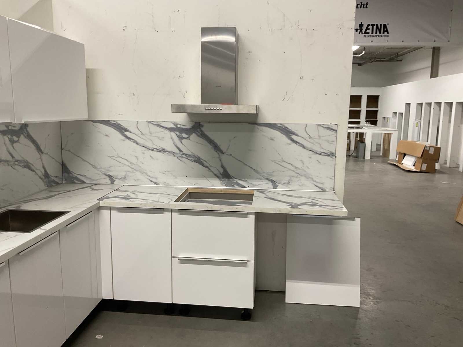 Indeling 2 onderkasten; 1 hoekkast; 1 ladenkasten met binnenlade; deurfront voor vaatwasser; 2 boven kasten met klepdeur; Apparatuur: Siemens wandafzuigkap; type LC67BA532; reeds gedemonteerd en ingepakt op pallets; werkbladen, plinten en hoge kasten niet ingepakt Nee Lengte: 216cm Breedte: 233cm Kraan: geen Werkblad hoogte: 91cm Aanrechtblad: Multiplex met hardkunststof toplaag marmer decor Hoofdkleur: hoogglans wit