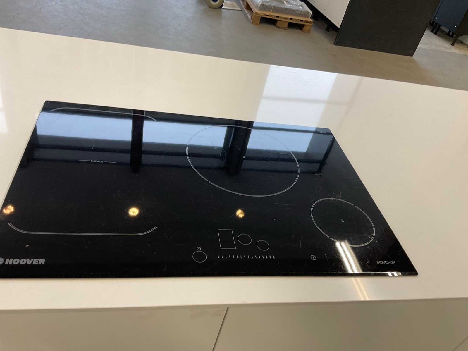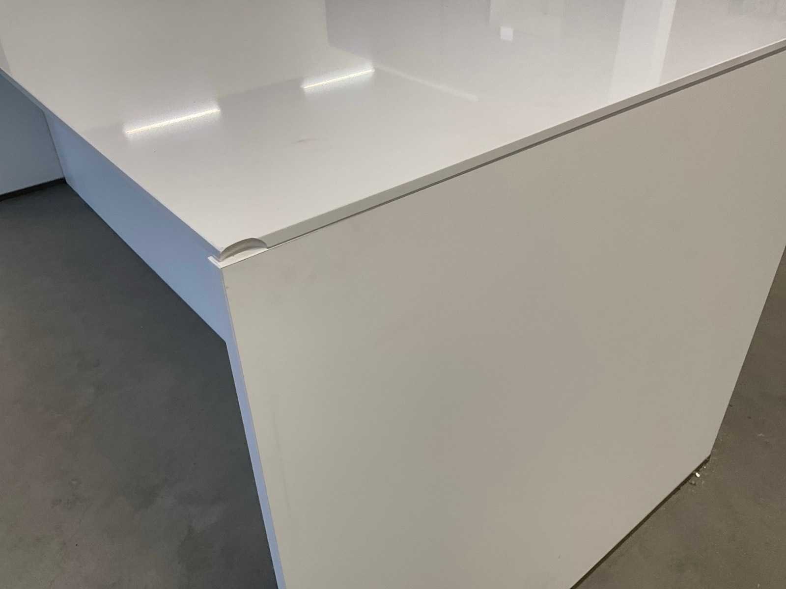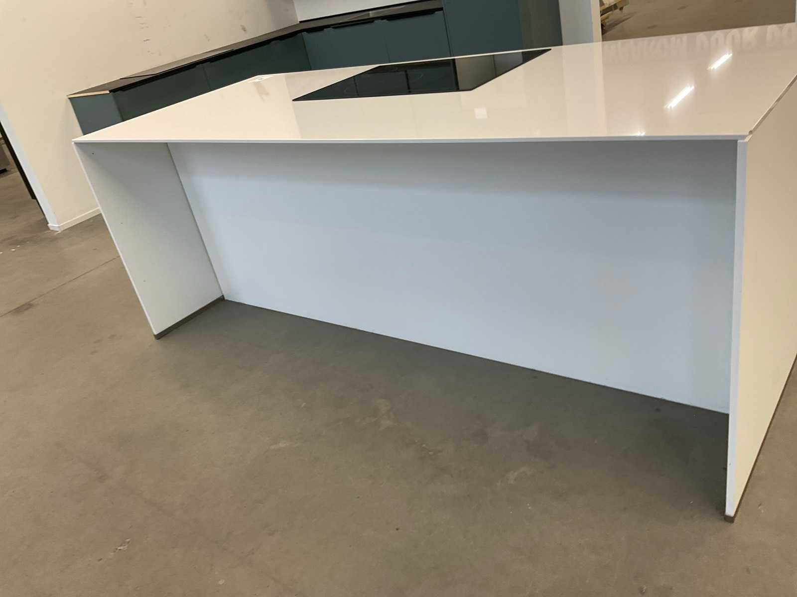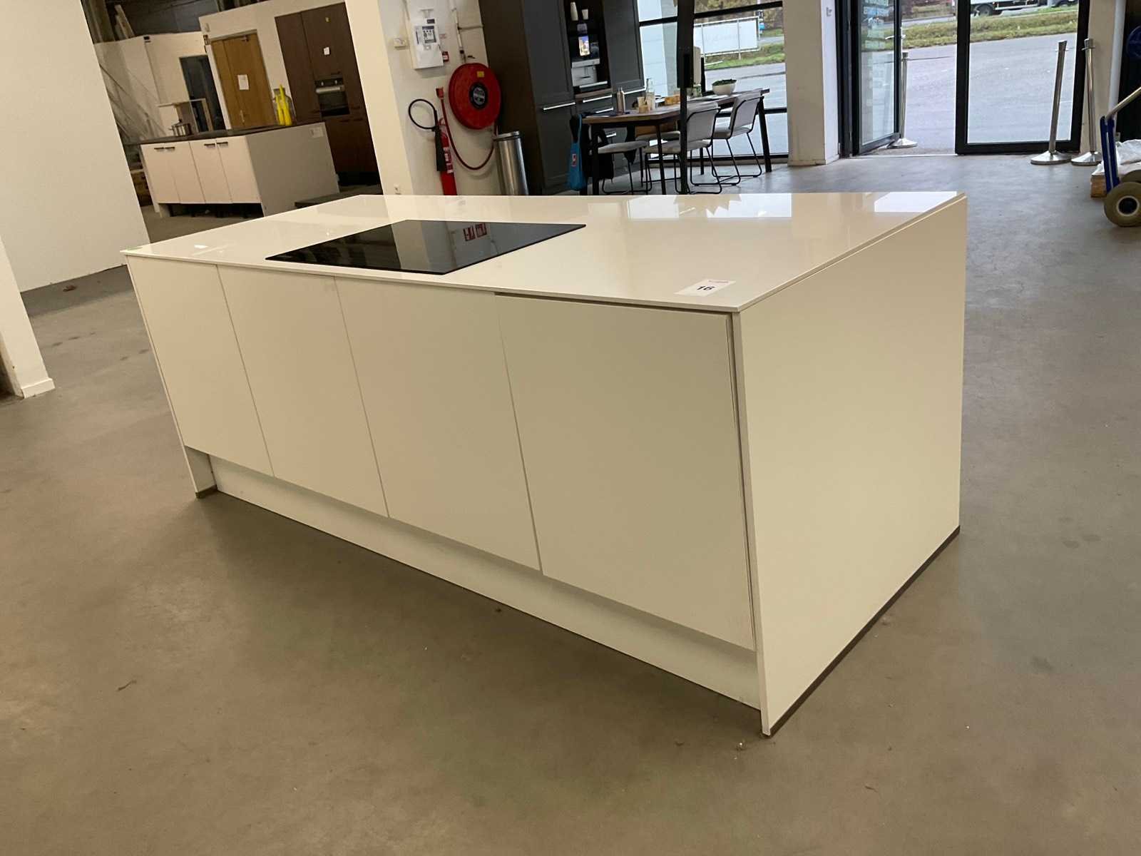 Indeling: 3 onderkasten en een zitdeel; Apparatuur: Hoover inbouw inductiekookplaat; type HPI 82; werkblad 1 hoekje beschadigd; reeds gedemonteerd en ingepakt op pallets; werkbladen, plinten en hoge kasten niet ingepakt Nee Lengte: 244cm Breedte: 100cm Werkblad hoogte: 93cm Aanrechtblad: composiet Hoofdkleur: mat wit
