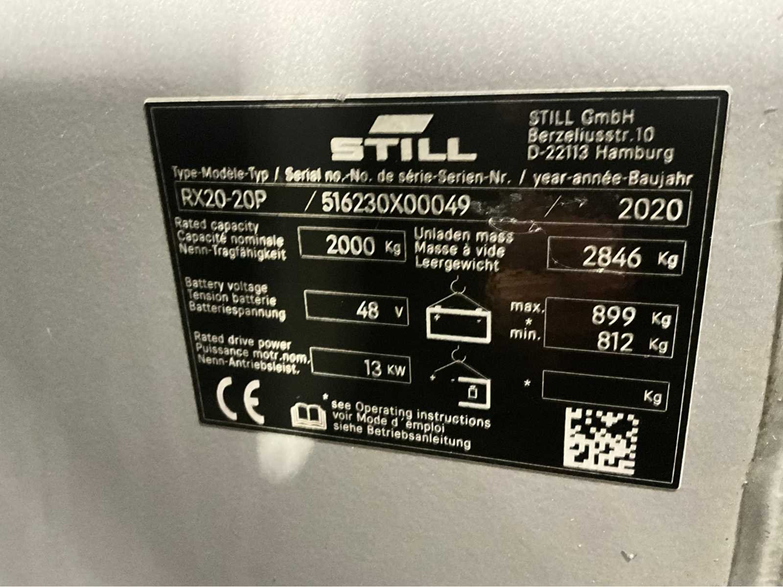 Extra opties : Led verlichting , Blue spot voor , Red spot achter , Non-marking banden , radio , Nee Merk: Still Type: RX20-20P Bouwjaar: 2020 Serienummer: 516230X00049 Mast: Triple Soort band: Volrubber banden Aantal wielen: 4 Free-lift: true Side-shift: true Triple mast: true Eigen gewicht: 3745kg Hefvermogen: 2000kg Hefhoogte: 4700mm Vol rubber banden: true Totale afmeting L: 3080mm Totale afmeting Breedte: 1110mm Totale afmeting Hoogte: 2170mm