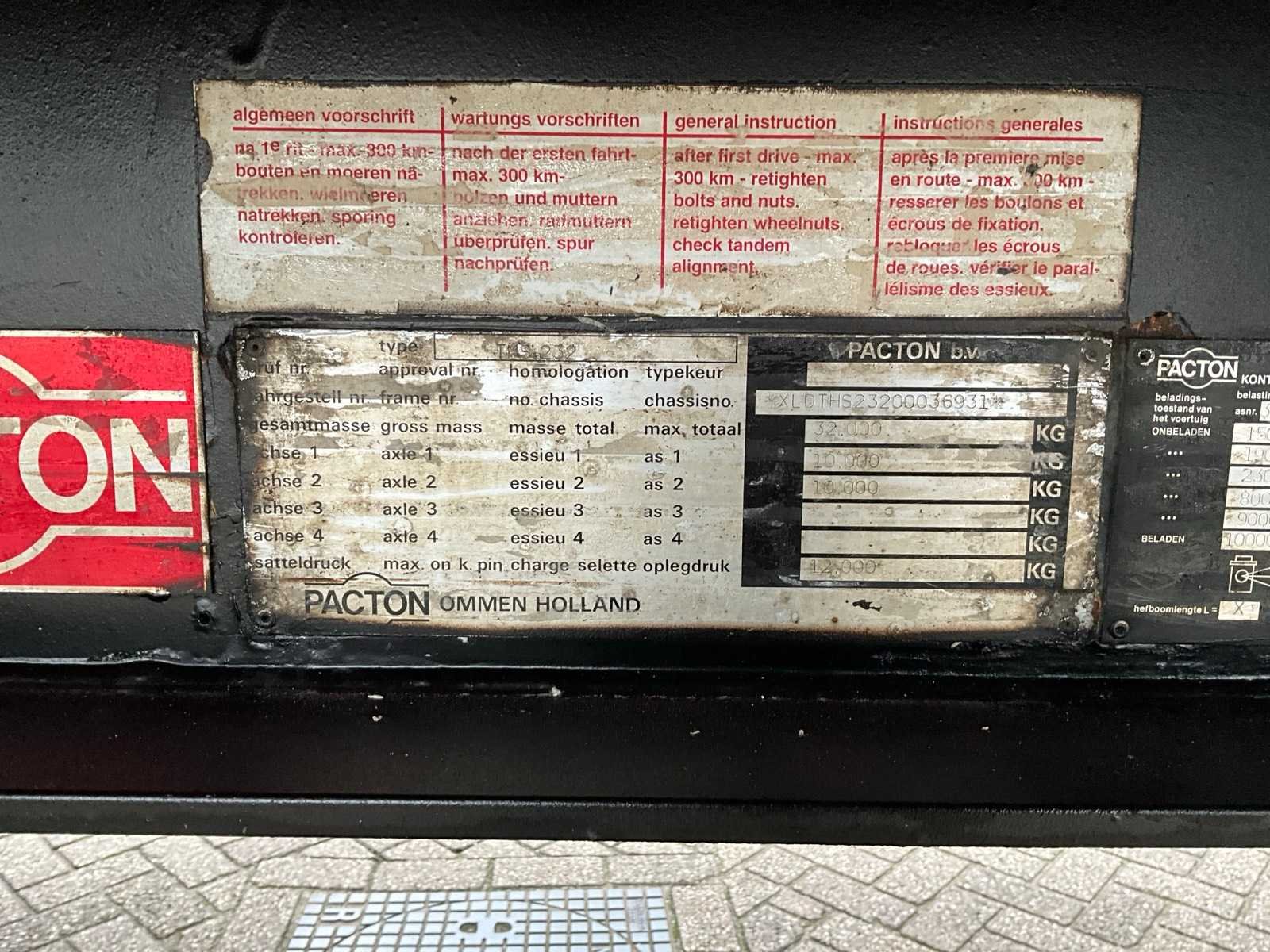 2x 7-polige stekker, ABS stekker, duomatic en luchthandjes, Rema stekker, 2x 10T BPW AS, voorste as lift as, achterste as gestuurd, trommelremmen, AMA laadklep, automatisch smeersysteem Nee Merk: Pacton Type: THS232 Bouwjaar: 1996 Chassisnummer VIN: XLDTHS23200036931 Kenteken: OD-81-YJ Datum eerste toelating (NL): 1996-07-23 Datum eerste toelating: 1996-07-23 APK vervaldatum: 2025-11-22 Aantal assen: 2 Laadvermogen: 23200kg Hydraulische laadklep: true Eigen gewicht: 8800kg Totale afmeting L: 10500mm Totale afmeting Breedte: 2550mm Totale afmeting Hoogte: 4000mm Zelf rijdend exporteren: Niet mogelijk No self drive export!: true