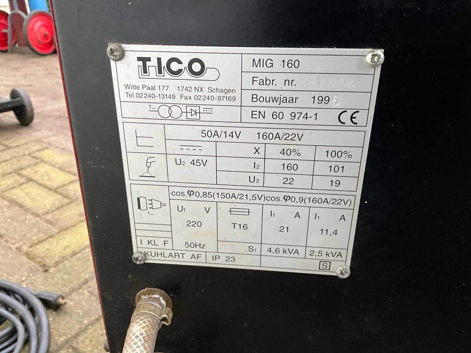 Nee Merk: Tico Type: MIG160 Bouwjaar: 1996 Max. lasvermogen: 160A Aansluiting: 230V Afmeting l: 900mm Afmeting b: 400mm Afmeting h: 700mm