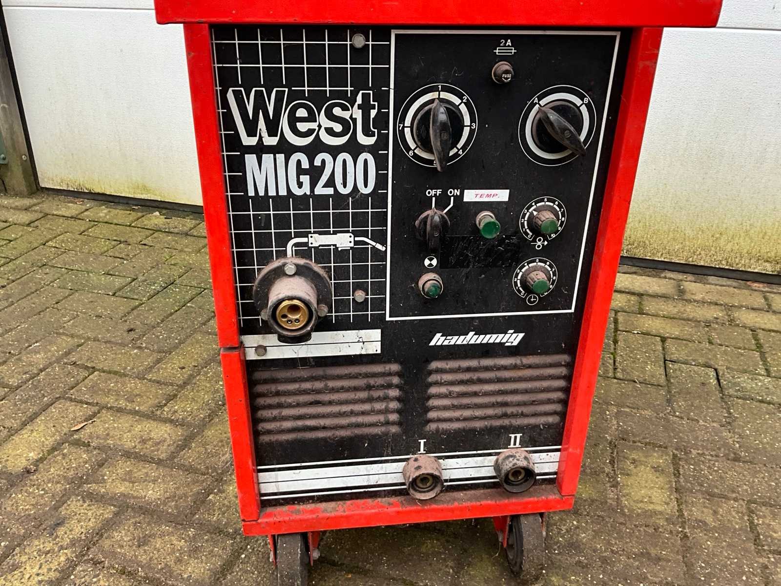 Defect Nee Merk: West Type: MIG200 Max. lasvermogen: 200A Aansluiting: 380V Afmeting l: 1000mm Afmeting b: 450mm Afmeting h: 800mm