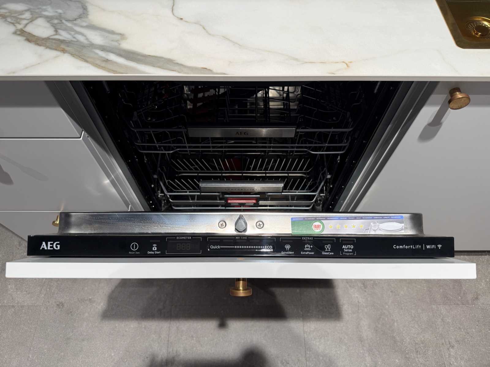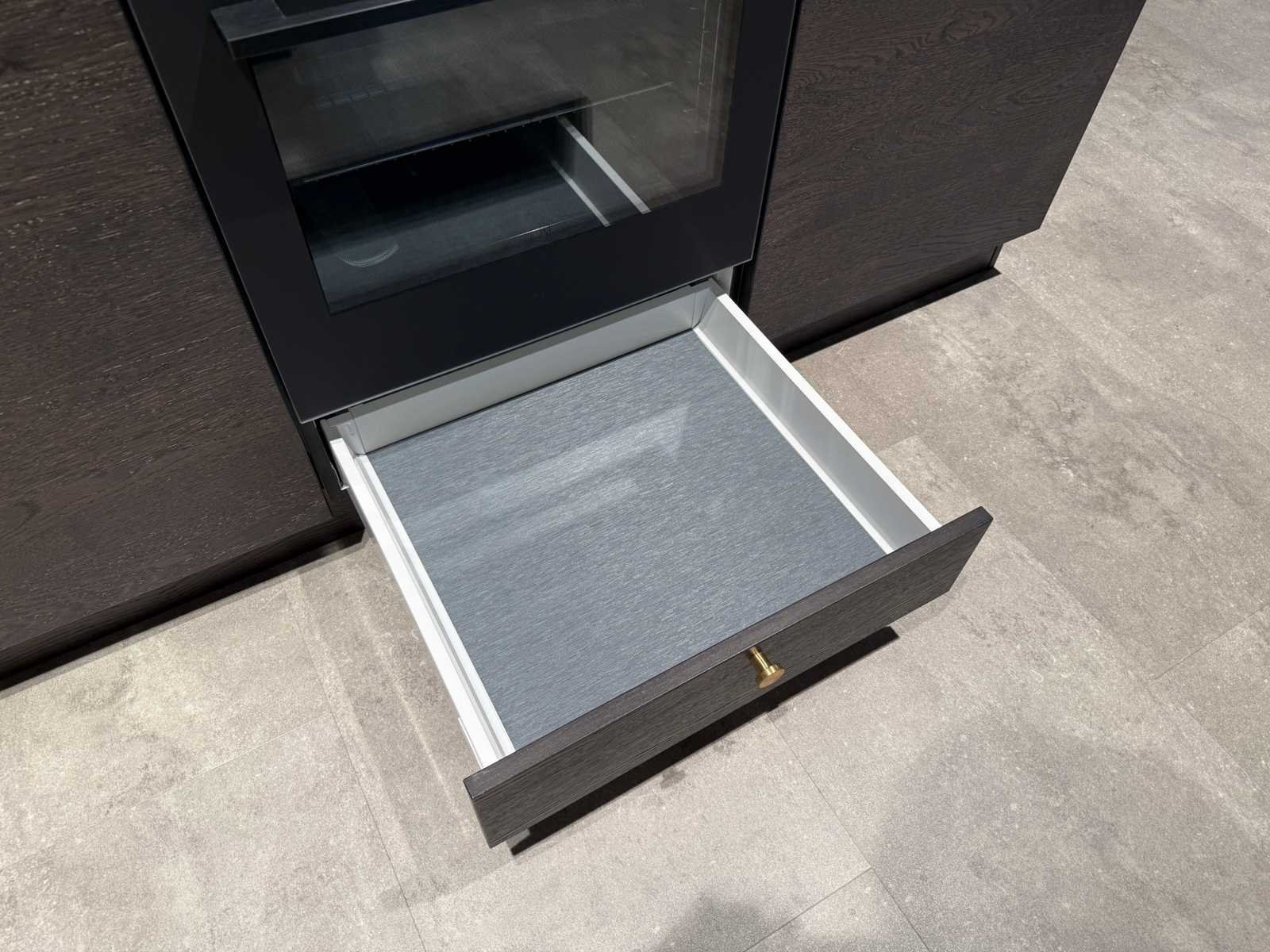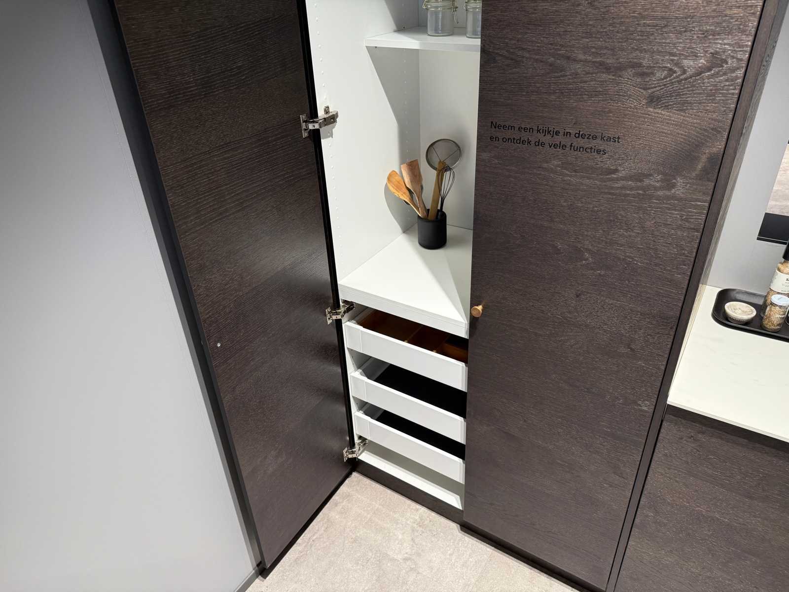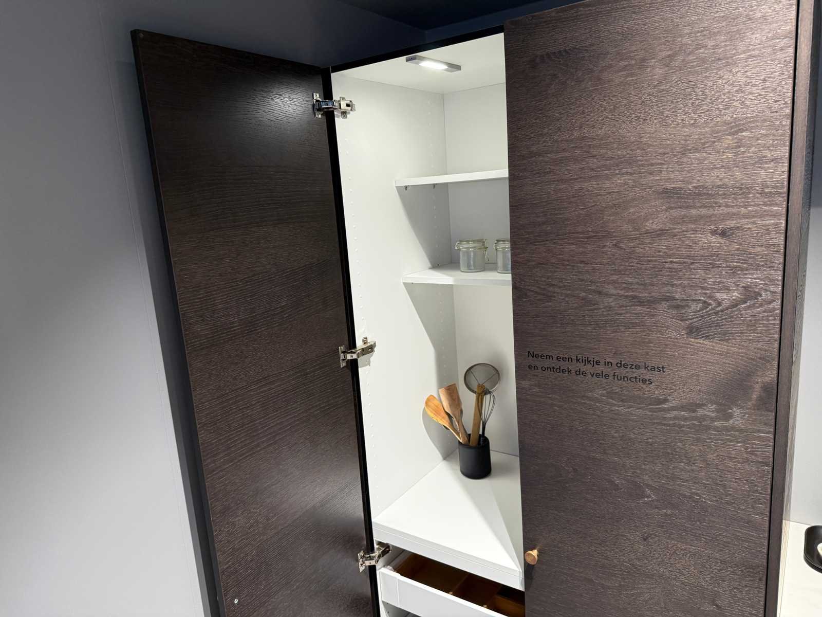 Keuken dient gedemonteerd te worden op locatie Nee Merk: Kvik Type keukenopstelling: Schiereiland Lengte: 287,1cm Breedte: 60cm Hoogte: 220cm Werkblad hoogte: 93,2cm Aanrechtblad: Keramiek Fornuis: AEG IPE8453SFB Koelkast: AEG SKB582F1AF Softclose: true Oven: AEG BPK742280T Afzuigkap: Novy Cloud 232 Vaatwasser: AEG FSS5261XZ Lengte kookeiland: 203,5cm Breedte kookeiland: 108,5cm Hoogte kookeiland: 93,2cm Kleur: Veda dark oak + white