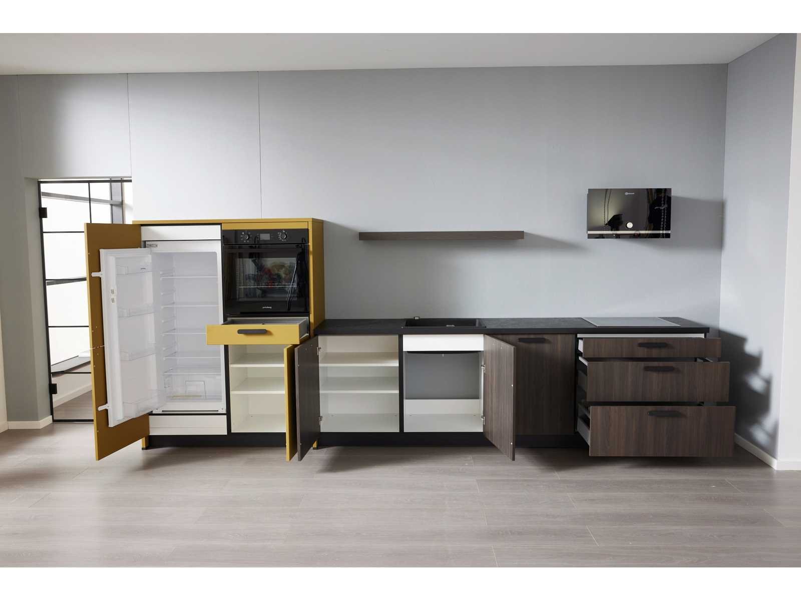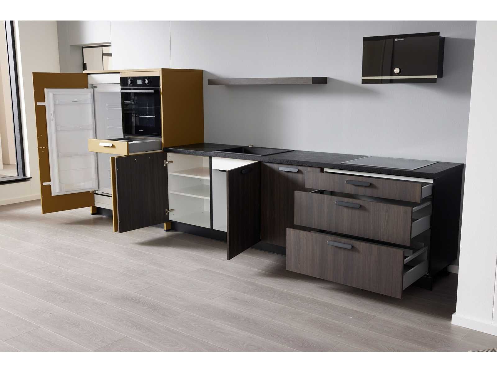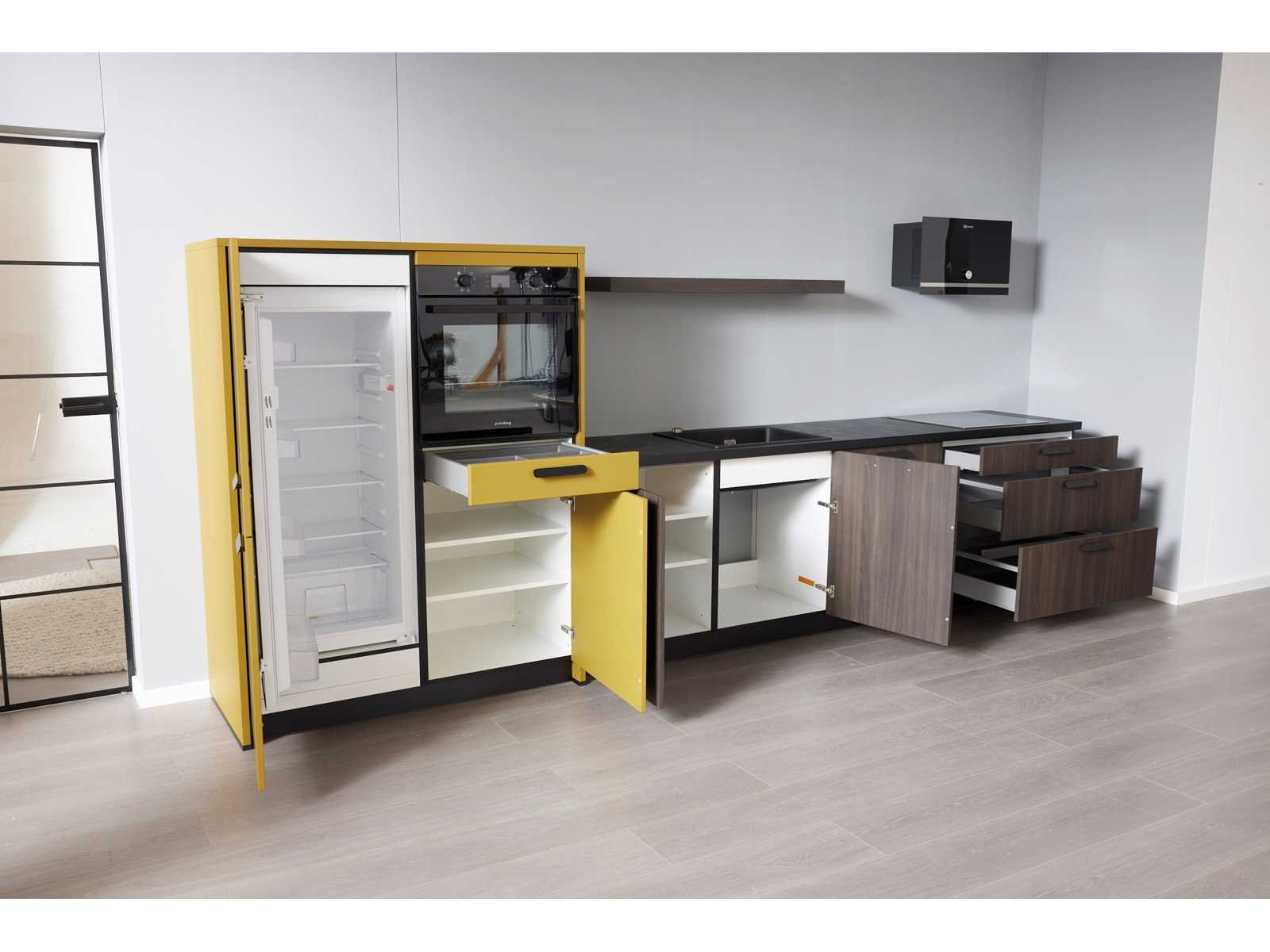 Keuken komt zonder apparatuur; reeds gedemonteerd en ingepakt op pallets. (afstapelen, omruilen of statiegeld per pallet); Pallets zijn niet inbegrepen; statiegeld betalen bij afhalen, of pallets afstapelen; werkblad niet ingepakt op pallets (25-SCH-02553) No Merk: Schüller Type keukenopstelling: Recht Lengte: 395cm Breedte: 60cm Hoogte: 159,5cm Werkblad hoogte: 85,4cm Aanrechtblad: Onyxzwart structuur Softclose: true Kleur: Eiken siena synchroonprint imitatie