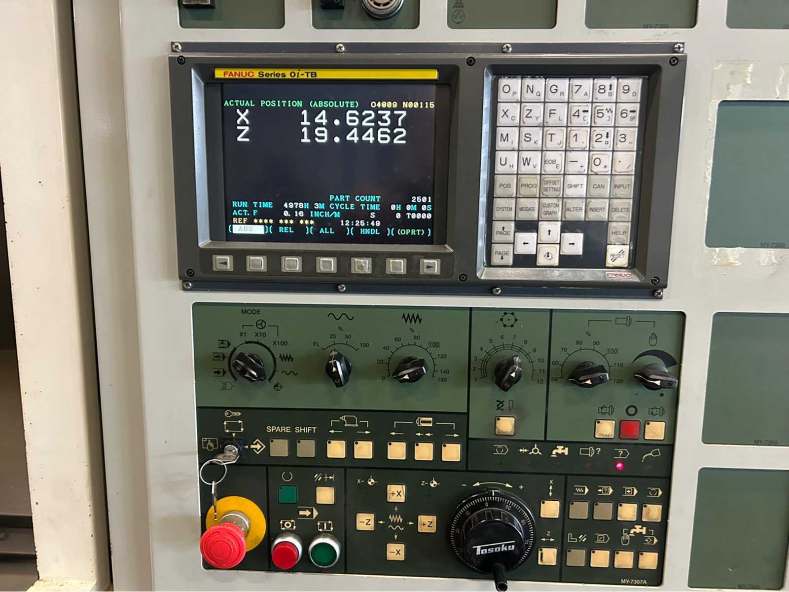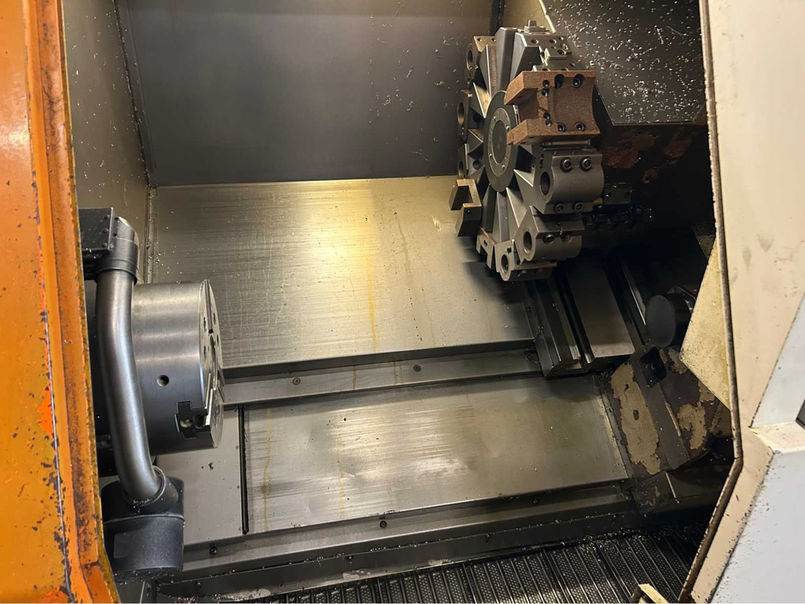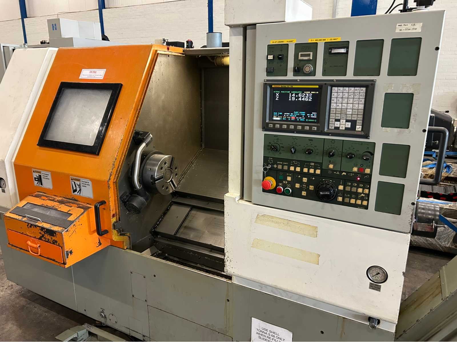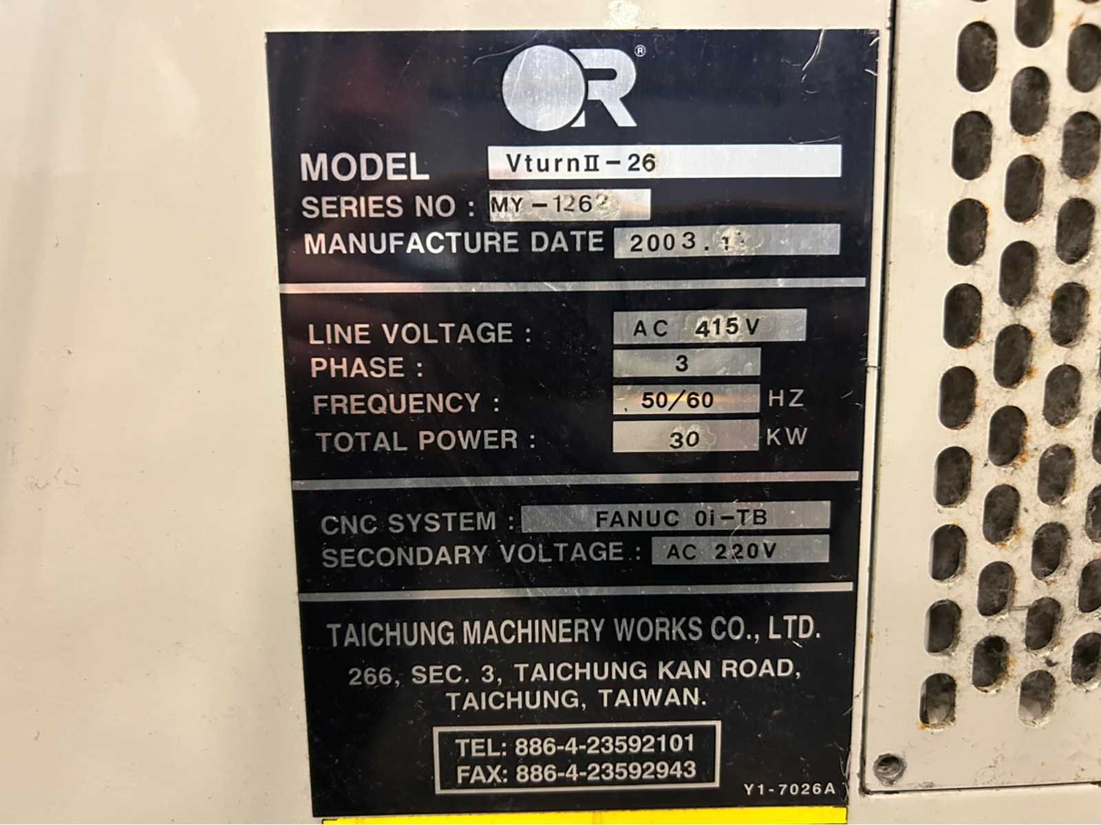Gereedschap in de toren inbegrepen! No Merk: Victor Type: Vturn-26 Bouwjaar: 2003 Serienummer: MIJN-1262 Draai: 370mm Draailengte: 610mm Holle spil Ø: 86mm Snelheid tot n =: 3500rpm Aantal gereedschapwisselstations: 12 Koelmiddelpomp: true Spanentransporteur: true CNC-besturing, merk, type: Fanuc 0i-TB Afgelezen urenstand: 7665 Motorvermogen (kW): 18.5kW Aansluiting: 400V Machinegewicht: 5800kg Afmeting l: 2800mm Afmeting b: 1780mm Afmeting h: 1853mm