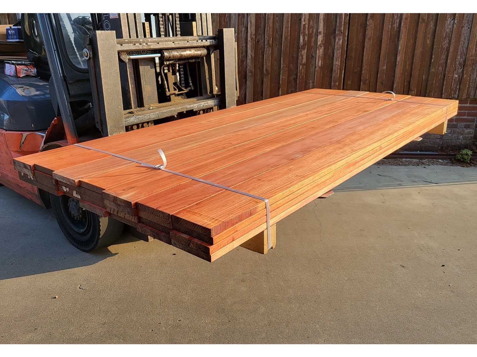 Mooie Koraalrode Padouk planken, A kwaliteit. Voor het maken van een vlonder, poort of toe te passen gevelbekleding. No Kopmaat: 21 x 140 mm Breedte: 140mm Hoogte: 21mm