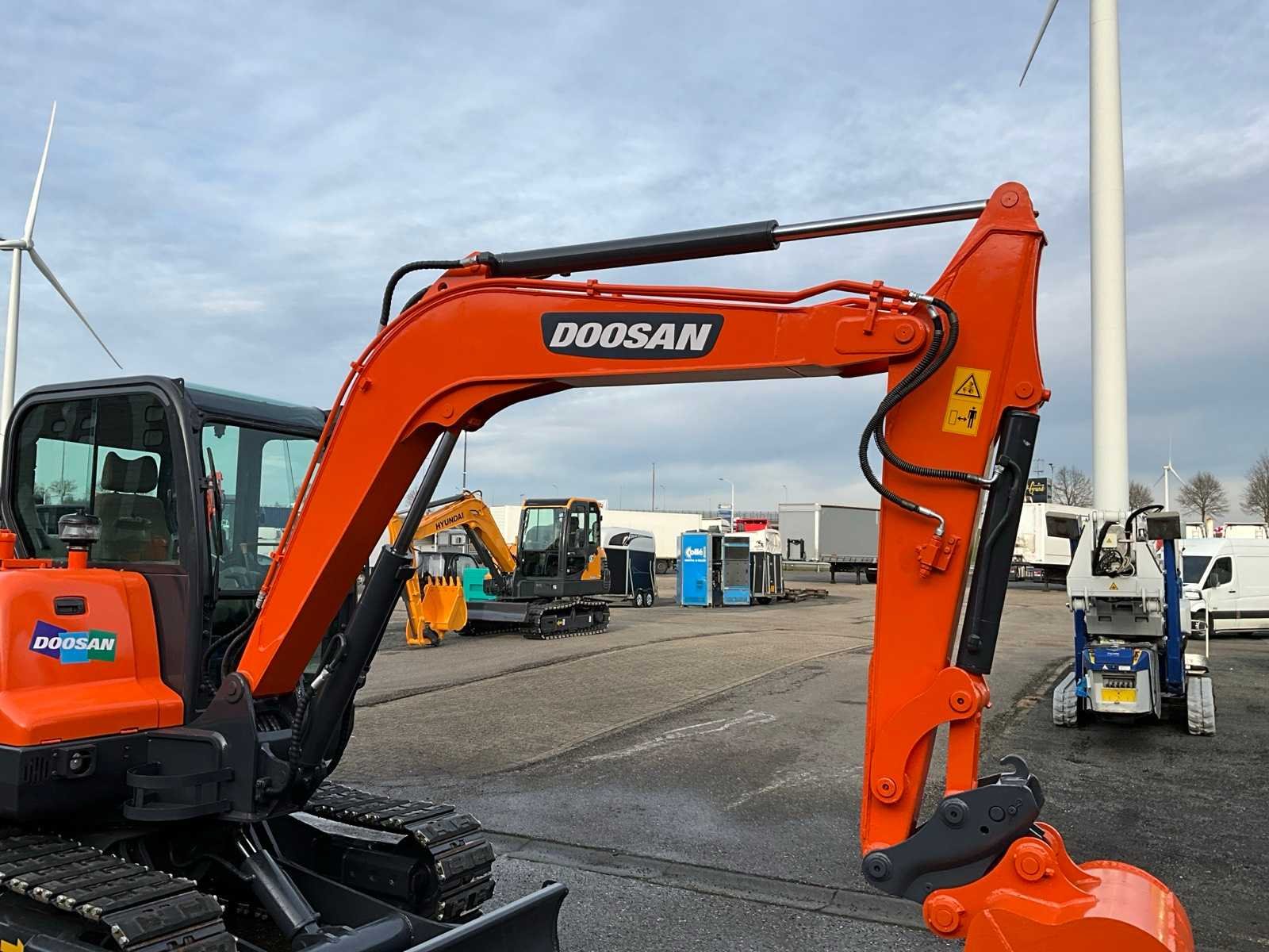 Dieplepelbak met tanden 700mm, mechanische snelwissel, extra hydraulische functie, schuifblad, 2e rijsnelheid Nee Merk: Doosan Type: DX55-9C Bouwjaar: 2018 Serienummer: 25961 Merk motor: Yanmar Motorvermogen (kW): 36kW Aantal cilinders: 4 Brandstof: Diesel Bedrijfsgewicht: 5500kg Met graafbak: true Graafbak afm. b: 700mm Rups breedte: 380mm Cabine: true Afgelezen urenstand: 4900 Totale afmeting L: 6500mm Totale afmeting Breedte: 1900mm Totale afmeting Hoogte: 2700mm