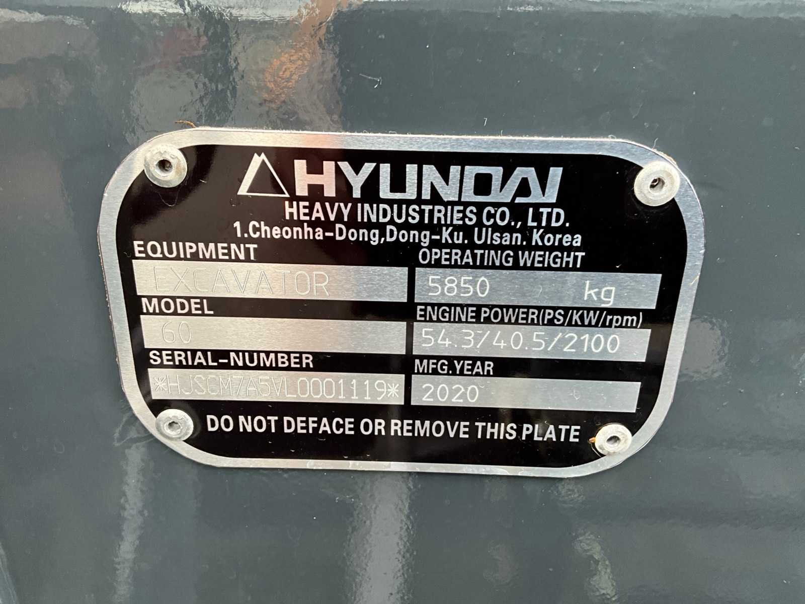 Dieplepelbak met tanden 700mm, mechanische snelwissel, extra hydraulische functie, schuifblad, 2e rijsnelheid Nee Merk: Hyundai Type: Robex 60 Bouwjaar: 2020 Serienummer: 1119 Merk motor: Yanmar Motorvermogen (kW): 40kW Aantal cilinders: 4 Brandstof: Diesel Bedrijfsgewicht: 5850kg Met graafbak: true Graafbak afm. b: 700mm Rups breedte: 400mm Cabine: true Afgelezen urenstand: 3534 Totale afmeting L: 6500mm Totale afmeting Breedte: 2000mm Totale afmeting Hoogte: 2700mm