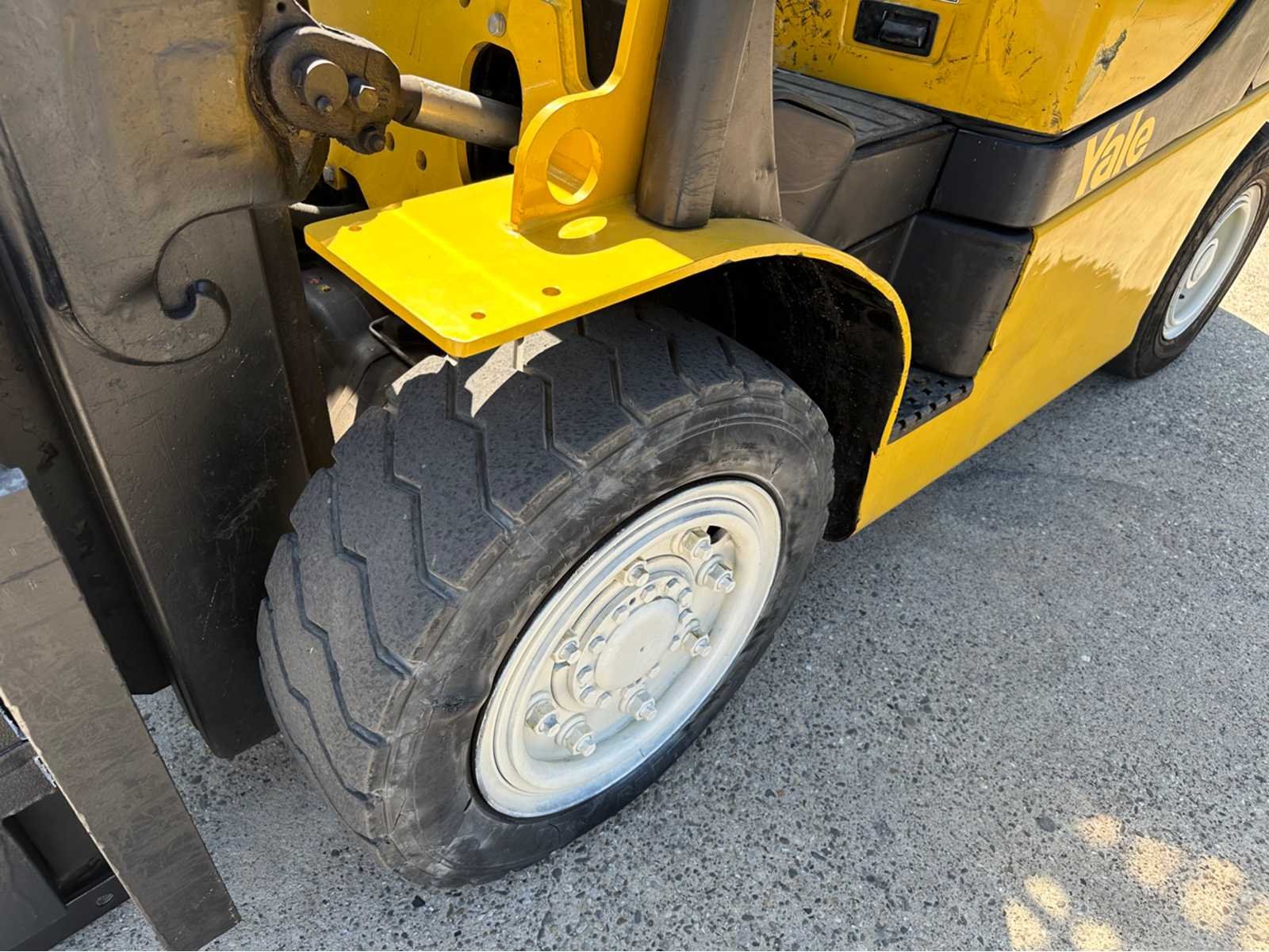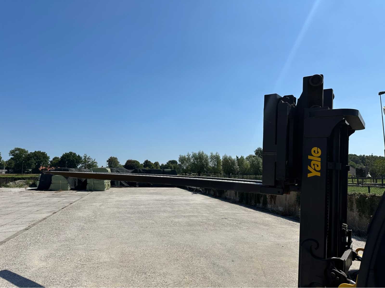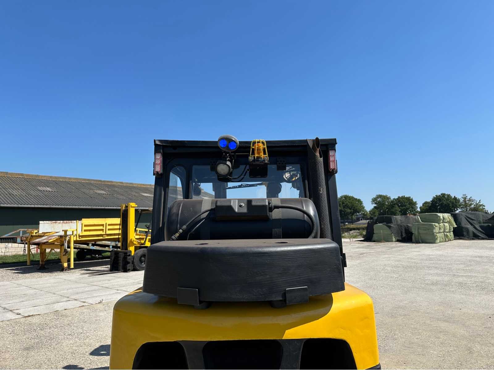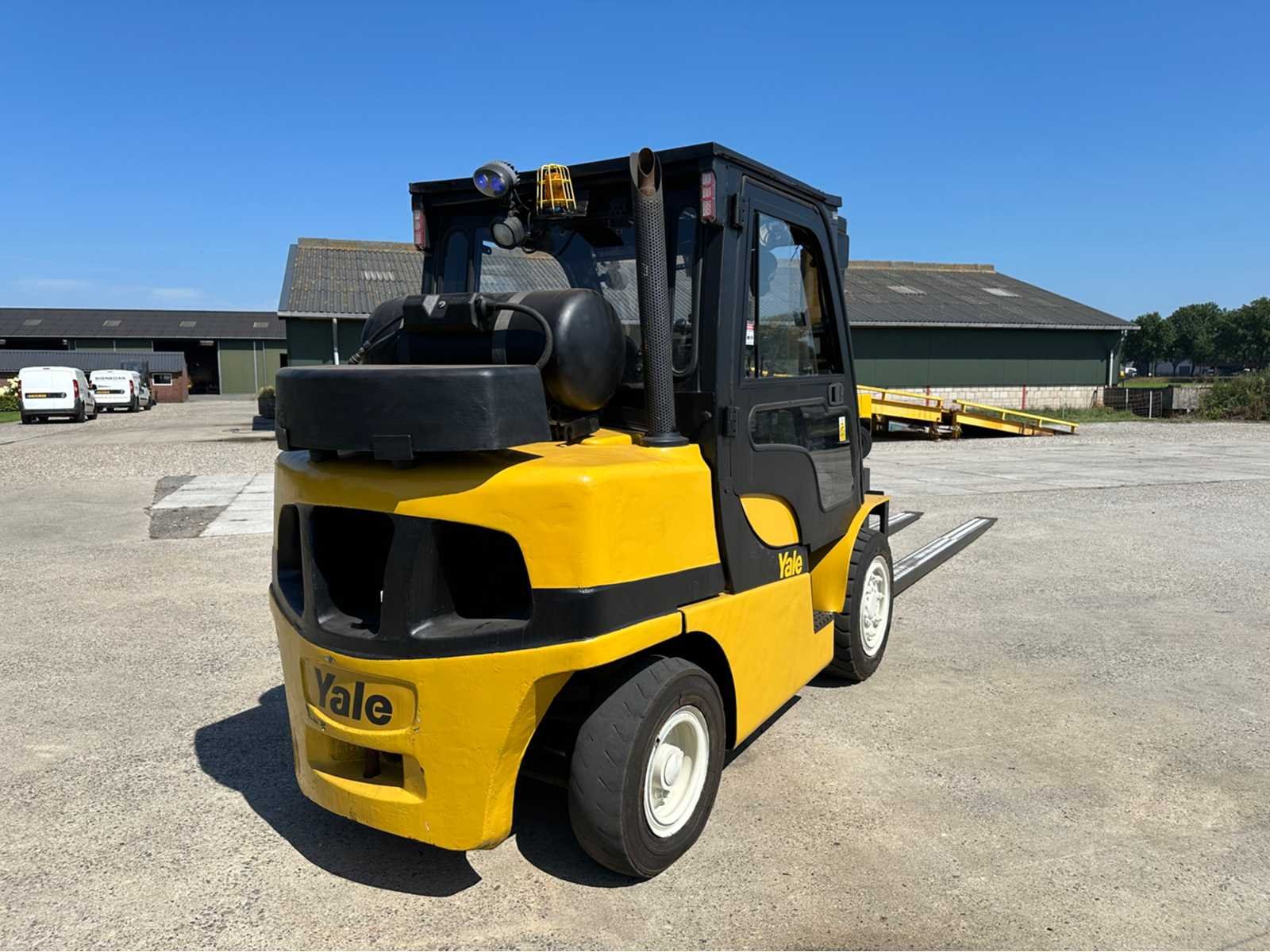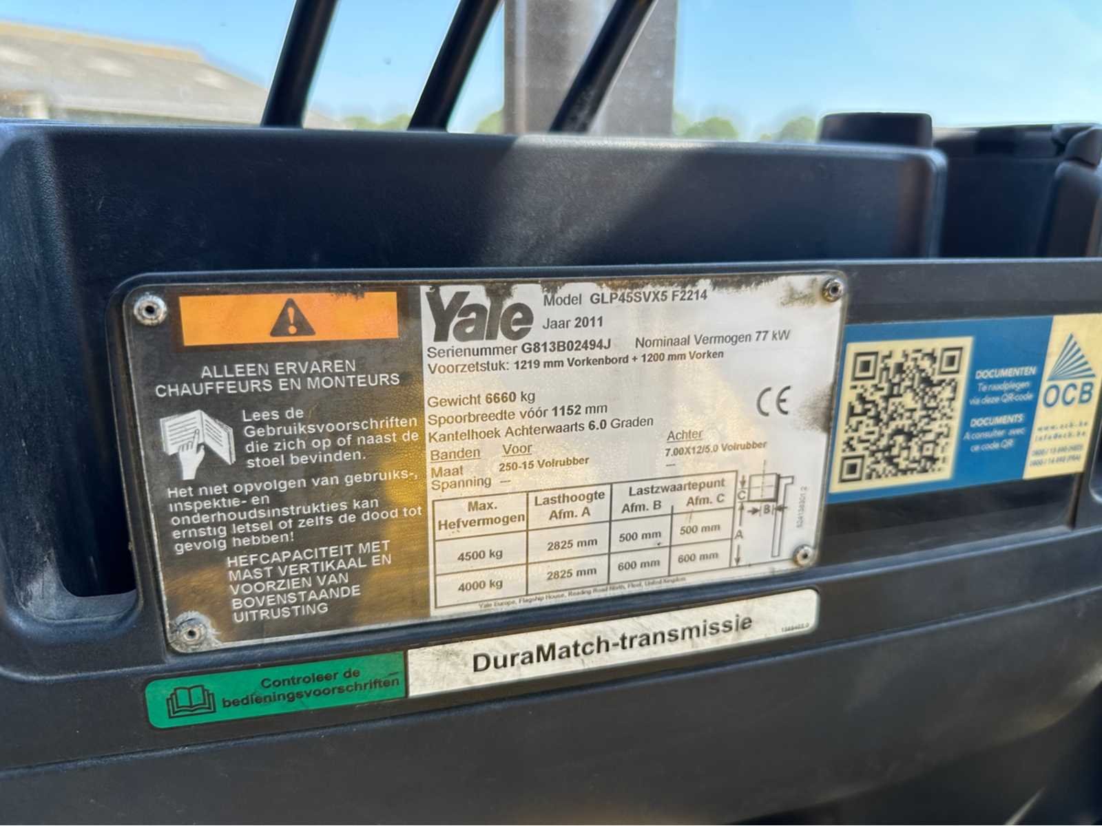 Motor: Kubota WG3800-L-C, Motorvermogen: 63,2 kW bij 2.400 tpm, Cilinderinhoud: 3,769 liter, Aantal cilinders: 4, Emissienorm: Stage IIIA, Transmissie: Hydrostatisch (EW-type),Gewicht: 6.830 kg, Banden: Superelastisch (SE), Draaicirkel: 2,62 m, Maximale rijsnelheid: 25,3 km/u, Cabine: ROPS/FOPS gecertificeerd, zonder lange vorken en contragewicht; Nee Merk: Yale Type: GLP45S Bouwjaar: 2011 Serienummer: G813B02494J Brandstof: LPG Free-lift: true Duplex mast: true Hefvermogen: 4500kg Luchtbanden: true Minimale doorrijhoogte: 2200mm LPG: true