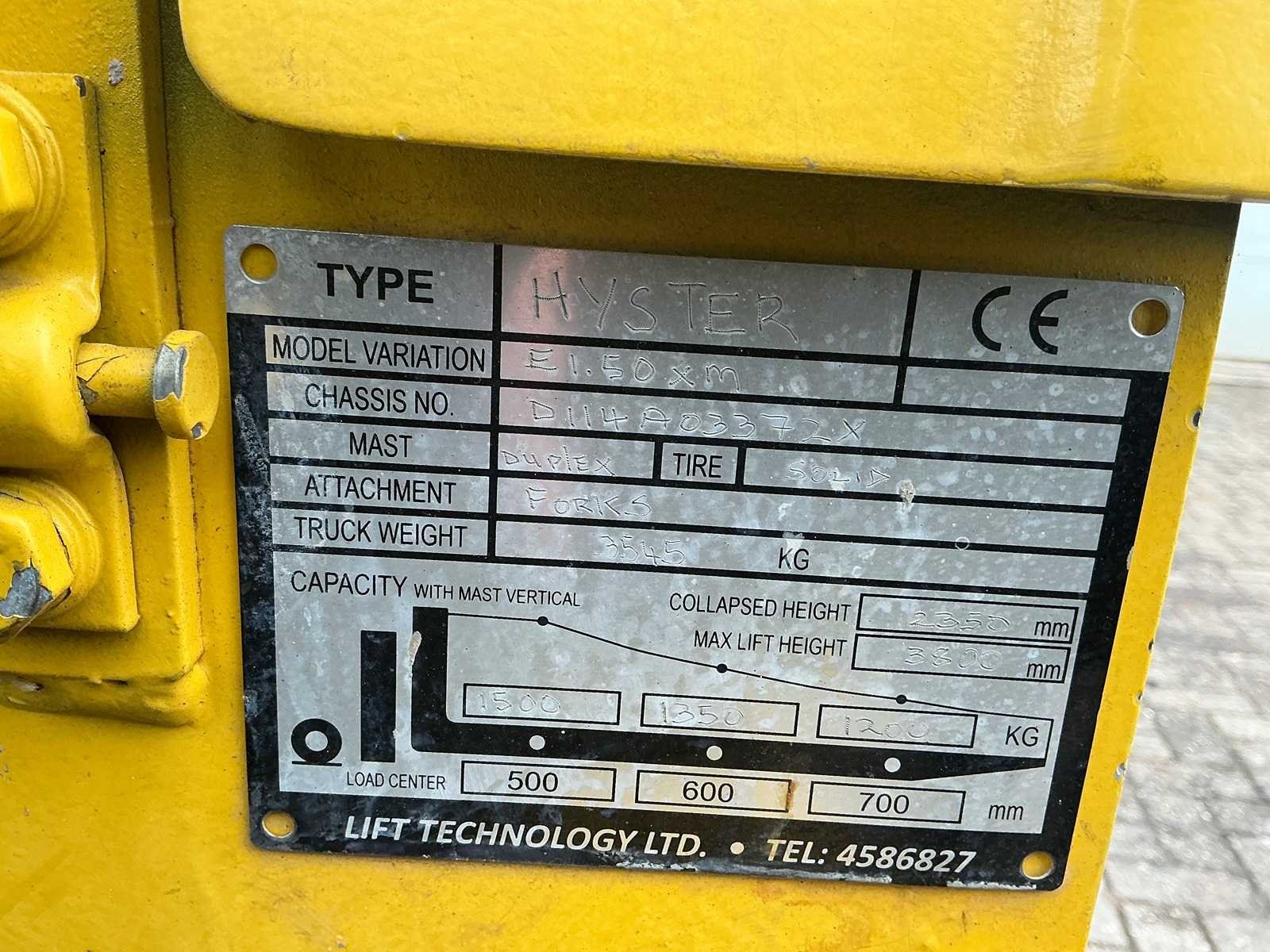 Voorzien van: accu-lader, duplex mast, 1500Kg hefvermogen, verstelbare stuurkolom, volrubber banden, totale breedte 1075 mm, hoogte 2205mm, spanning 48 V, tractiemotor 8,7 kW. Nee Merk: Hyster Type: E1.50XM Serienummer: D114A03372X Brandstof: Elecktrisch Mast: Duplex Soort band: Volrubber Aantal wielen: 4 Accu lader: true Duplex mast: true Eigen gewicht: 3545kg Hefvermogen: 1500kg Lepellengte: 1000mm Max. hefhoogte: 3800mm Vol rubber banden: true Minimale doorrijhoogte: 2360mm Totale afmeting L: 1920mm Totale afmeting Breedte: 1300mm Totale afmeting Hoogte: 2500mm