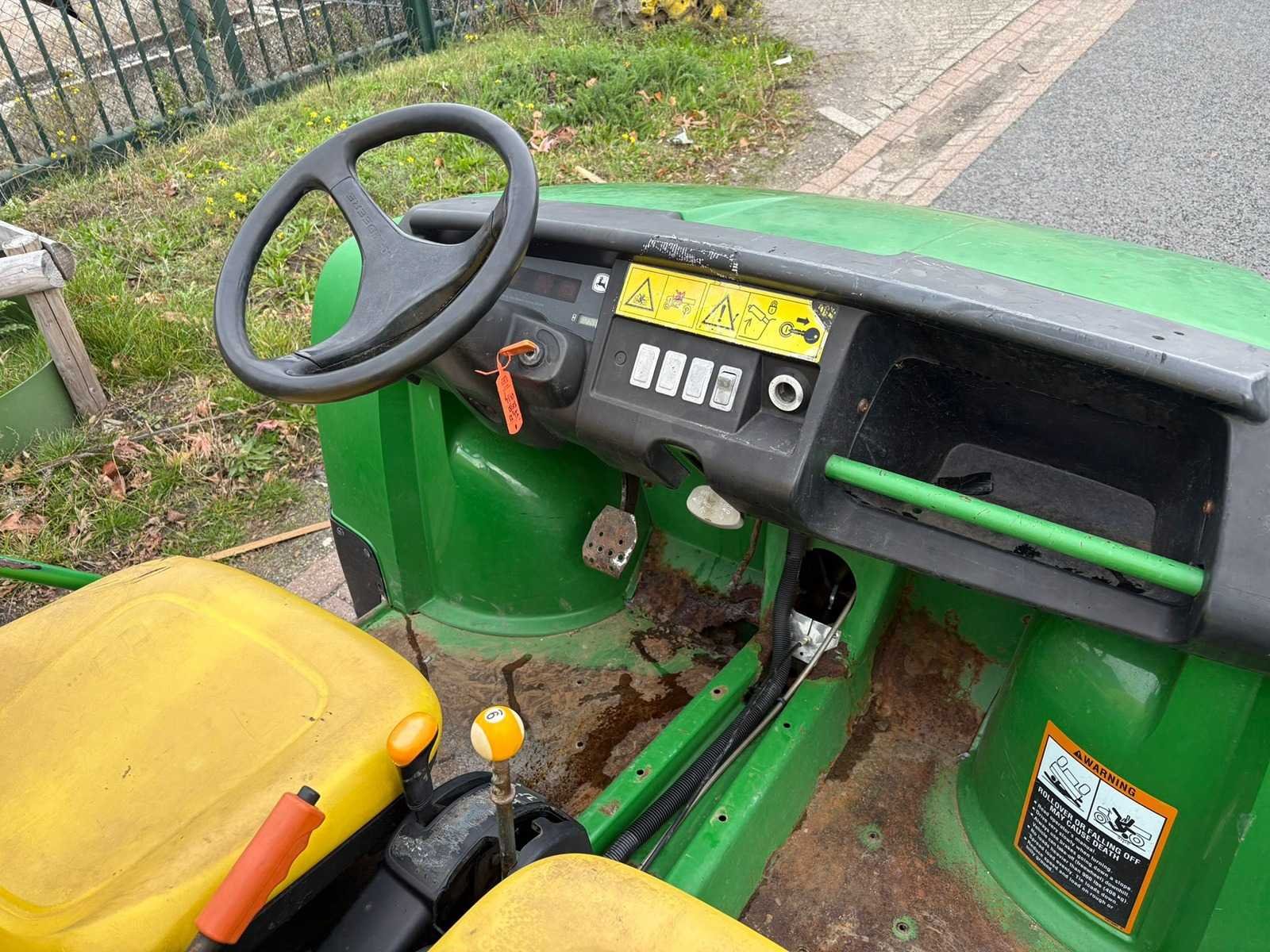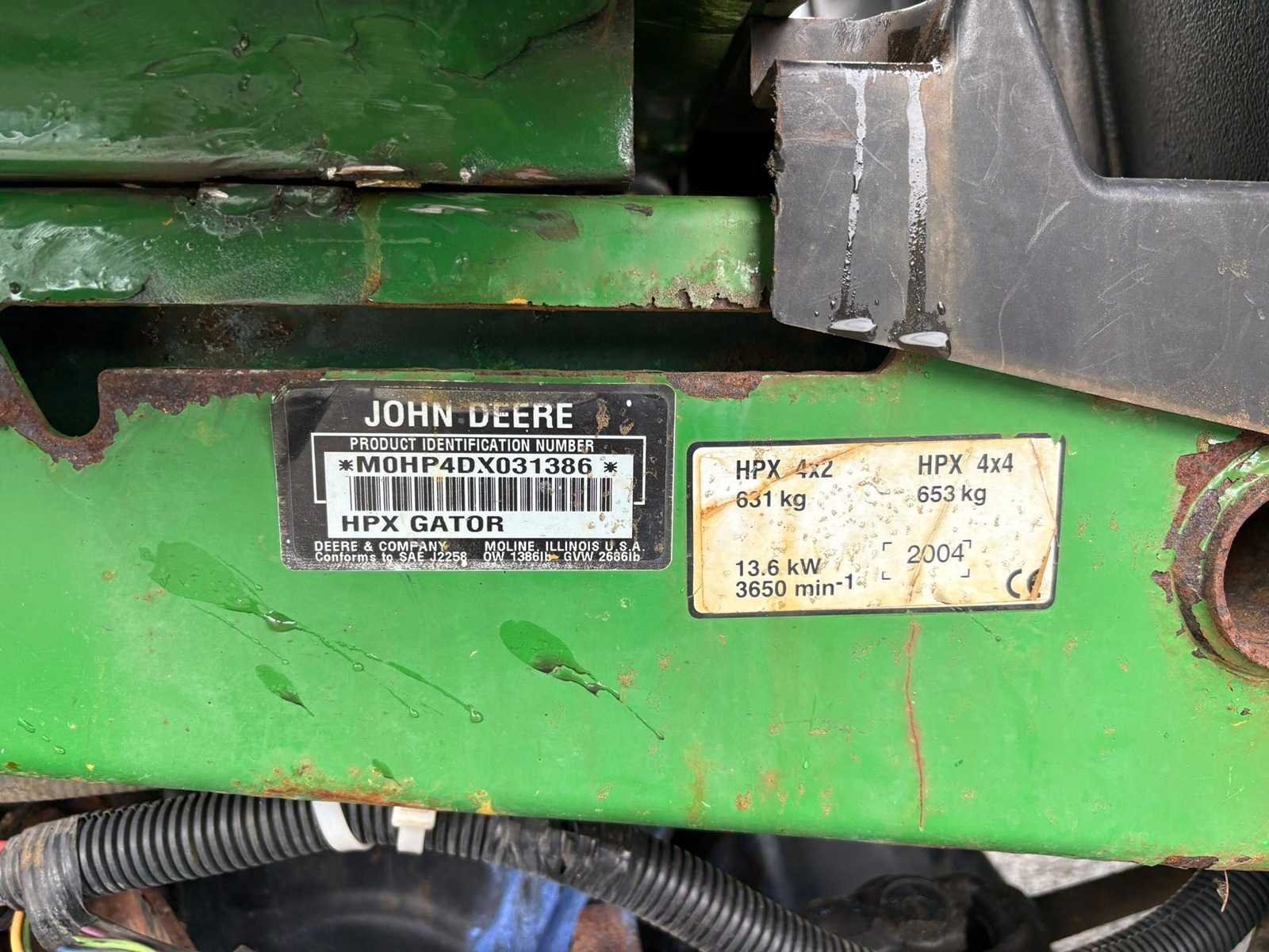 Voorzien van: 854 cc, 3 cilinders, 4-takt, diesel, 2 zitplaatsen, trekvermogen 590kg, laadvermogen 635kg, 2-traps CVT (continu variabele transmissie), onafhankelijke vering met McPherson-veerpoot, lengte 2,87m, doorrijhoogte 1,87m, breedte 1,51m, geen kenteken, mist een steekas linksvoor. Nee Merk: John Deere Model: Gator HPX Bouwjaar: 2004 Chassisnummer: M0HP4DX031386 Laadvermogen: 635kg Vermogen (kW): 13kW Kleur: Groen Gewicht: 653kg Lengte: 2900cm Breedte: 1500cm Hoogte: 1900cm