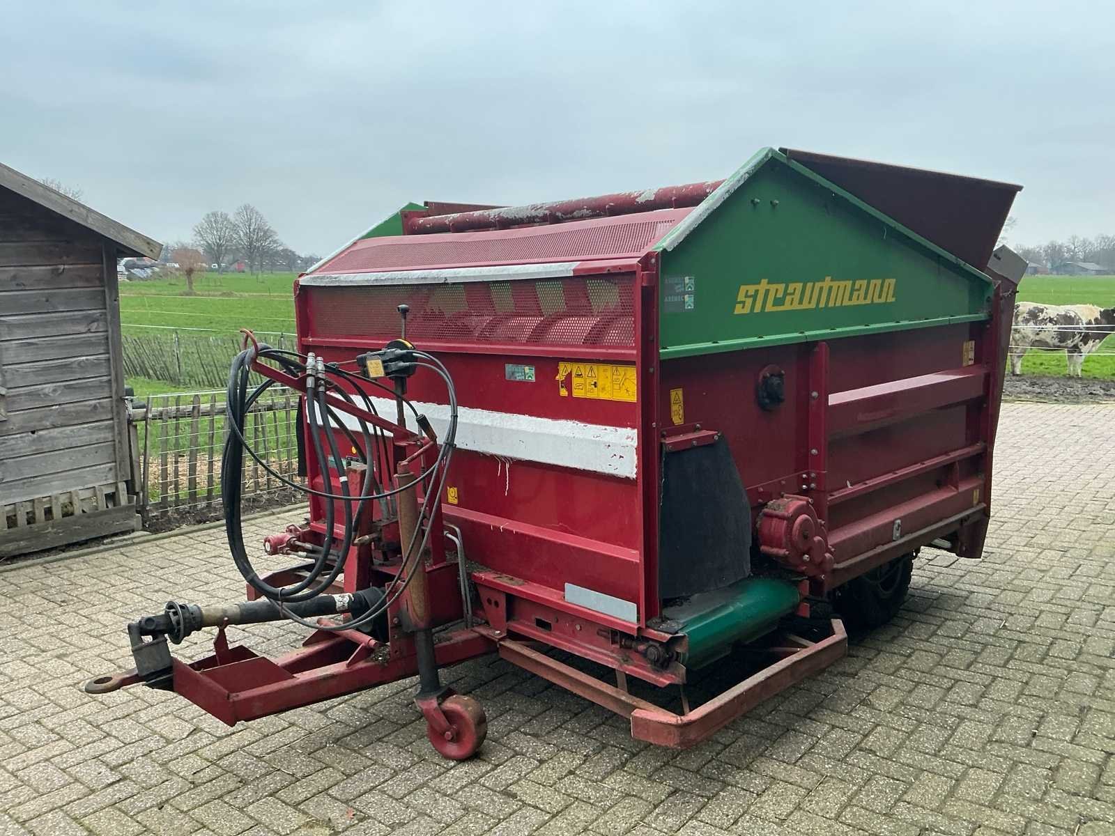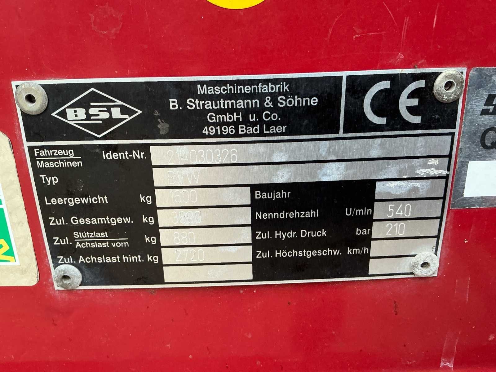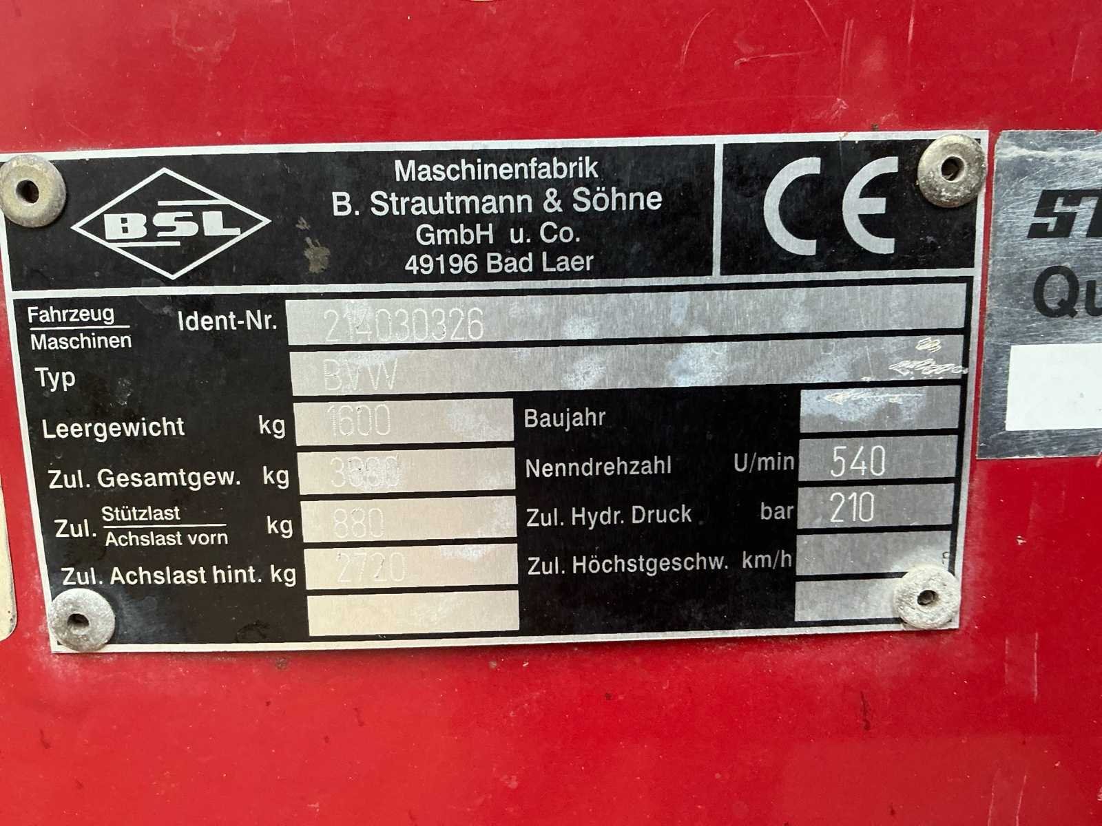 Voorzien van: Strautmann BVV getrokken voer-/strooimengwagen (bouwjaar ca. 1998–2003) met PTO 540 t/min, hydraulische aandrijving tot 210 bar, transportbandbodem met doseerrol, leeggewicht 1.600 kg, toegestaan totaalgewicht 3.600 kg, aslast achter 2.720 kg en steunlast 880 kg, CE-gekeurd. No Merk: Straumann Type: BVW Serienummer: 214030326 Eigen gewicht: 1600kg Totale afmeting L: 4000mm Totale afmeting Breedte: 2200mm Totale afmeting Hoogte: 2000mm