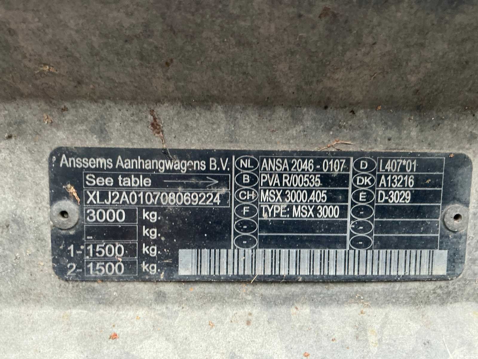 Laadvloer 4050x2000mm, bindhaken, reserve wiel, verstelbare handmatige lier, 7 polige stekker, rijplaten onder laadvloer, Nee Merk: Anssems Type: MSX3000 Model: Auto Transporter Bouwjaar: 2008 Chassisnummer: XLJ2A010708069224 Aantal assen: 2 Laadbak afmeting l: 4050cm Laadbak afmeting b: 2000cm Ledig gewicht: 536kg Laadvermogen: 2464kg Datum eerste toelating: 2008-04-26 Datum eerste toelating (NL): 2008-04-26 Kenteken: 59-WB-HG Hoogte: 950cm Lengte: 5600cm Breedte: 2080cm Nationaliteit documenten: Nederland