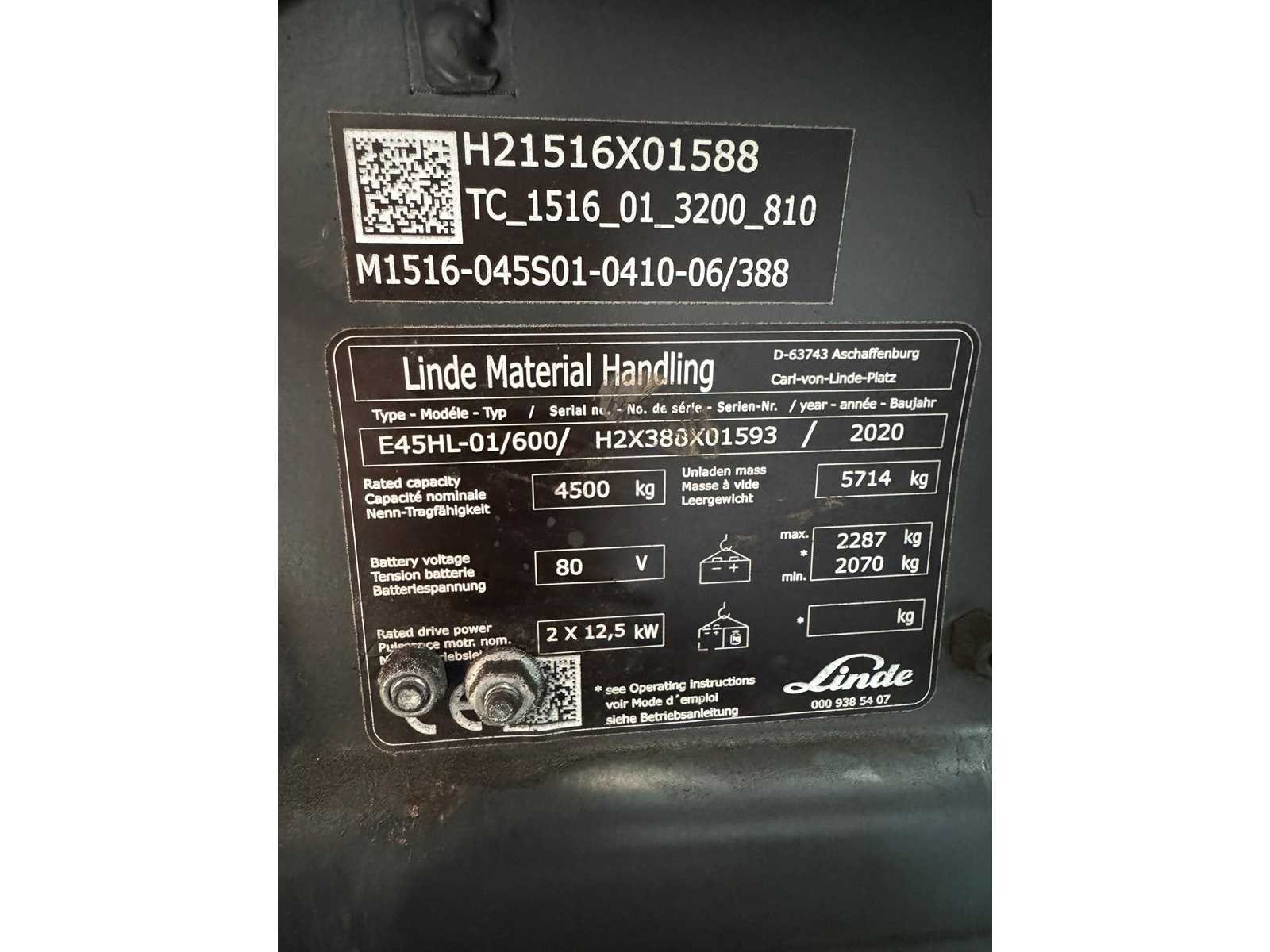 Bezichtiging op afspraak!! Nee Merk: Linde Type: E-45-HL-01-600 Bouwjaar: 2020 Serienummer: H-2-X-388-X-01593 Brandstof: Elektrisch Mast: Duplex Aantal wielen: 4 Side-shift: true Hydraulisch verstelbare lepels: true Duplex mast: true Eigen gewicht: 8001kg Hefvermogen: 4500kg Lepellengte: 1400mm Hefhoogte: 4100mm Vol rubber banden: true Totale afmeting L: 4350mm Totale afmeting Breedte: 1450mm Totale afmeting Hoogte: 2990mm