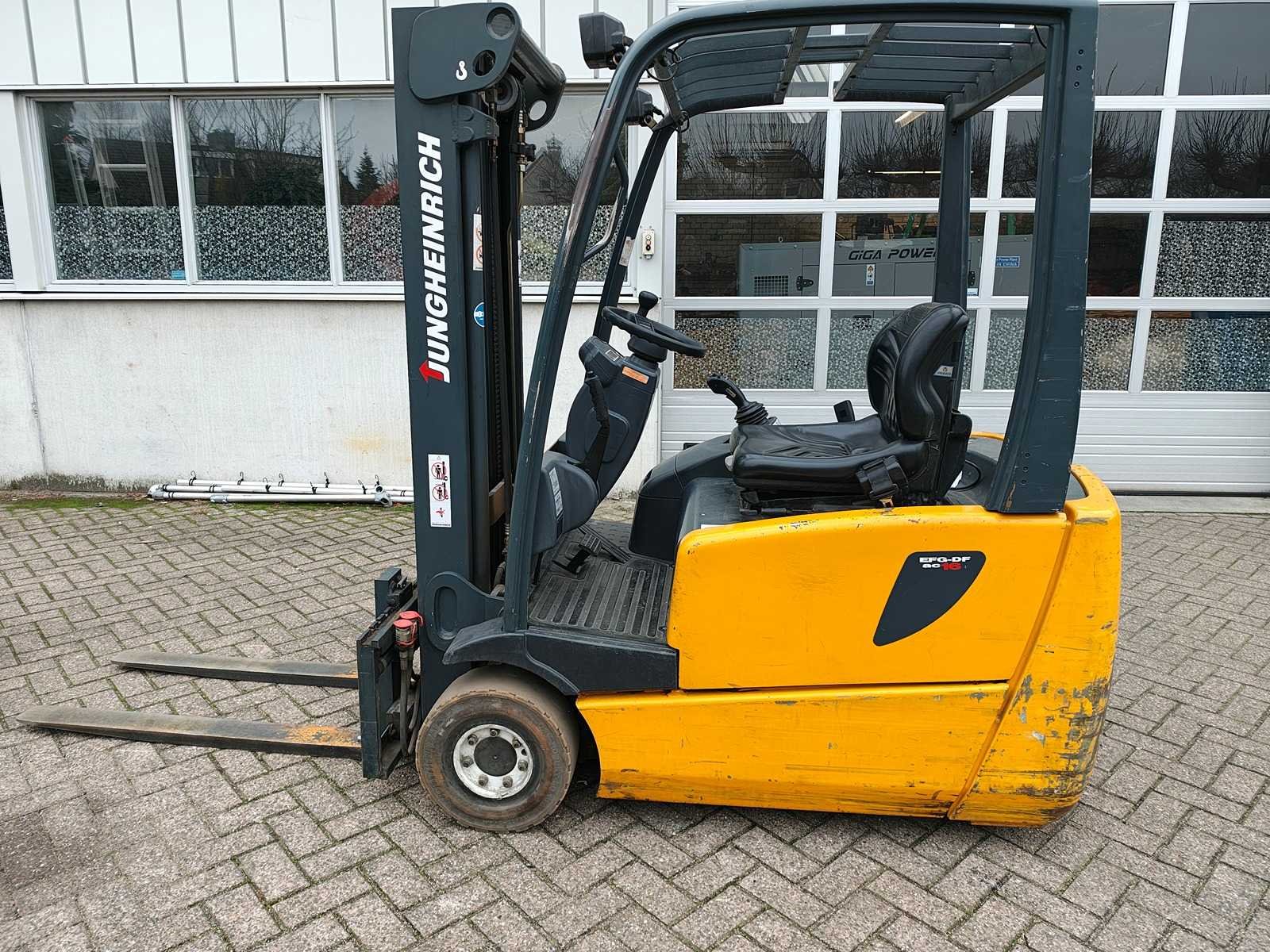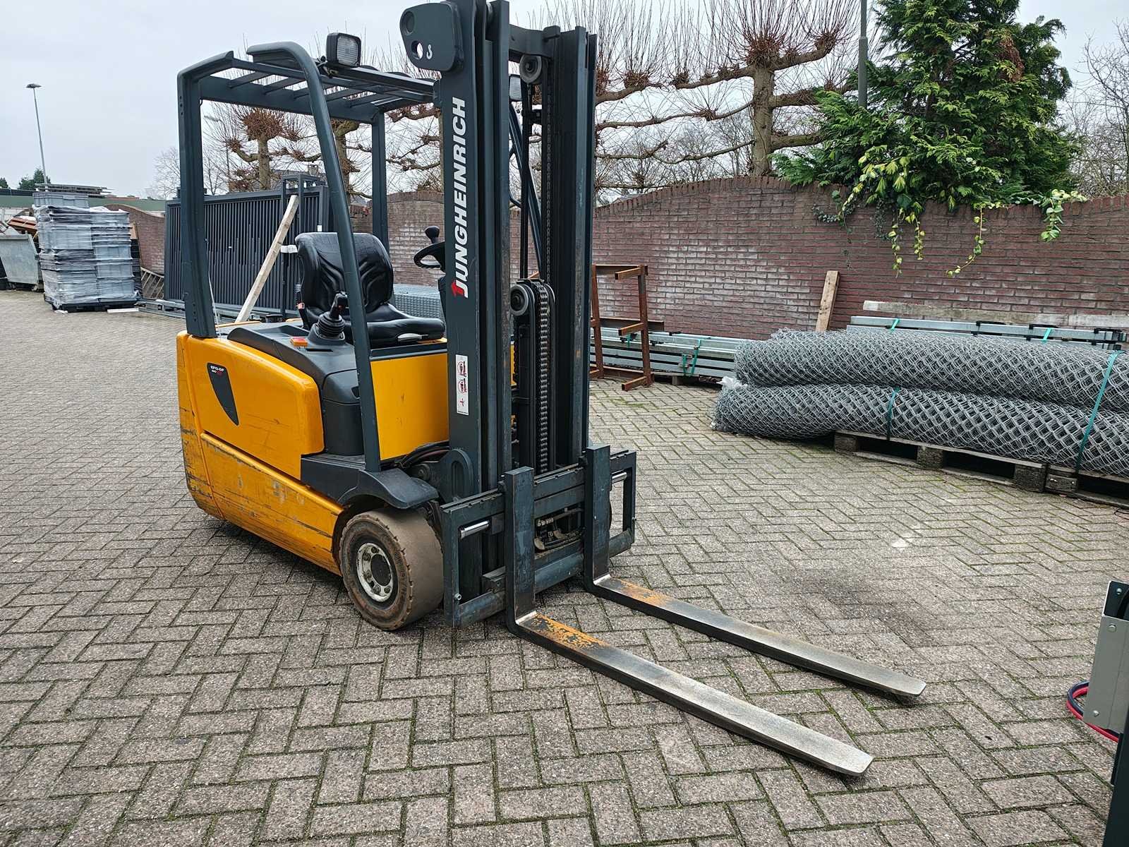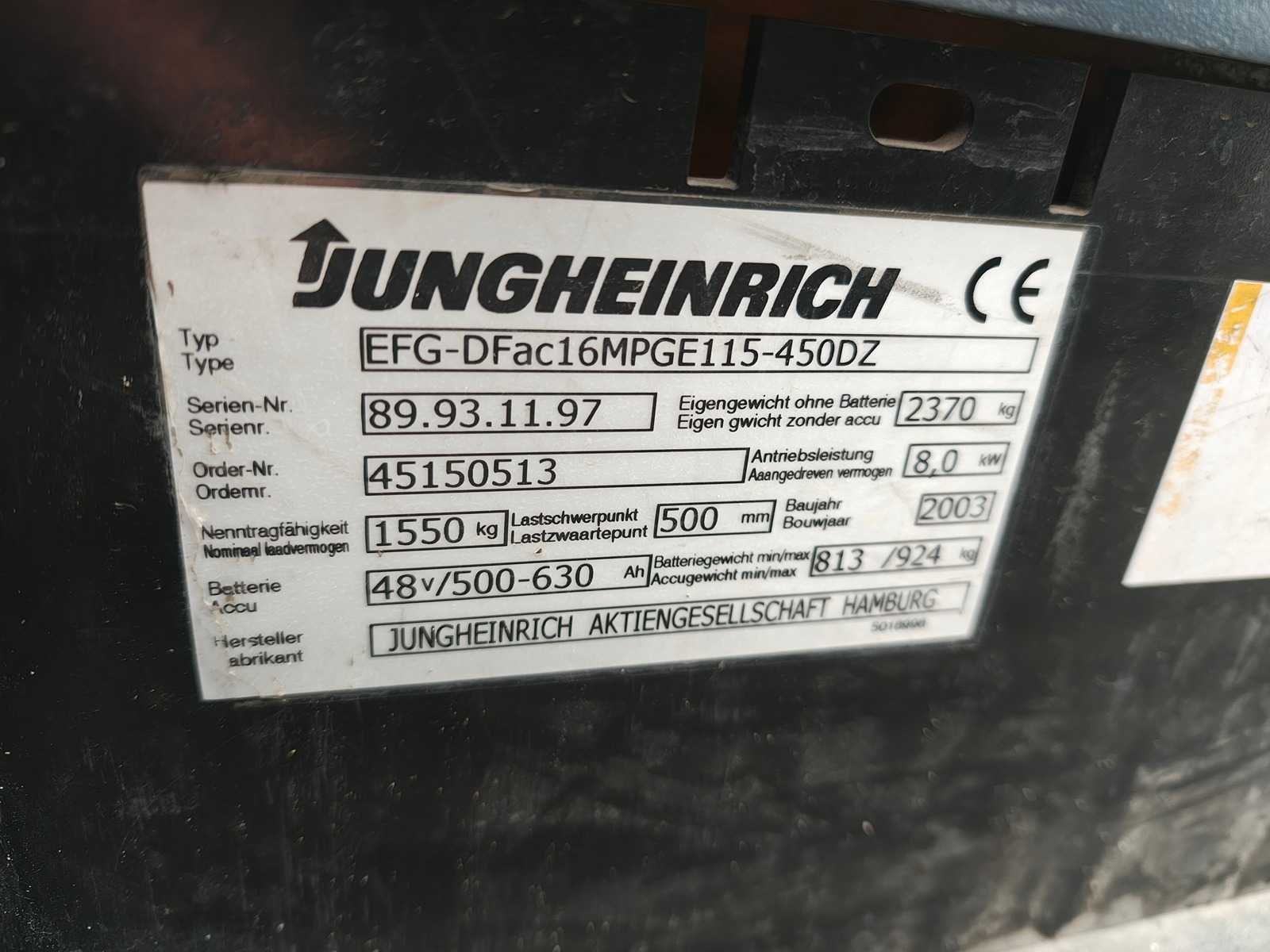 2370 kg zonder accu, gewicht accu 924kg, 48 volt, incl lader Nee Merk: Jungheinrich Type: AC16 Bouwjaar: 2003 Serienummer: 89.93.11.97 Brandstof: elektrisch Mast: triple Soort band: non marker Aantal wielen: 3 Afgelezen urenstand: 8594 Accu lader: true Free-lift: true Side-shift: true Triple mast: true Eigen gewicht: 2370kg Hefvermogen: 1550kg Lepellengte: 1100mm Max. hefhoogte: 4500mm Hefhoogte: 4500mm Vol rubber banden: true