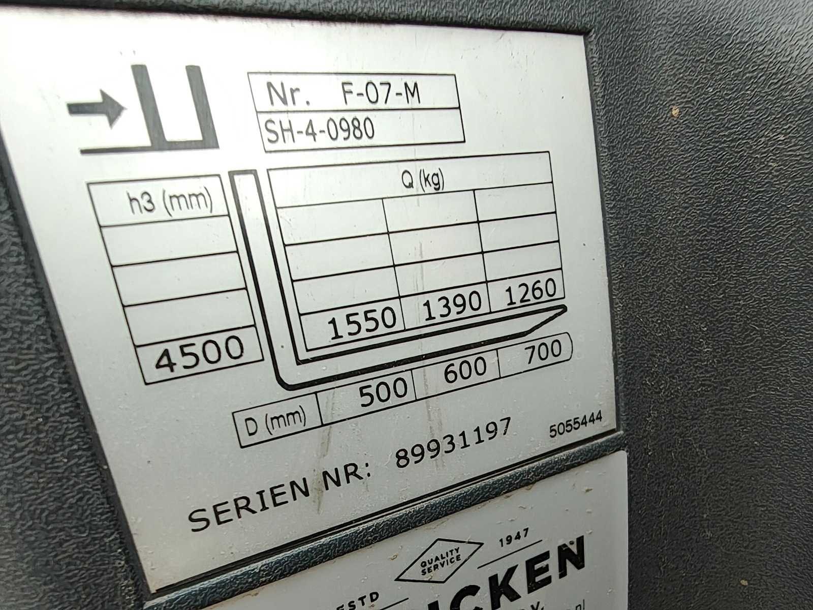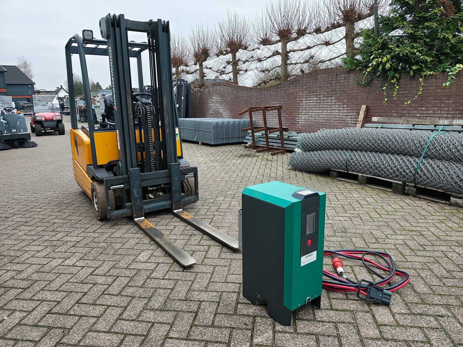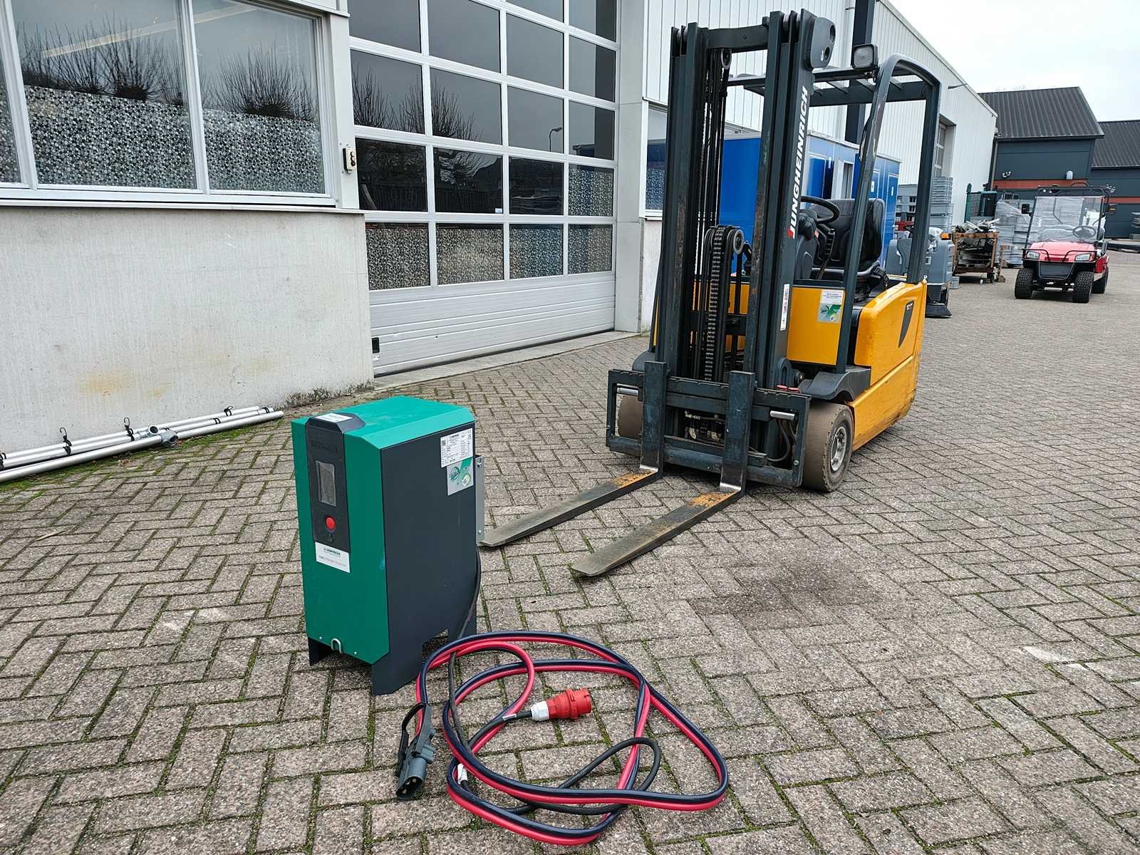 2370 kg zonder accu, gewicht accu 924kg, 48 volt, incl lader Nee Merk: Jungheinrich Type: AC16 Bouwjaar: 2003 Serienummer: 89.93.11.97 Brandstof: elektrisch Mast: triple Soort band: non marker Aantal wielen: 3 Afgelezen urenstand: 8594 Accu lader: true Free-lift: true Side-shift: true Triple mast: true Eigen gewicht: 2370kg Hefvermogen: 1550kg Lepellengte: 1100mm Max. hefhoogte: 4500mm Hefhoogte: 4500mm Vol rubber banden: true