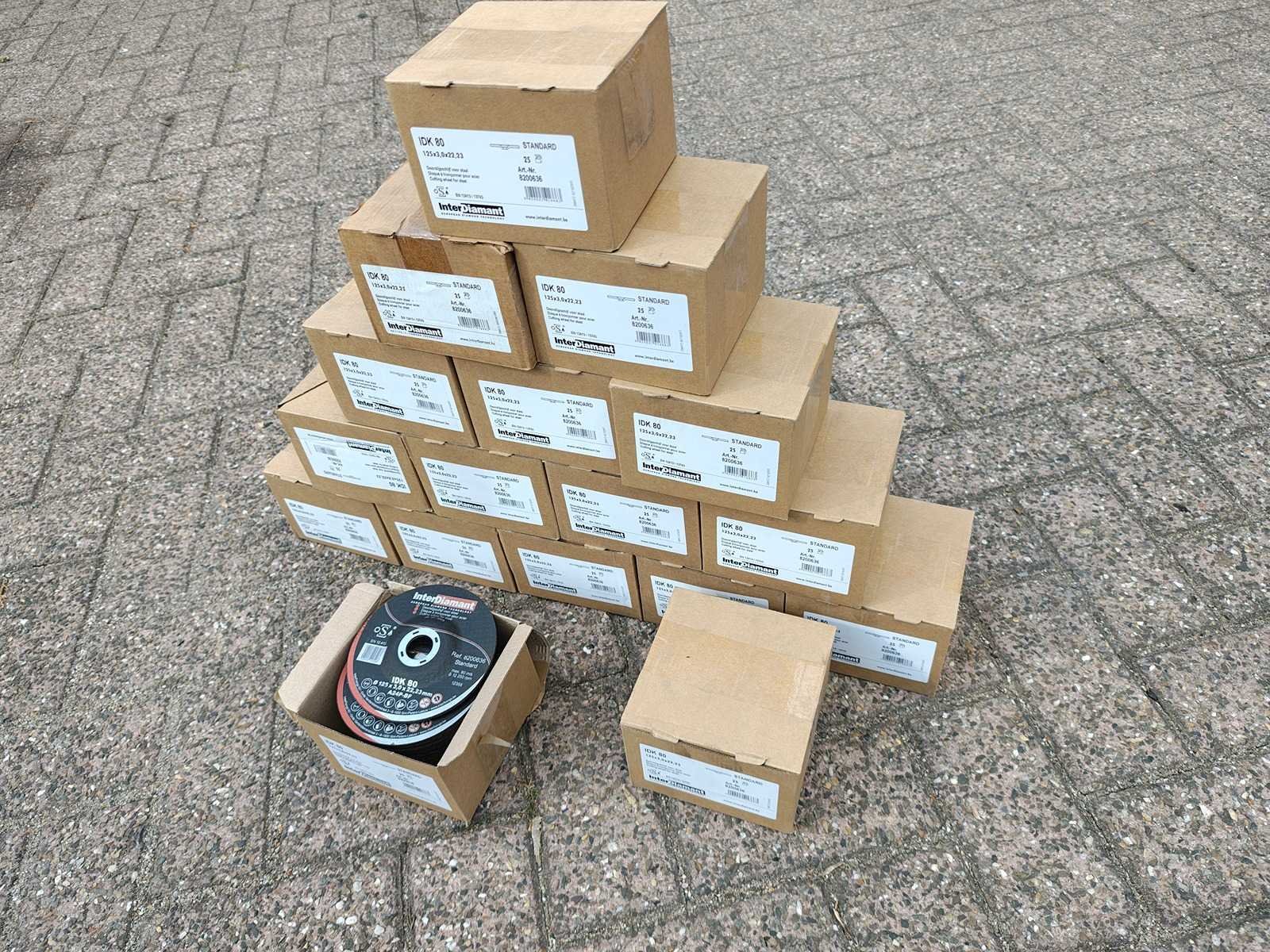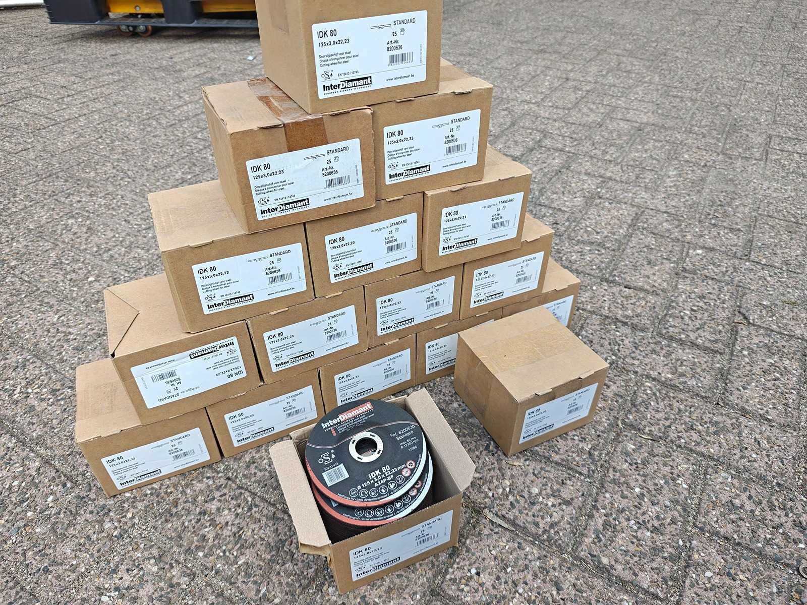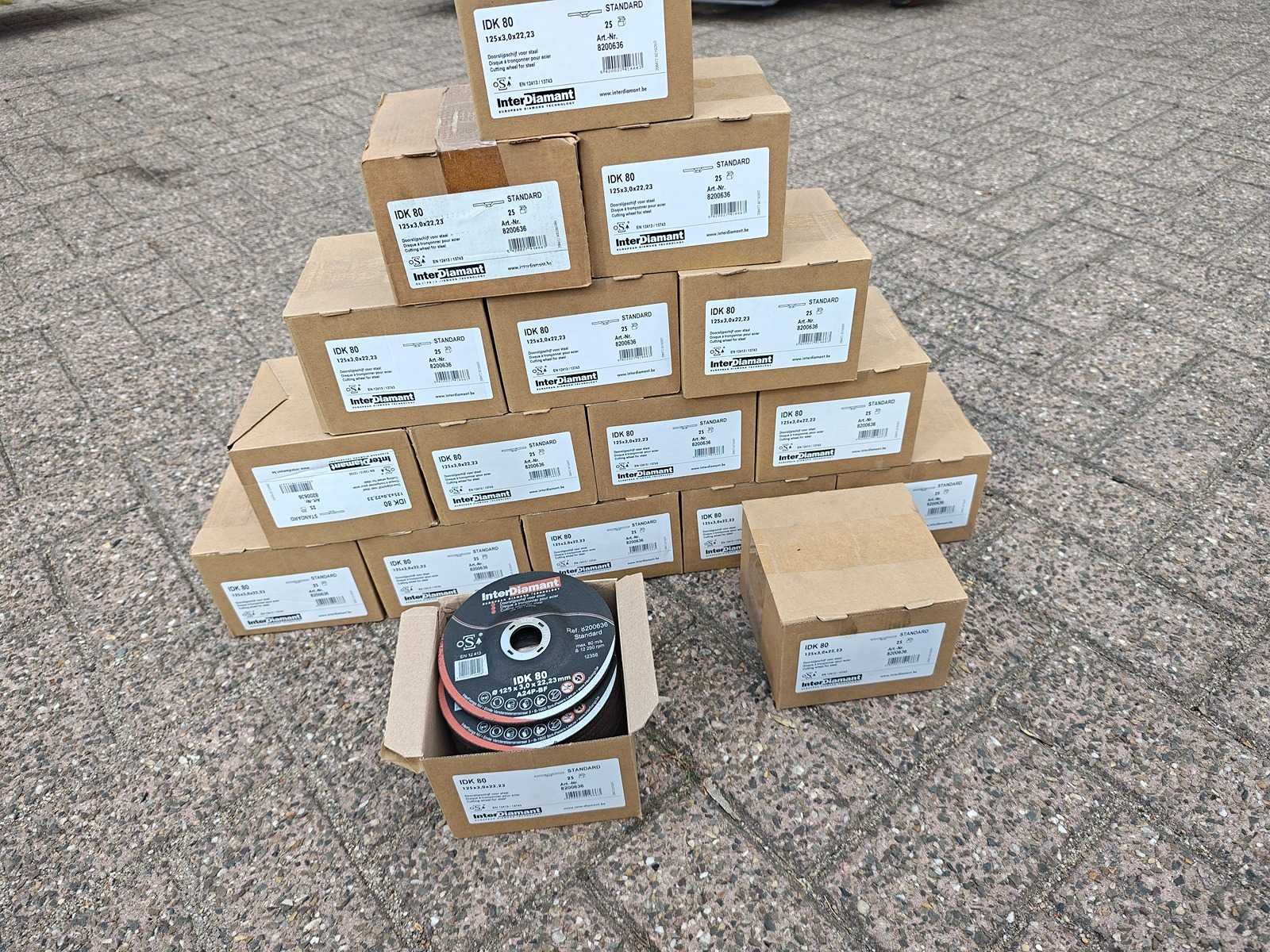 Partij van 425 doorslijpschijven 125x3x22.23mm, geschikt voor staal. ongebruikt Nee Merk: Interdiamant Model: IDK80 Schijfdiameter: 125mm Dikte: 3mm