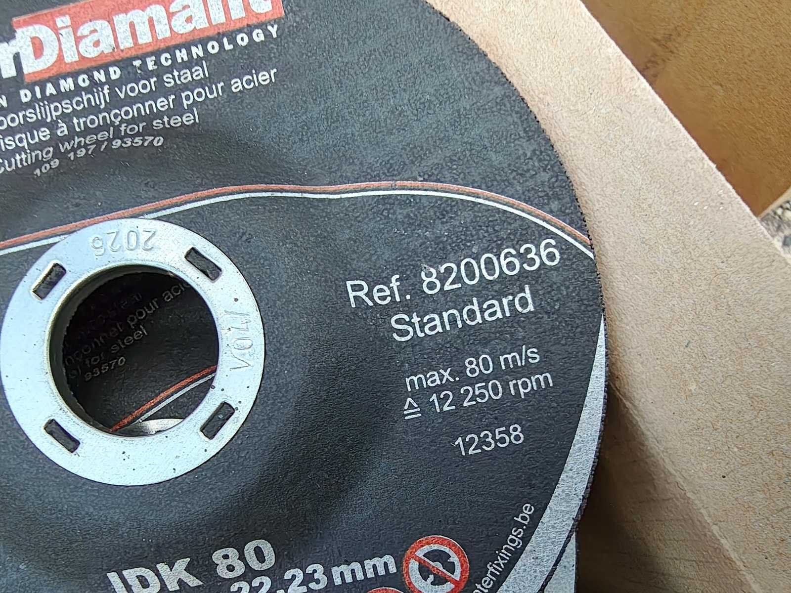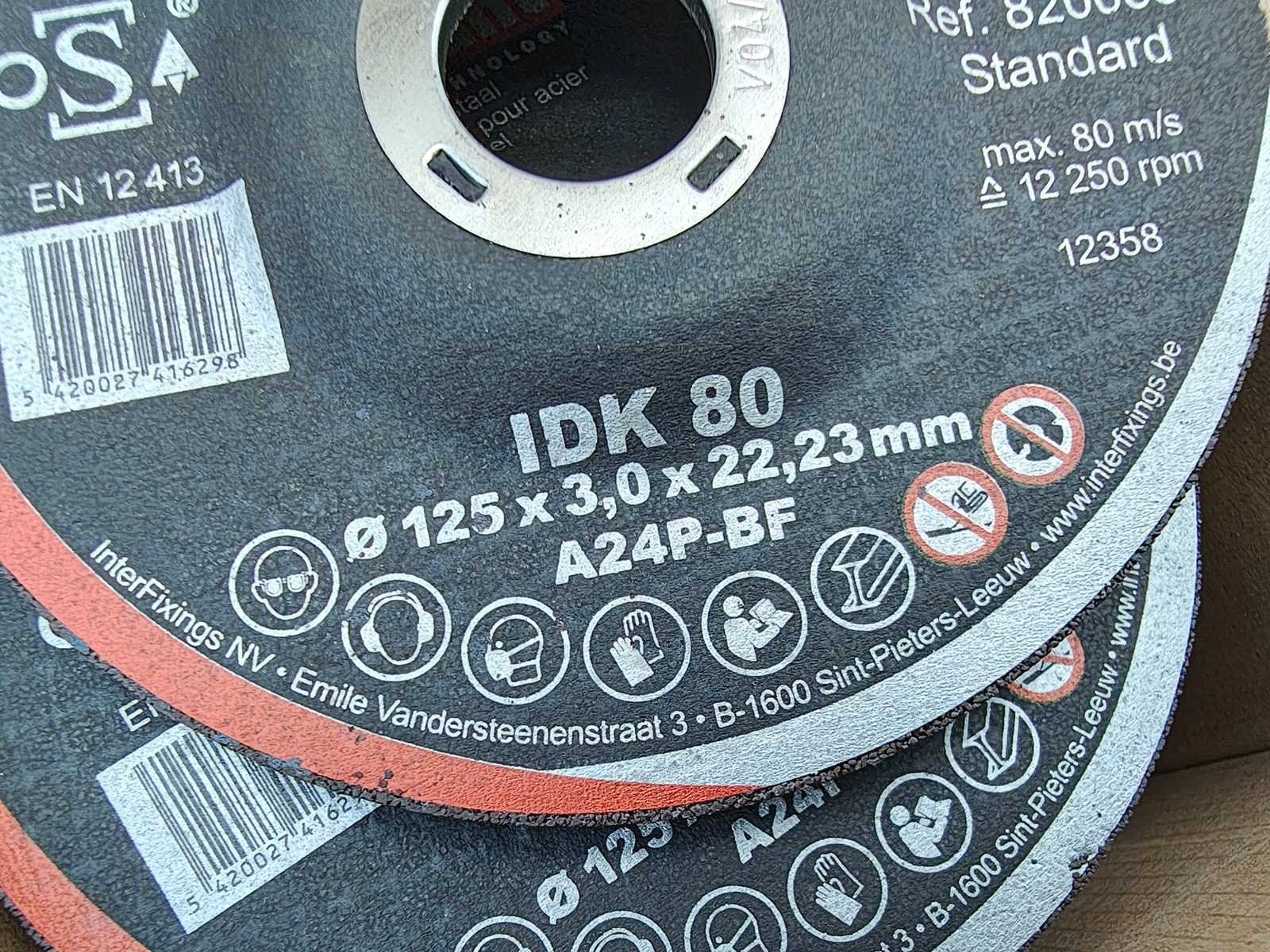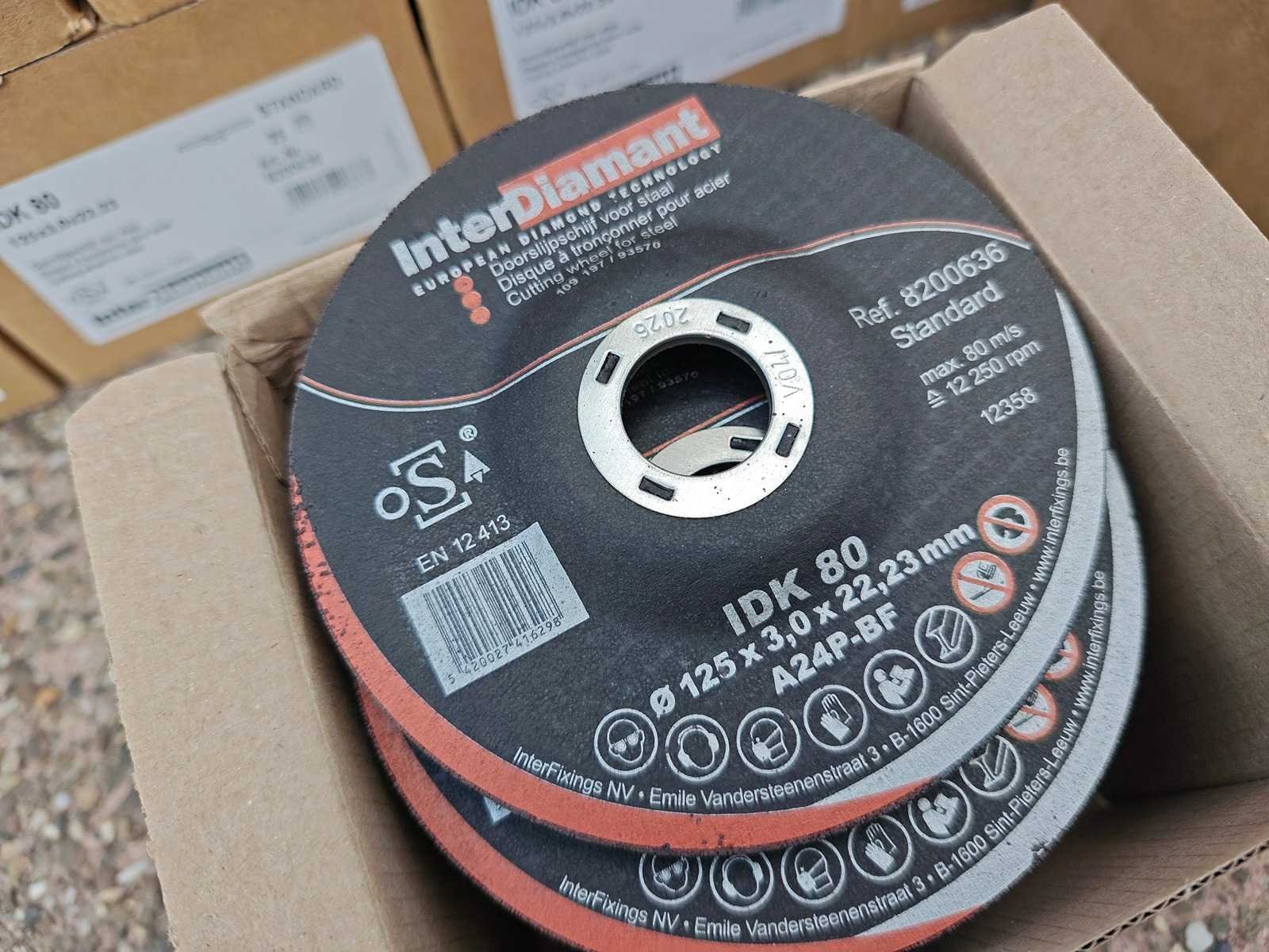 Partij van 425 doorslijpschijven 125x3x22.23mm, geschikt voor staal. ongebruikt Nee Merk: Interdiamant Model: IDK80 Schijfdiameter: 125mm Dikte: 3mm