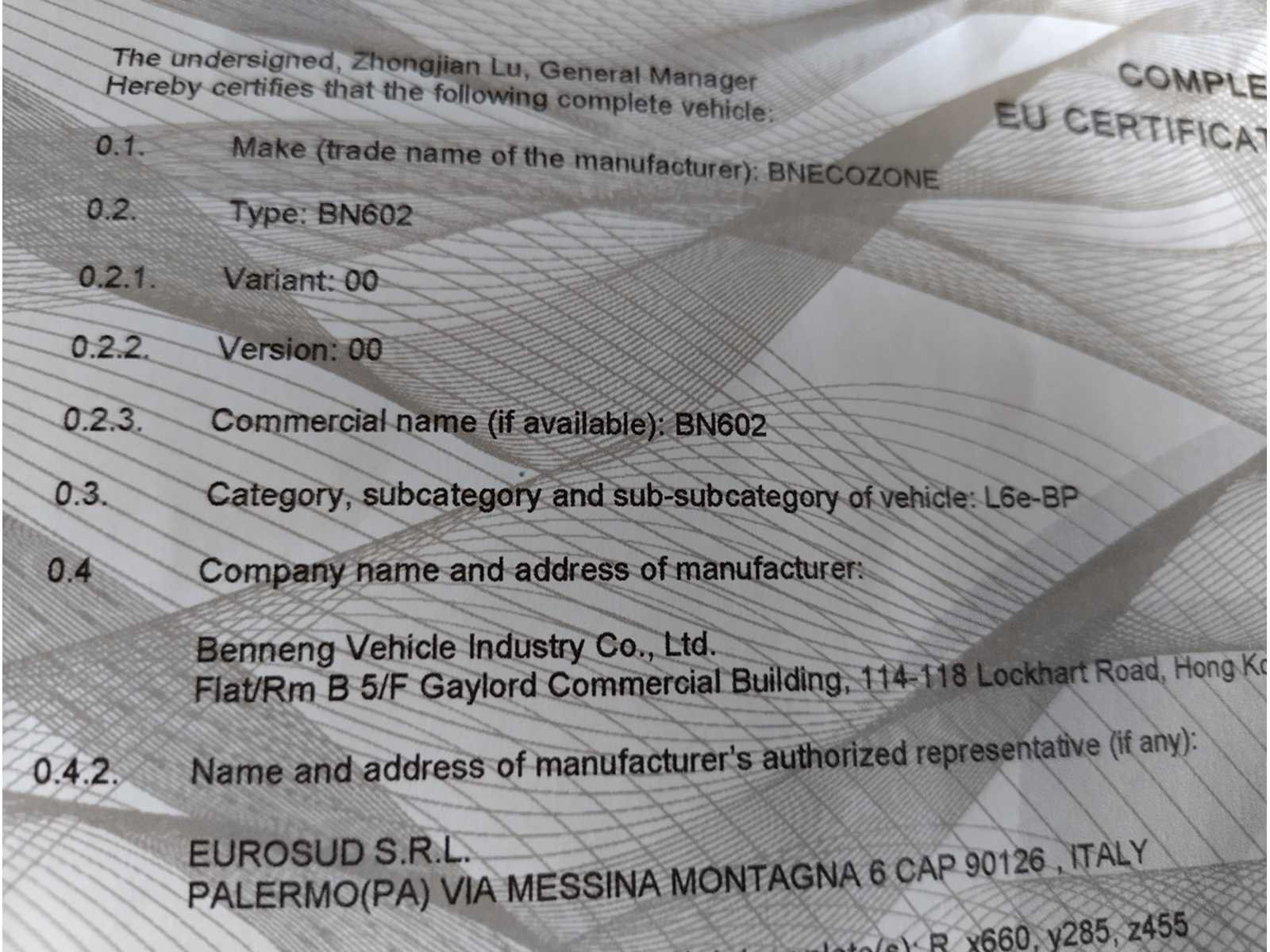 Voorzien van: documentatie (COC voor kenteken inschrijving), 4.00-10 banden afmetingen: 2483x1320x1626mm, max snelheid 45 km/h, 3.00Kw motor, automaat versnellingsbak, actieradius: max 70 kilometer, digitaal display, 2-persoons cabine, verlichting, ongebruikt Nee Merk: Bnecozone Type: BN602 Bouwjaar: 2024 Chassisnummer: R3C602005R1000014 Ledig gewicht: 480kg