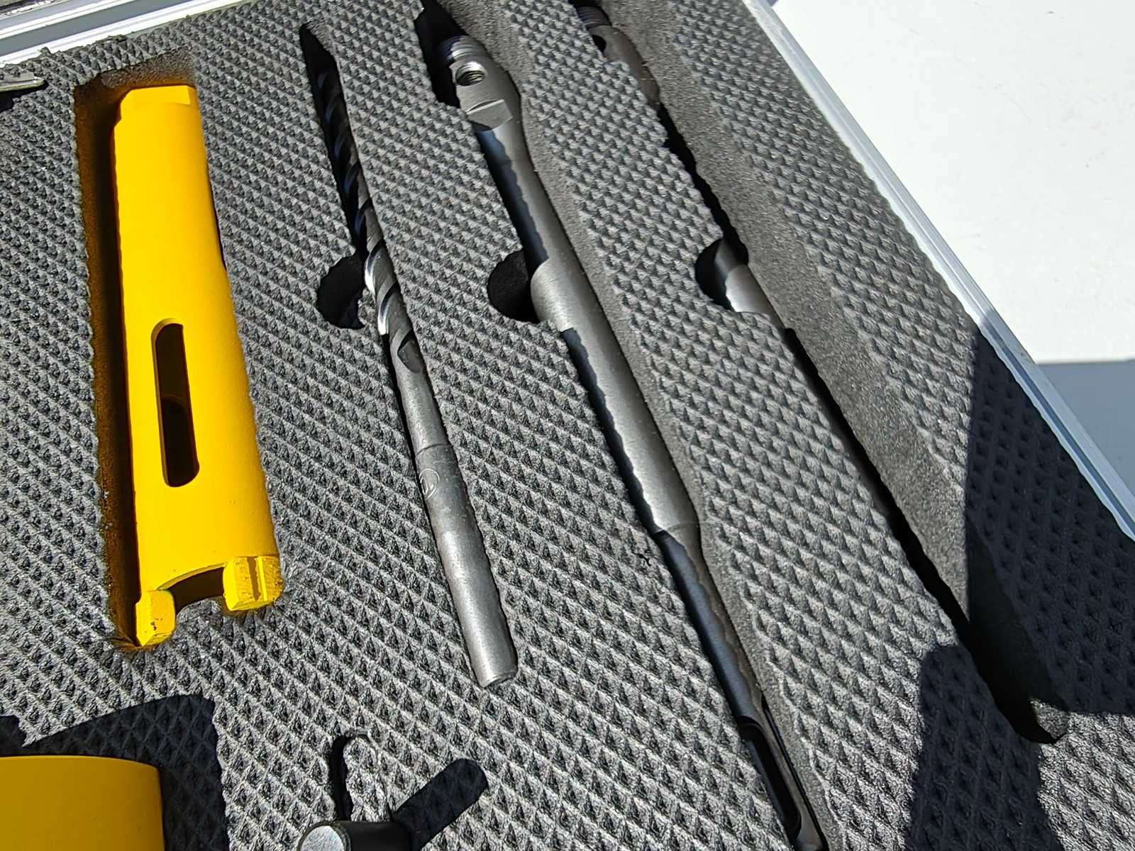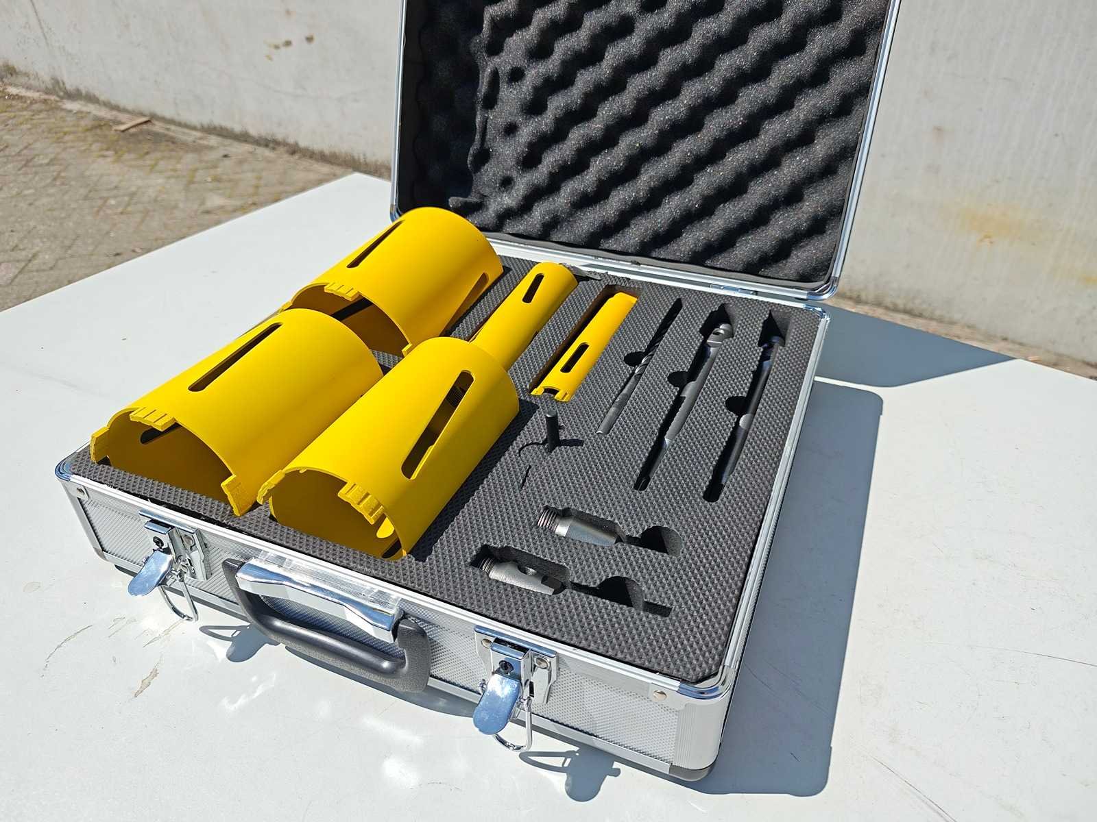5 kernboren (38, 52, 91, 117 en 127 mm) allen 170mm lang, 2 x korte en 2 x lange ashalzen (SDS-Plus en zeskant), geleideboor en uitwerpstift. De set wordt geleverd in een aluminium koffer Nee Merk: VDT Type: 11 delig Bouwjaar: 2025 Delig: 11 SDS fitting: true