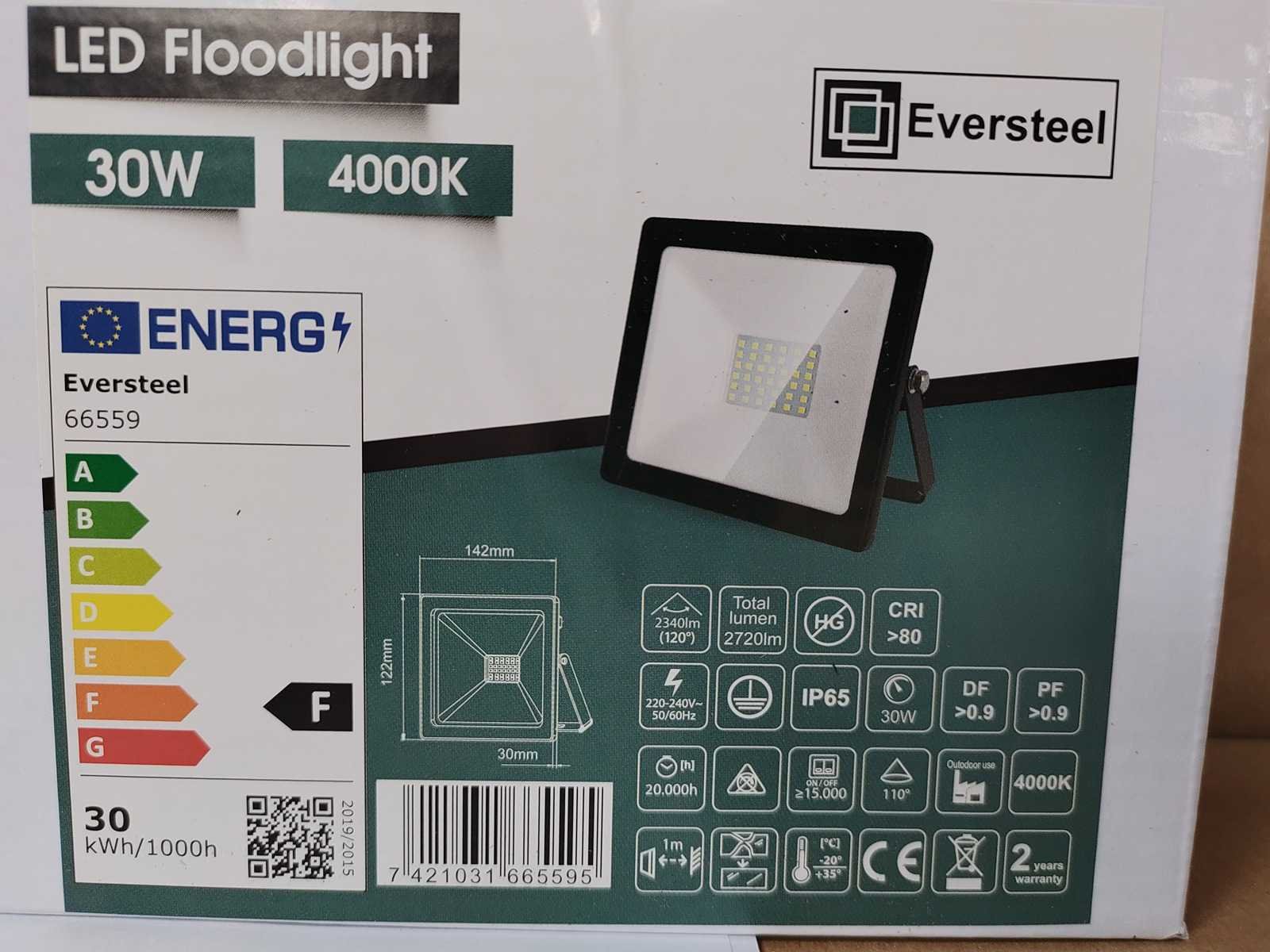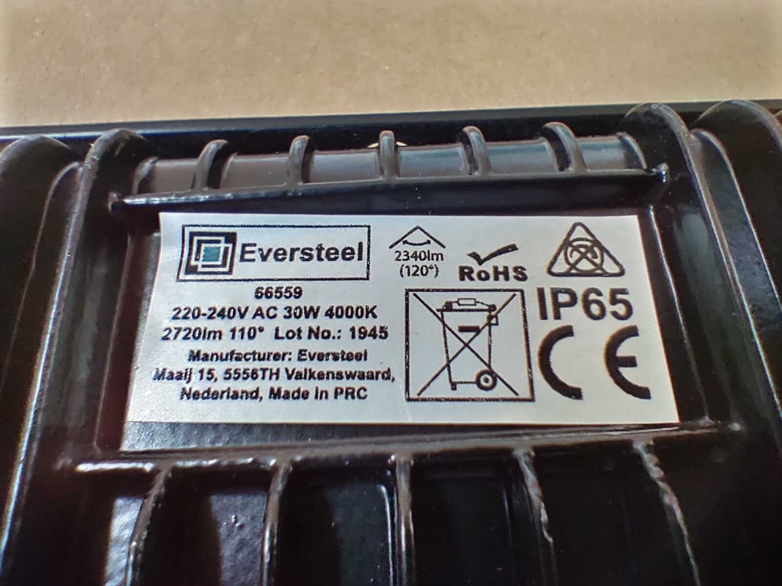 LED Breedstraler 30 watt, 2720 lumen, 4000K, IP65, geschikt voor buiten, branduren 20000 uur, geschikt voor meer dan 15.000 schakelingen on-off, in doos Nee Merk: Eversteel Model: Eversteel LED breedstraler 30 watt Product type: LED Kleur: grijs