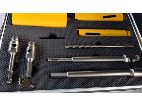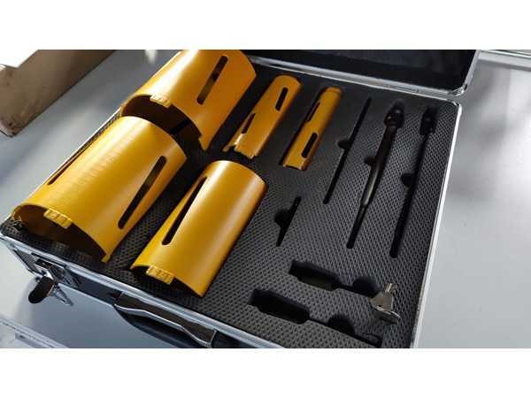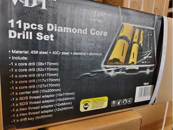 Kernborenset bestaat uit ‘Heavy-Duty’ stalen boren met diamant snijsegmenten. Voor het droog boren van nauwkeurige gaten in beton. Te gebruiken op boormachines met een veiligheidskoppeling. 5 kernboren (38, 52, 91, 117 en 127 mm) allen 170mm lang, 2 x korte en 2 x lange ashalzen (SDS-Plus en zeskant), geleideboor en uitwerpstift. De set wordt geleverd in een aluminium koffer. Nee Merk: VDT Type: kernboren diamant Bouwjaar: 2025 Delig: 11 SDS fitting: true Beton: true