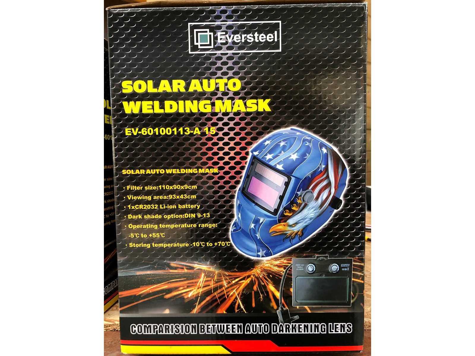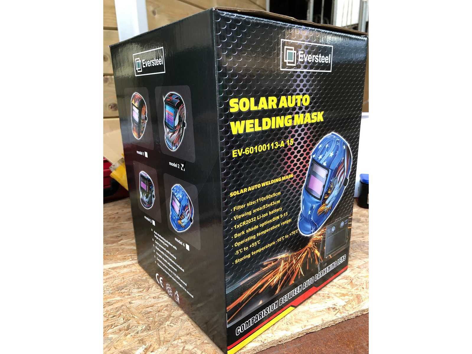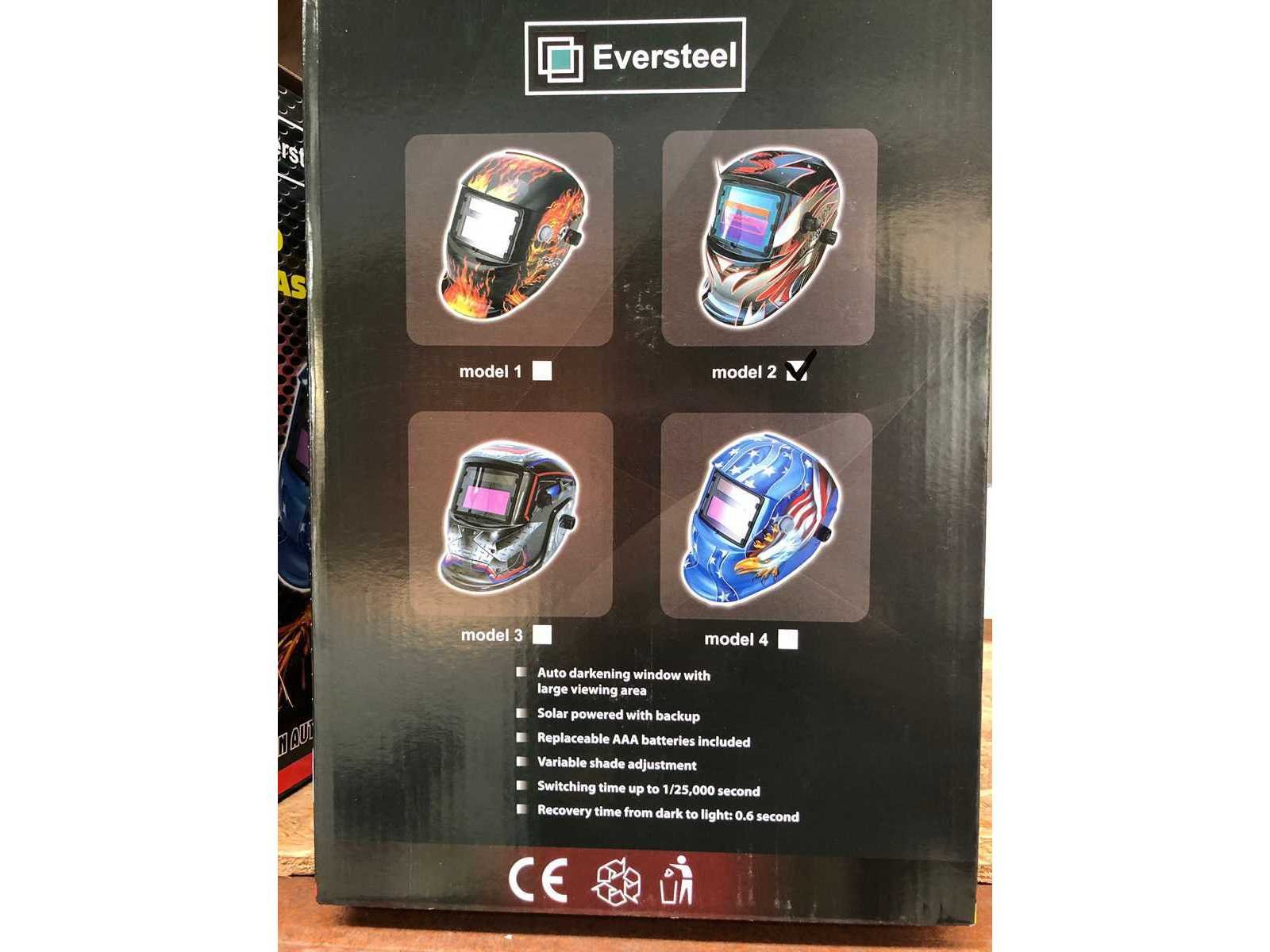 Lashelm model 2. Deze automatische laskap is geschikt voor alle las processen. Kijkvenster afmeting circa 93x43 mm met UV- en IR-bescherming. Schakelt automatisch uit. Verduisteringsgraad traploos vanaf de buitenkant instelbaar van DIN 9 - 13. Inschakelsnelheid filter: 1/25000 seconde, van licht naar donker. Reactie tijd filter 0.6 seconde, van donker naar licht. Volledig verstelbaar hoofdstel met wasbare zweetband. Werkt op zonnecellen en indien nodig op AAA batterijen, levensduur batterij circa 4000 uur, inclusief AAA batterijen. CE gekeurd. Nee Merk: Eversteel Type: Model 2 Bouwjaar: 2024