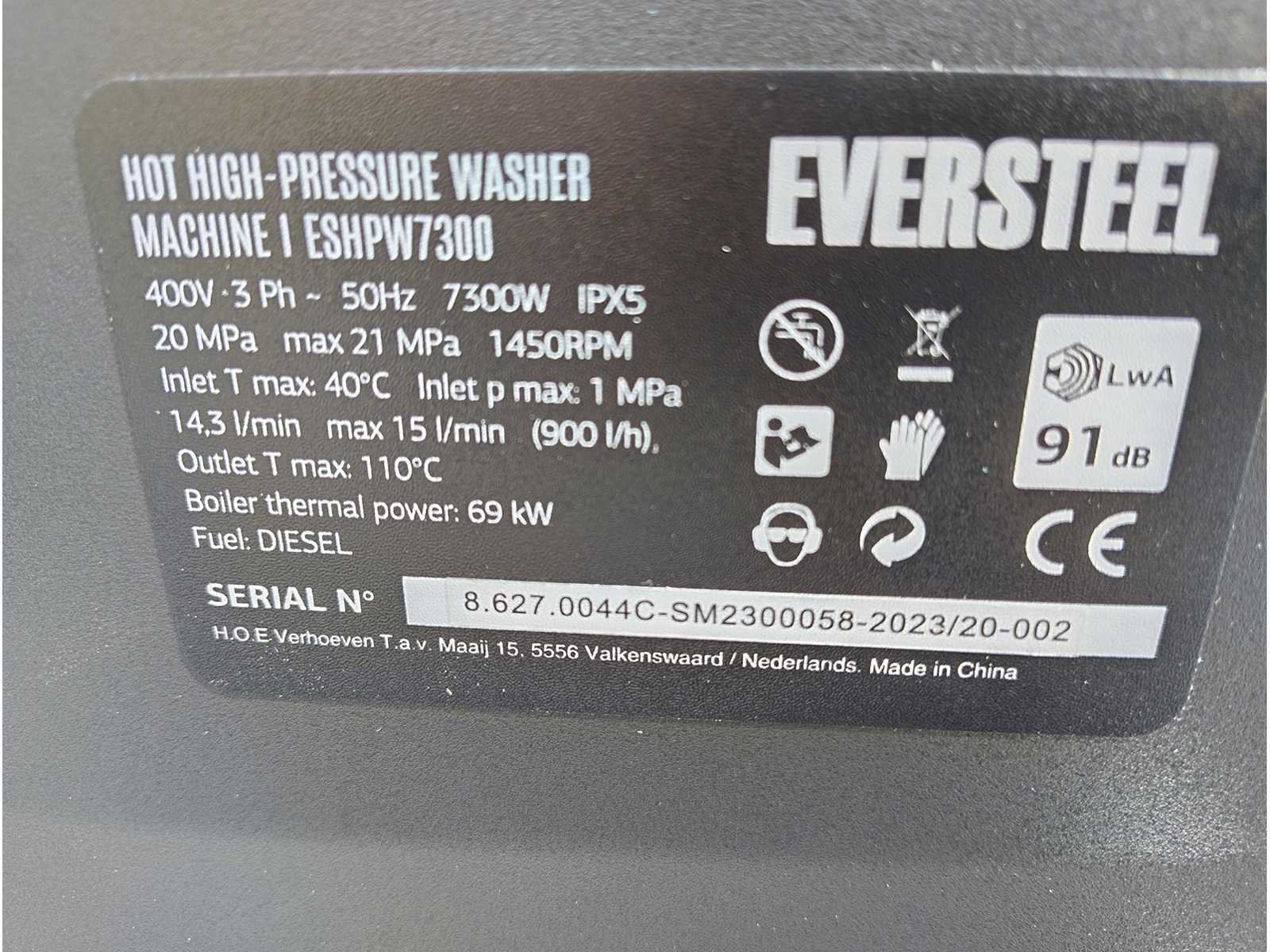 Diesel hogedruk stoomreiniger professioneel, incl. 10 meter hogedrukslang en spuitlans, vloeistof aanzuiging voor reinigingsproducten, waterfilter, dieseltank voor verwarming 10 liter inhoud, 2 zwenkwielen en 2x vaste wielen, 5 polig 16 Amp industriestekker 380 volt, 7300 watt, 69 KW verwarming vermogen. tot 110 graden. in krat Nee Merk: Eversteel Type: ESHPW7300 Bouwjaar: 2025 Serienummer: 8.627.0044C-SM2300058-2023/20-002 Maximale werkdruk: 210bar Temperatuurbereik max.: 110°c Capaciteit.: 900l/hr Dieselgestookt: true Mobiel: true Vermogen: 7.3kW Aansluiting: 380V Eigen gewicht: 154kg Totale afmeting L: 1000mm Totale afmeting Breedte: 740mm Totale afmeting Hoogte: 850mm