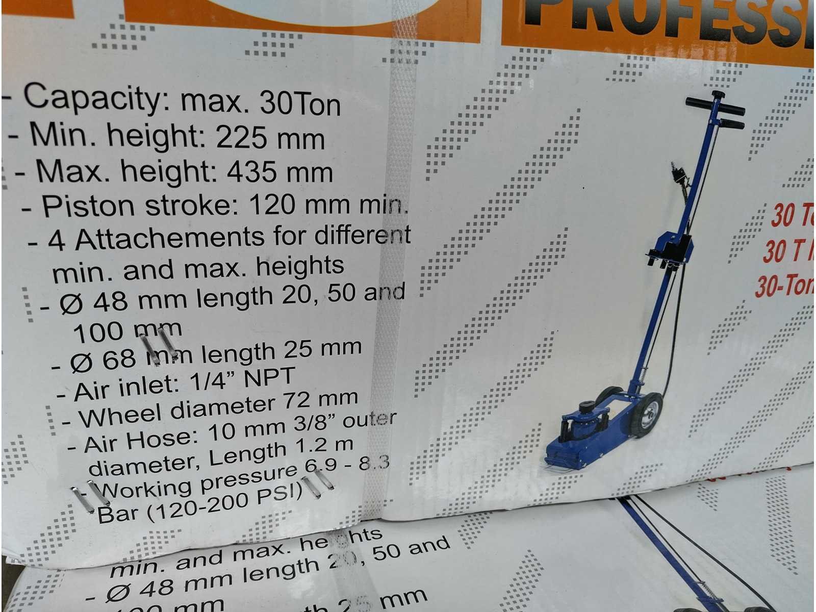 Pneumatisch aangedreven hydraulische krik met 30 ton hefvermogen, incl adapters. in doos Nee Merk: Stahlkaiser Type: hydraulisch Bouwjaar: 2025 Capaciteit.: 30t